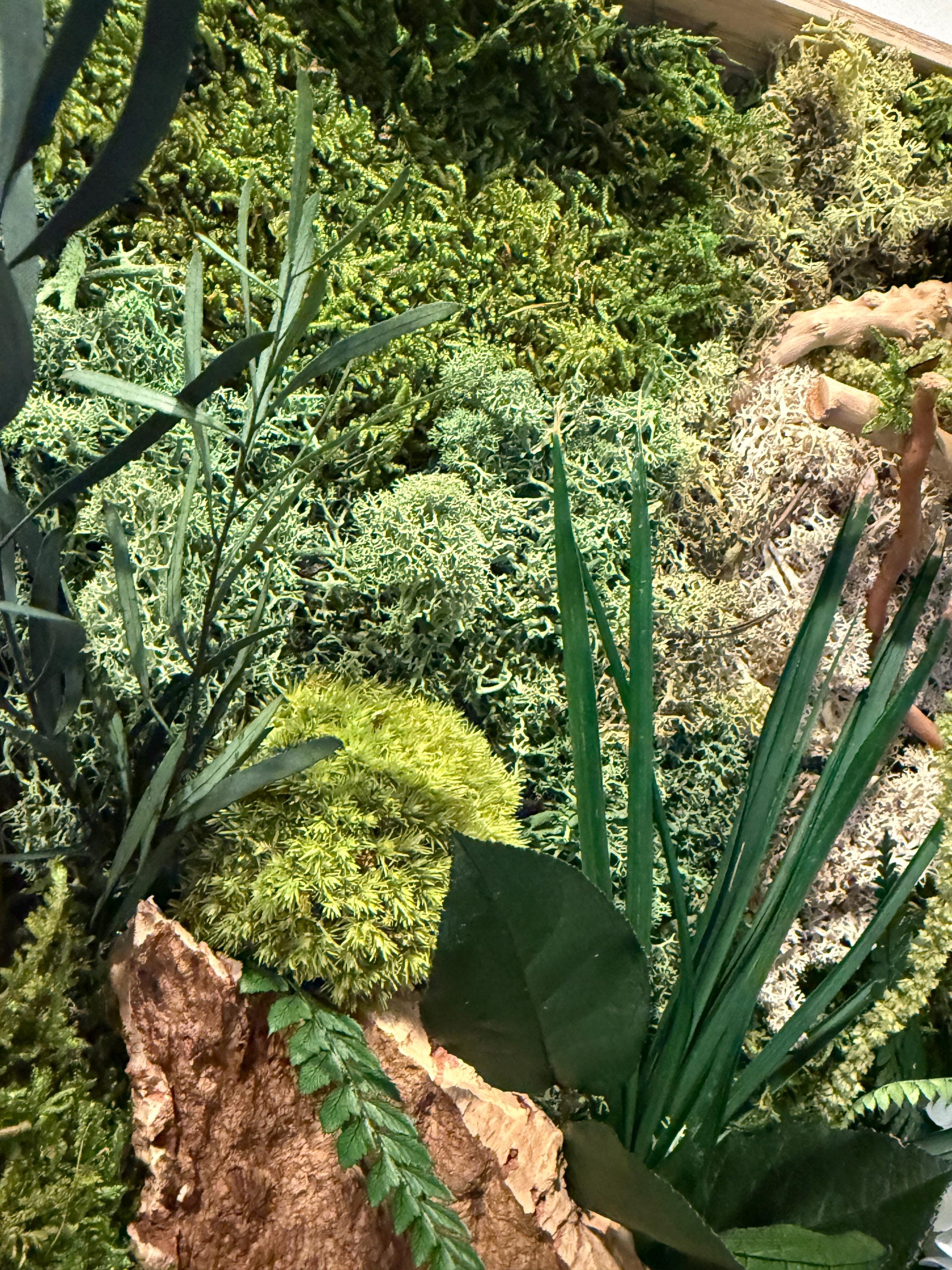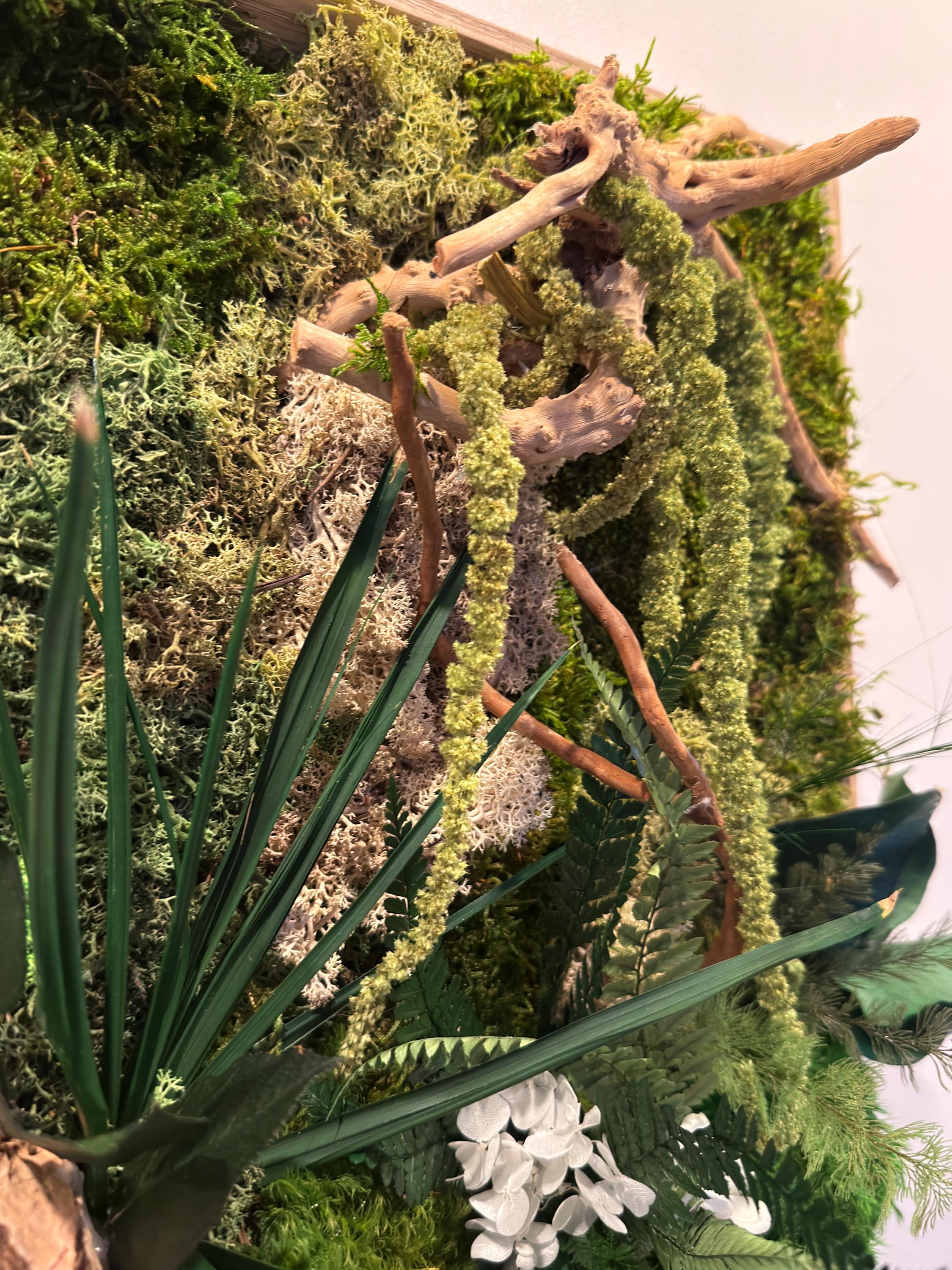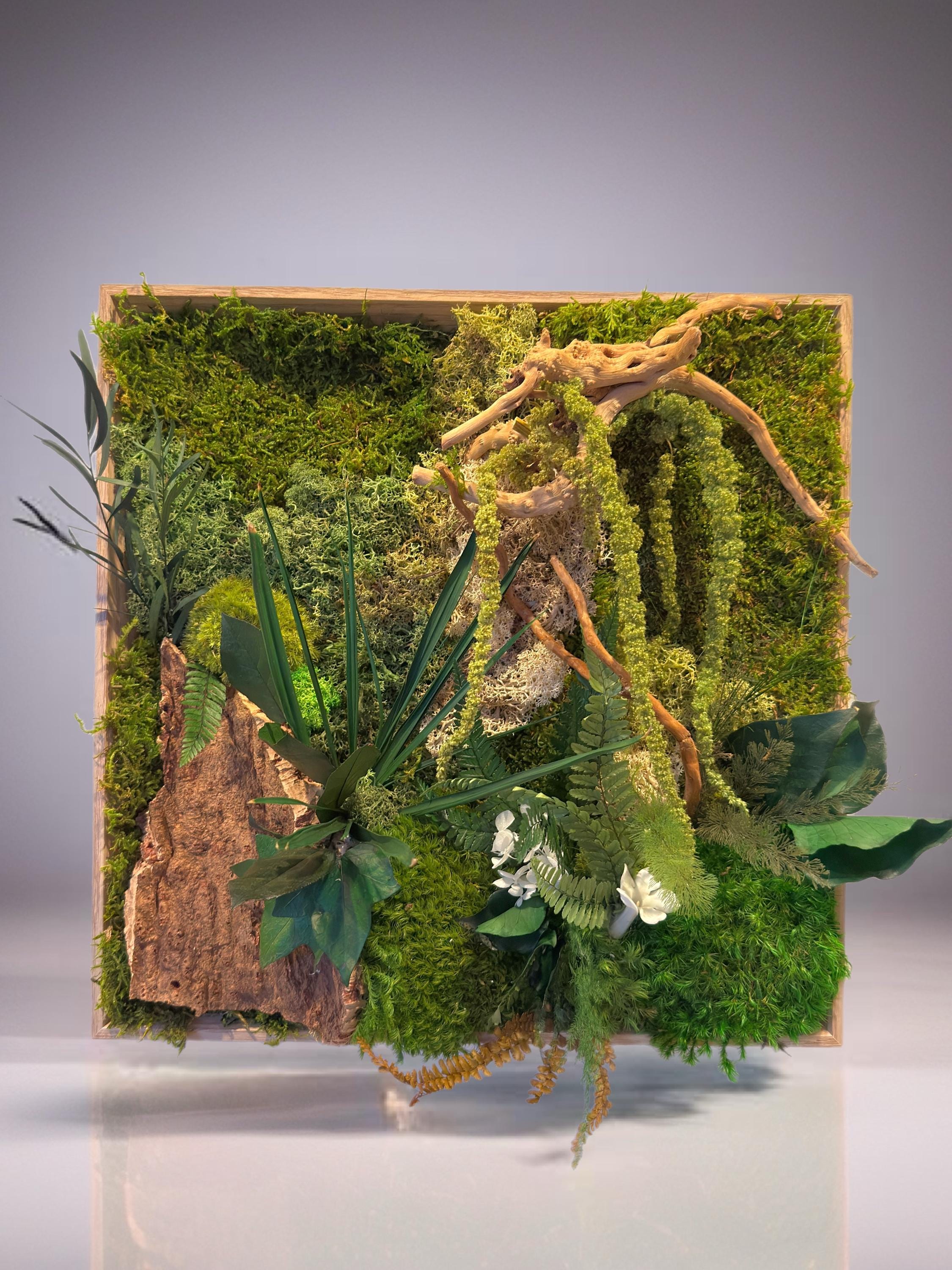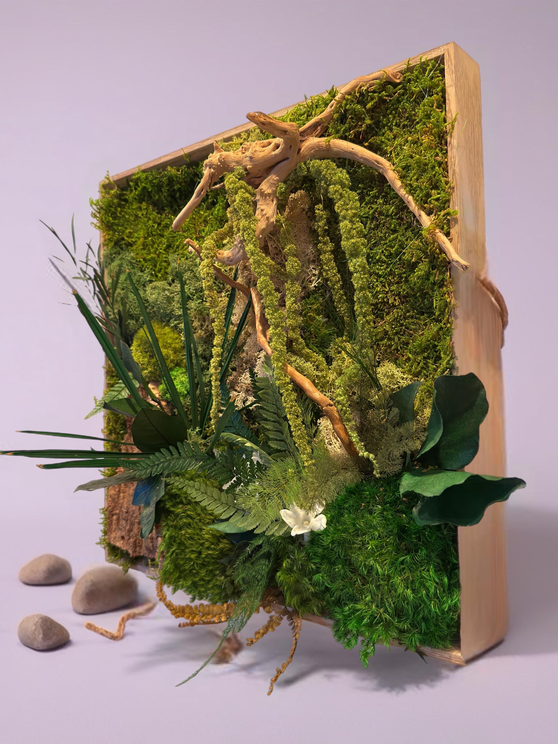 Composé de mousses stabilisées, écorce naturelle de liège, bois flotté et feuillages préservés, il évoque un coin de forêt miniature où chaque détail respire la sérénité.