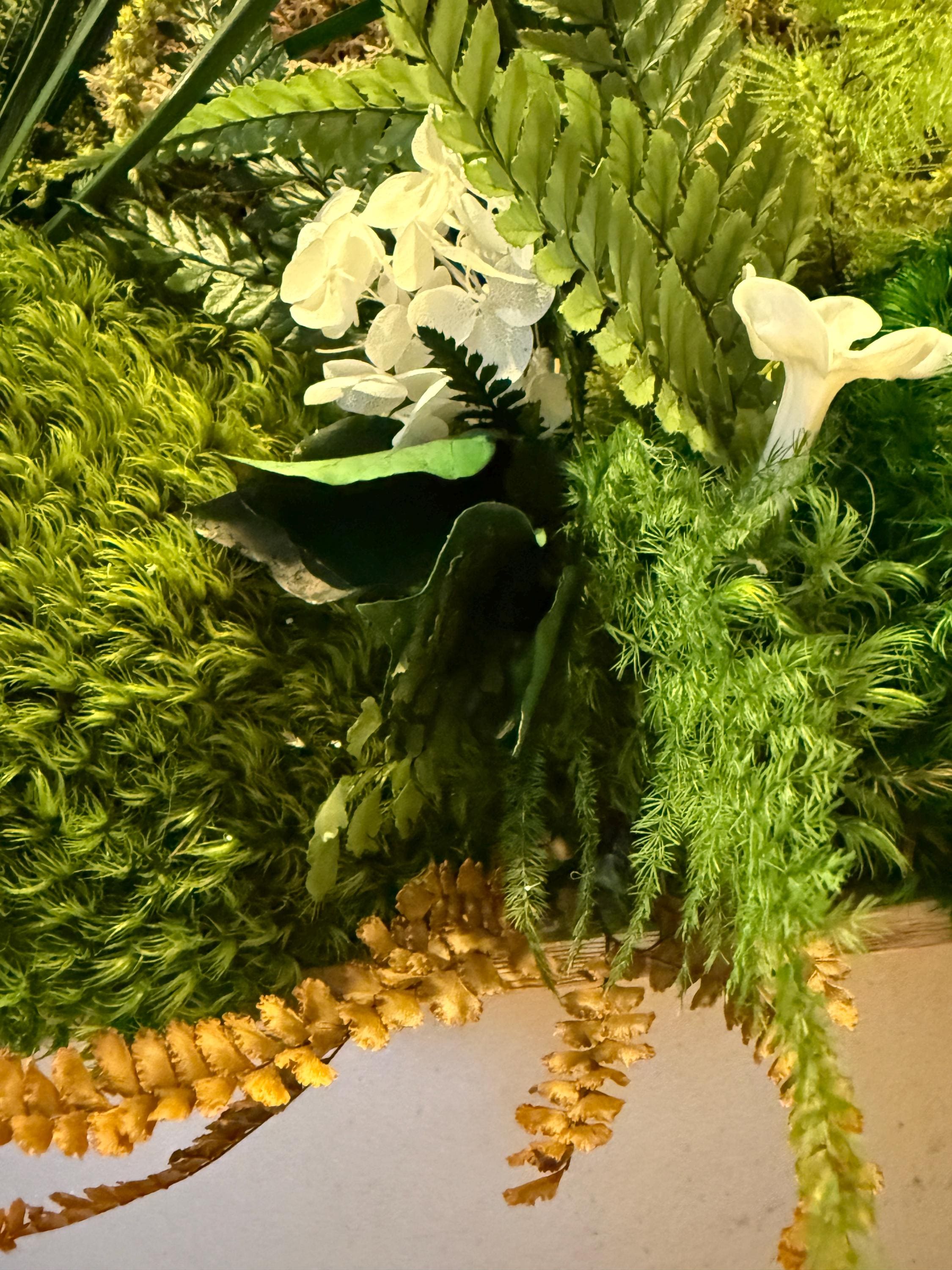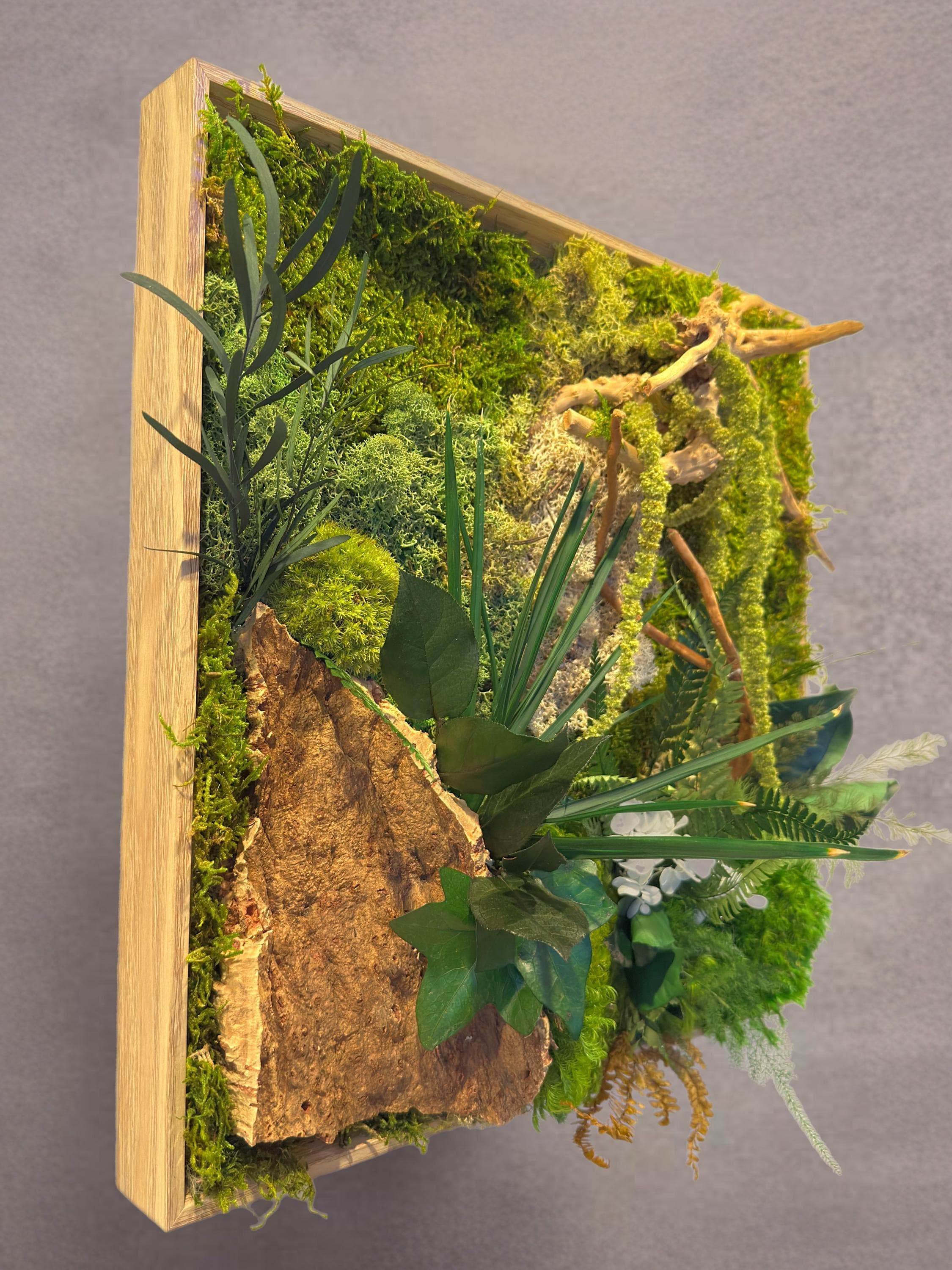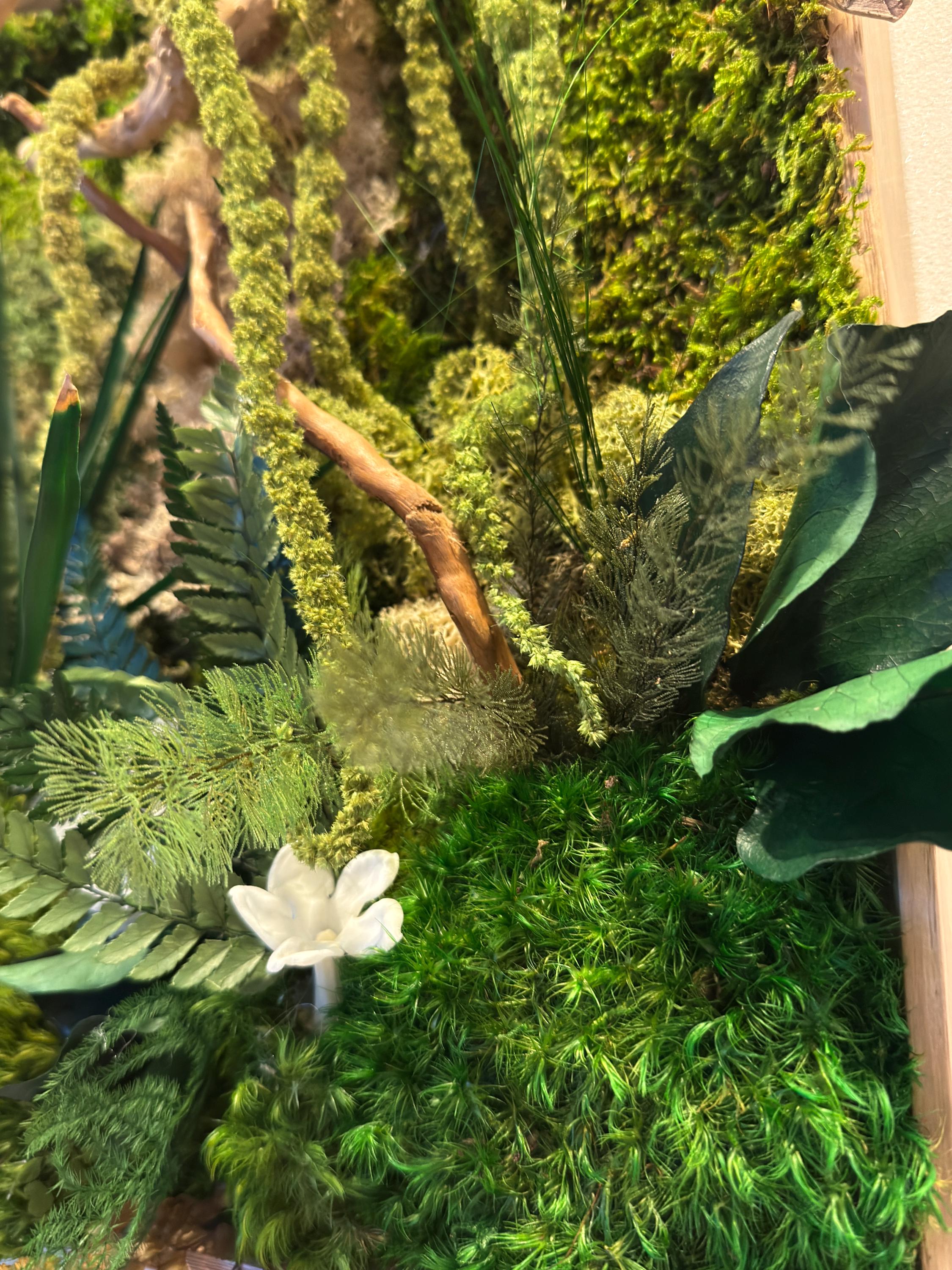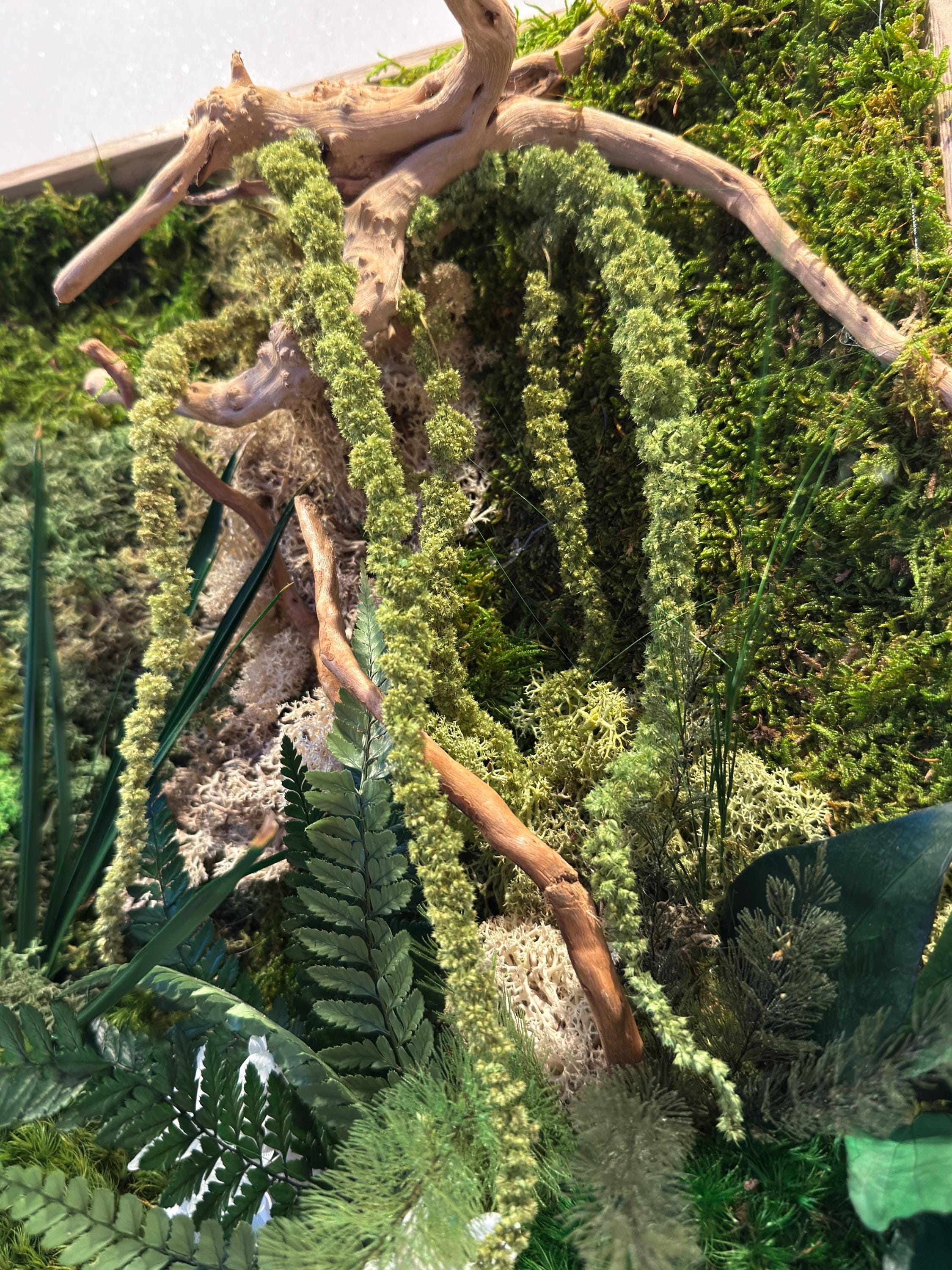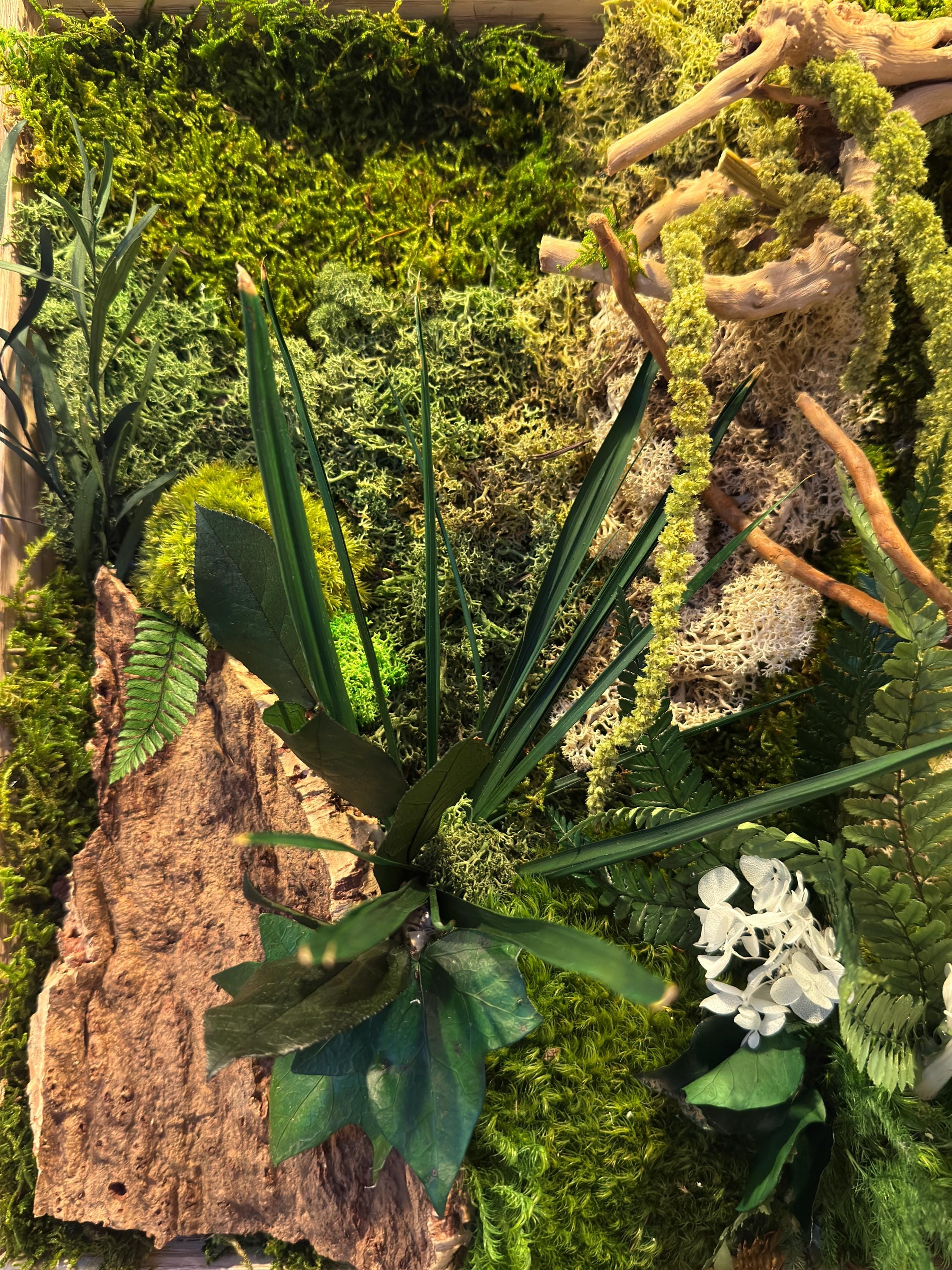 Composé de mousses stabilisées, écorce naturelle de liège, bois flotté et feuillages préservés, il évoque un coin de forêt miniature où chaque détail respire la sérénité.