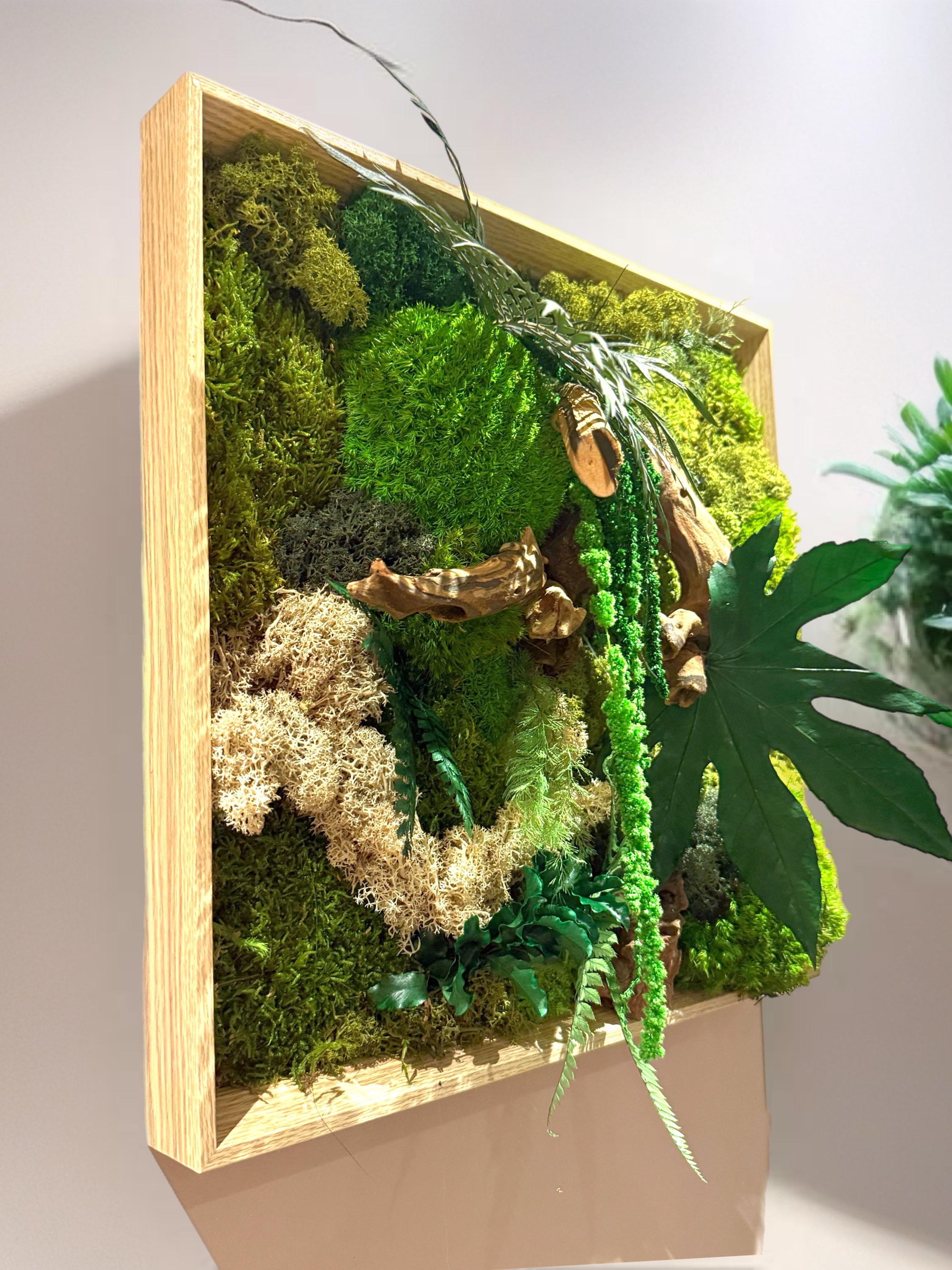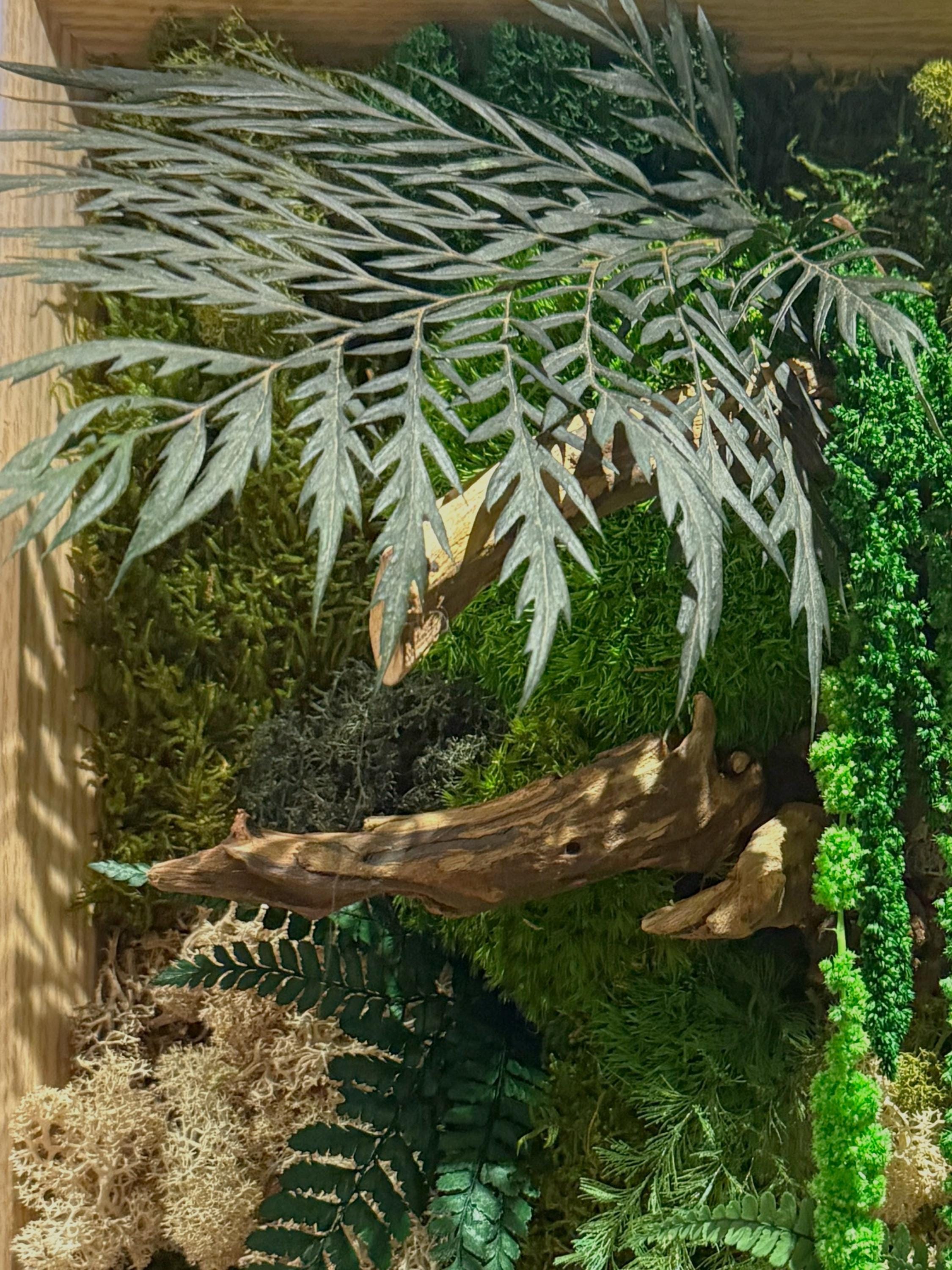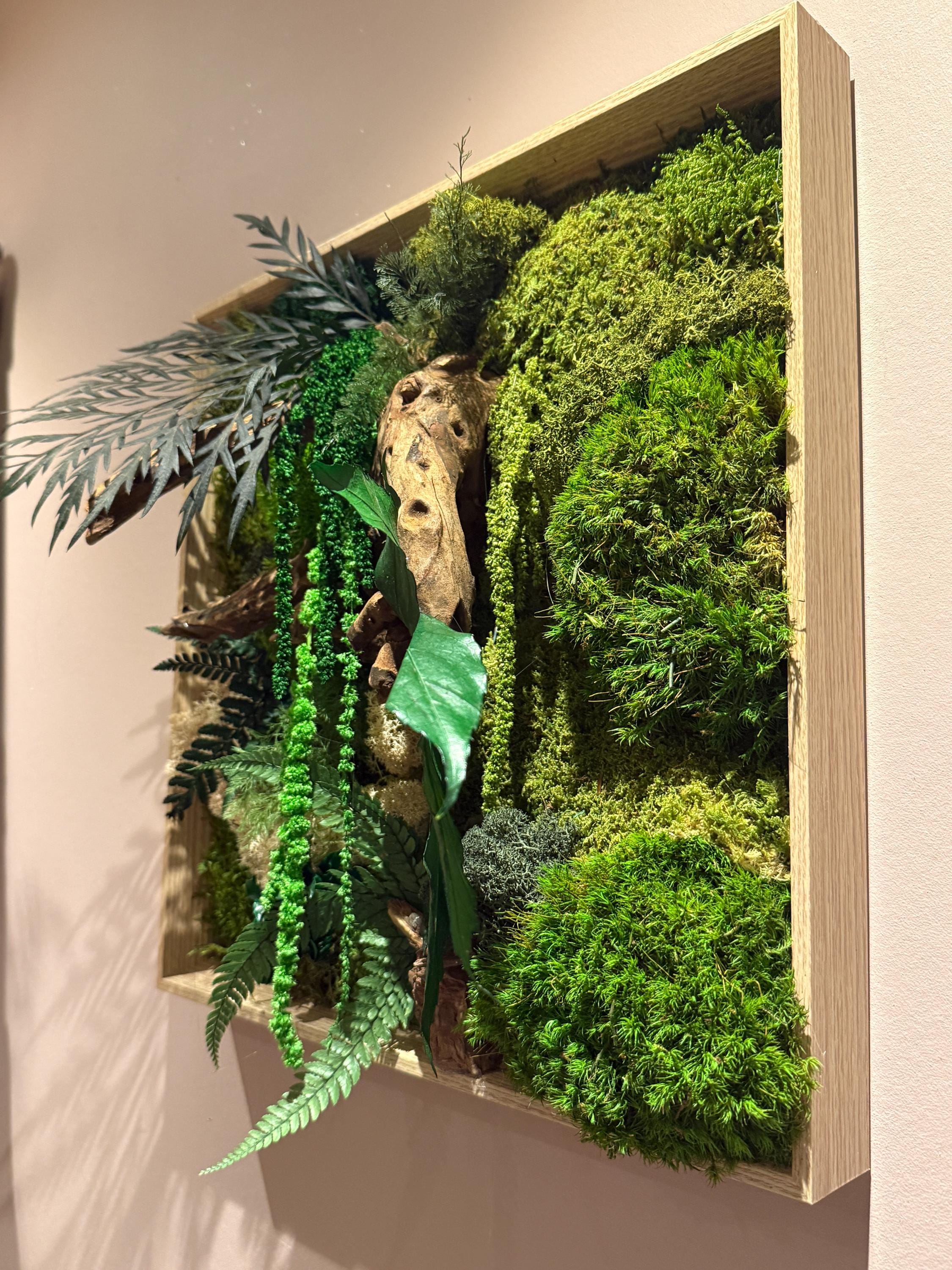 Composé de mousses stabilisées, écorce naturelle de liège, bois flotté et feuillages préservés, il évoque un coin de forêt miniature où chaque détail respire la sérénité.