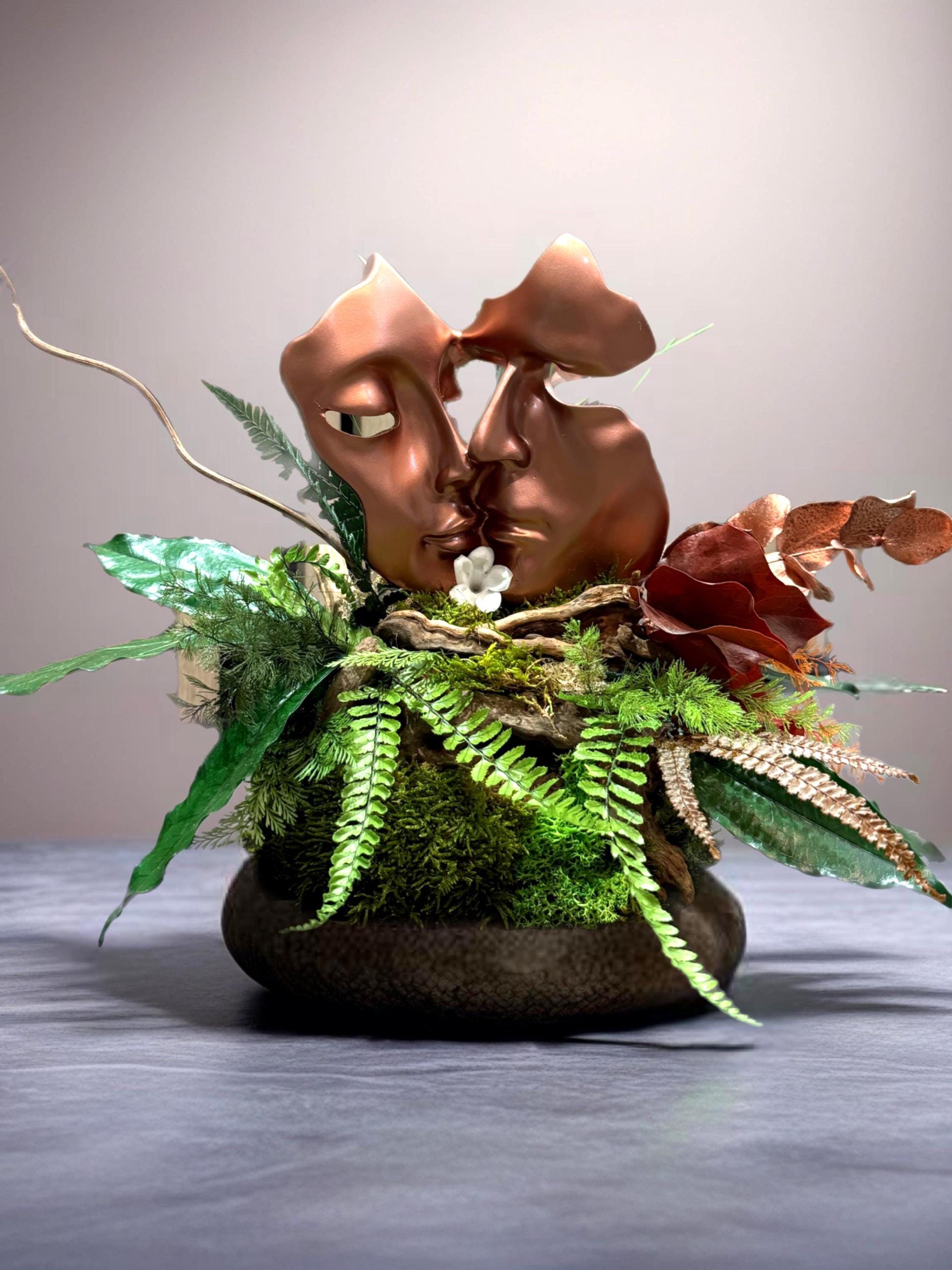 Cette pièce unique met en scène deux visages en pleine étreinte, unis dans un baiser éternel.
