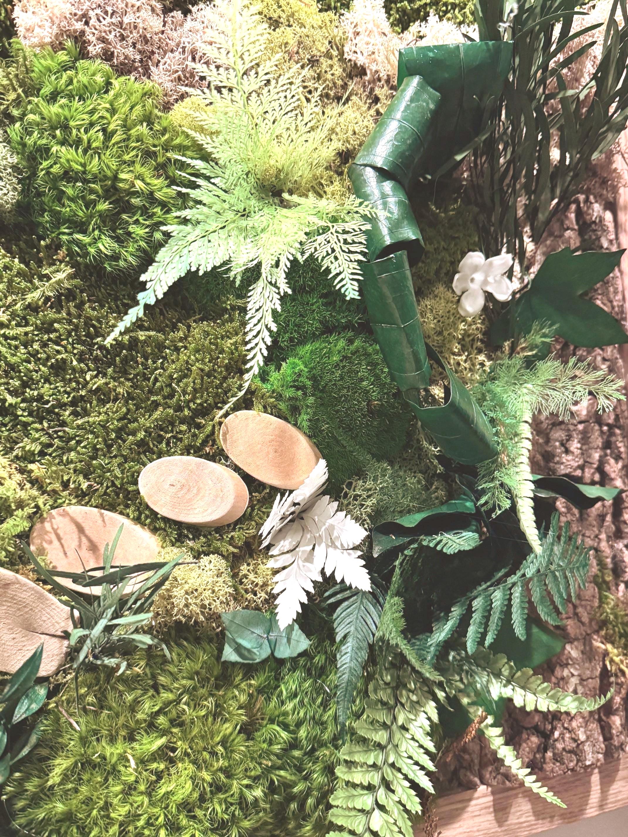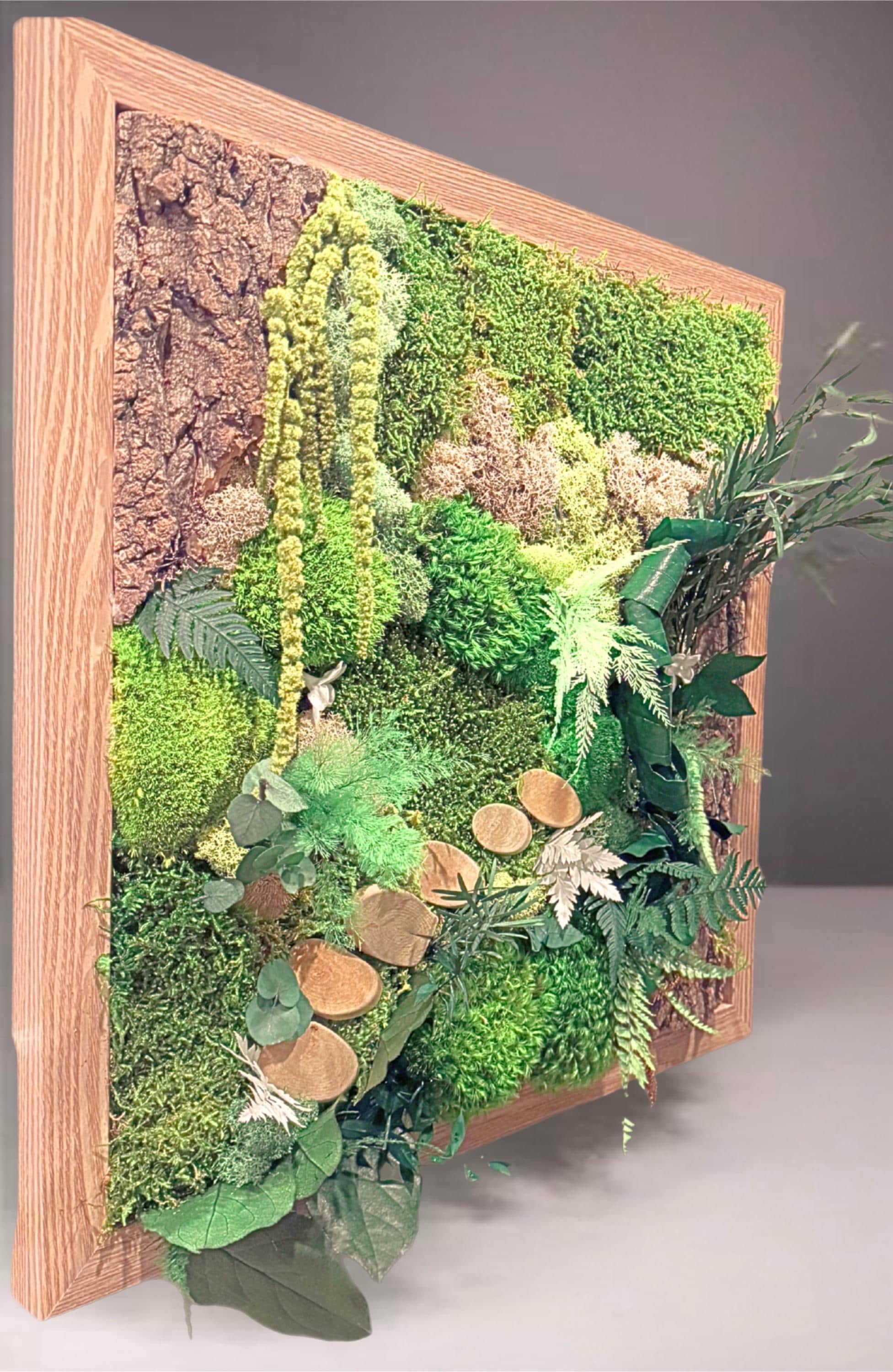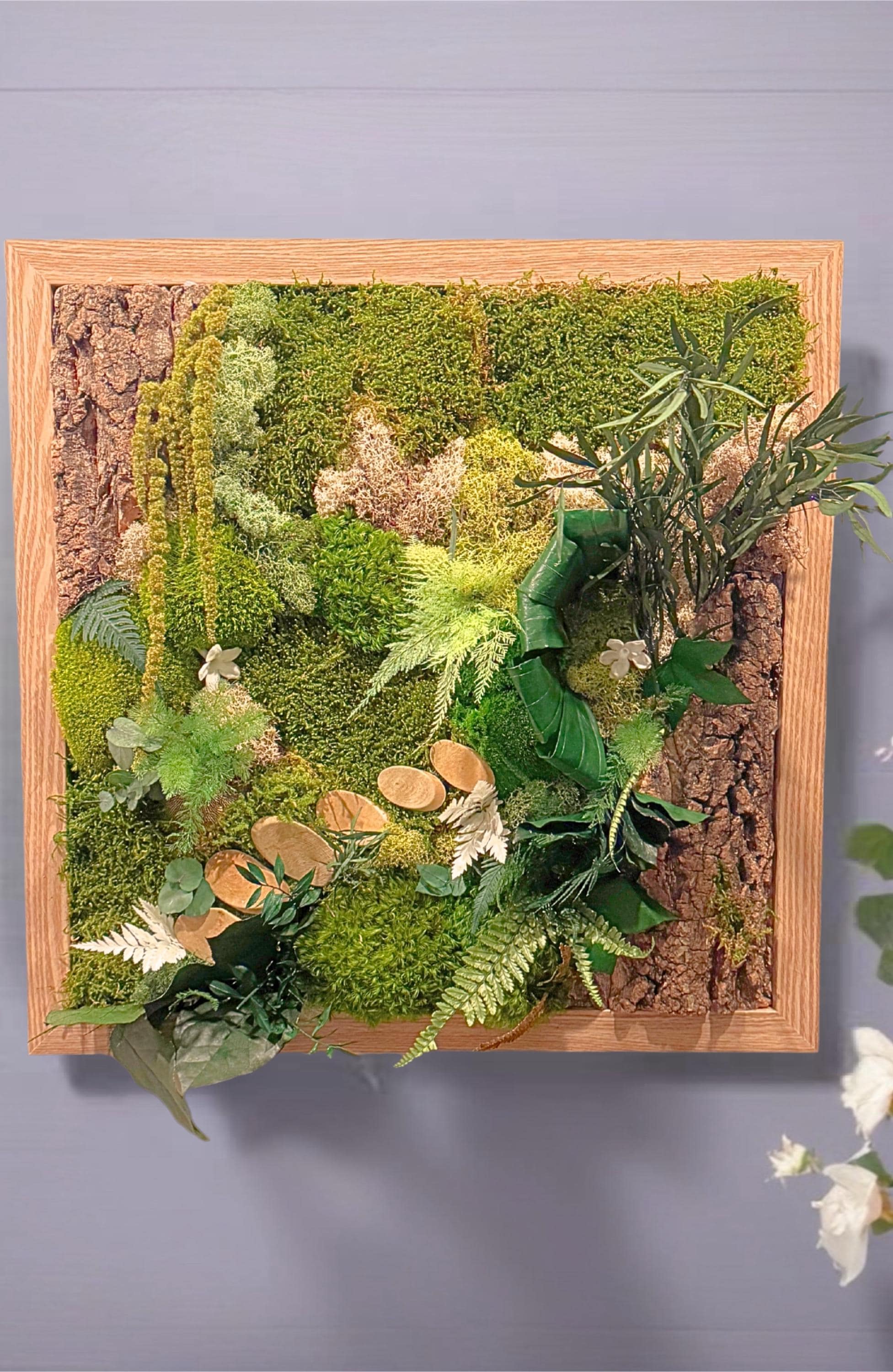 Plongez votre intérieur dans une atmosphère apaisante grâce à ce tableau végétal unique, voici un mur de mousse stabilisée, d’écorce naturelle et de feuillages stabilisés soigneusement agencés à la main.