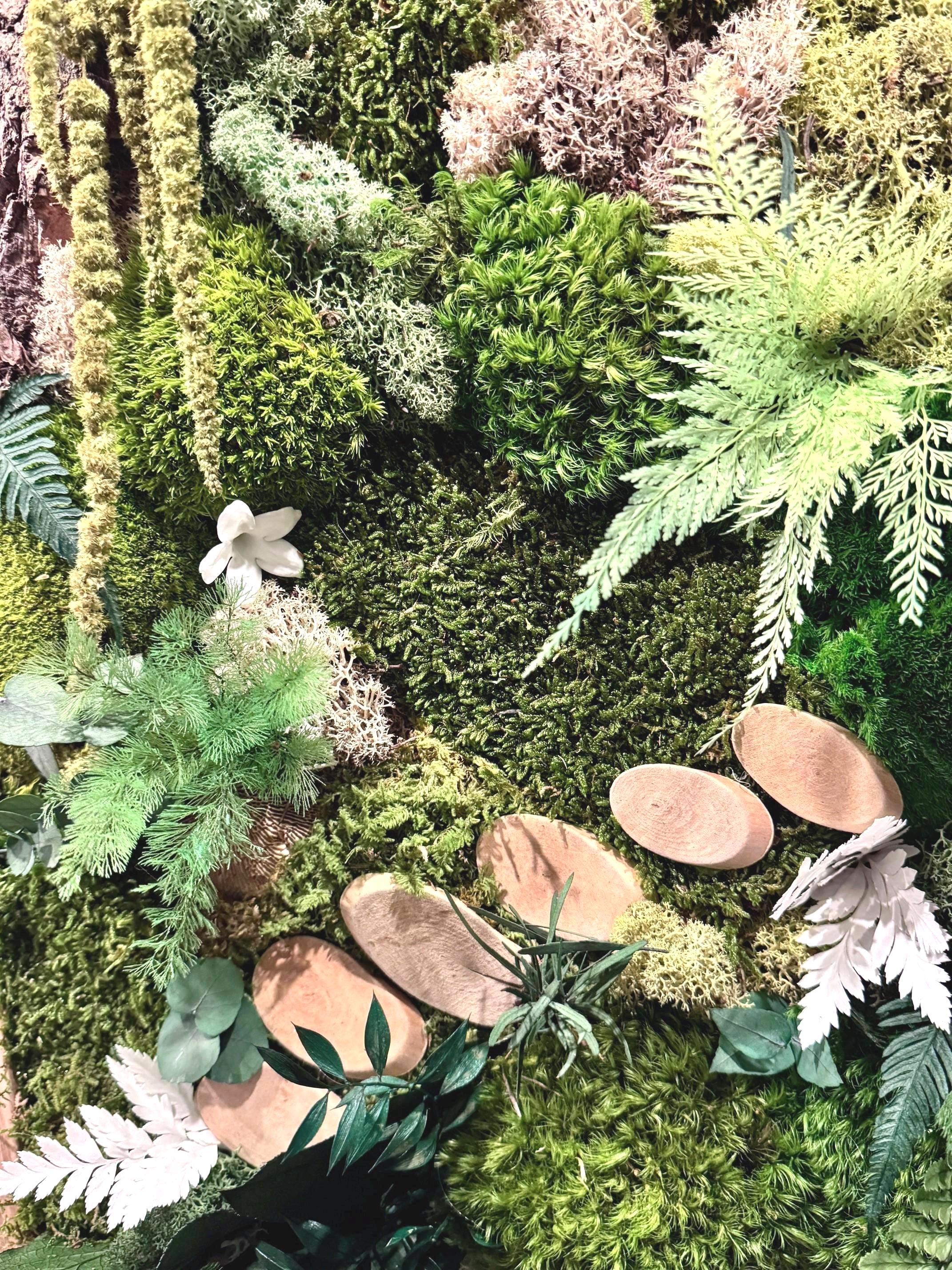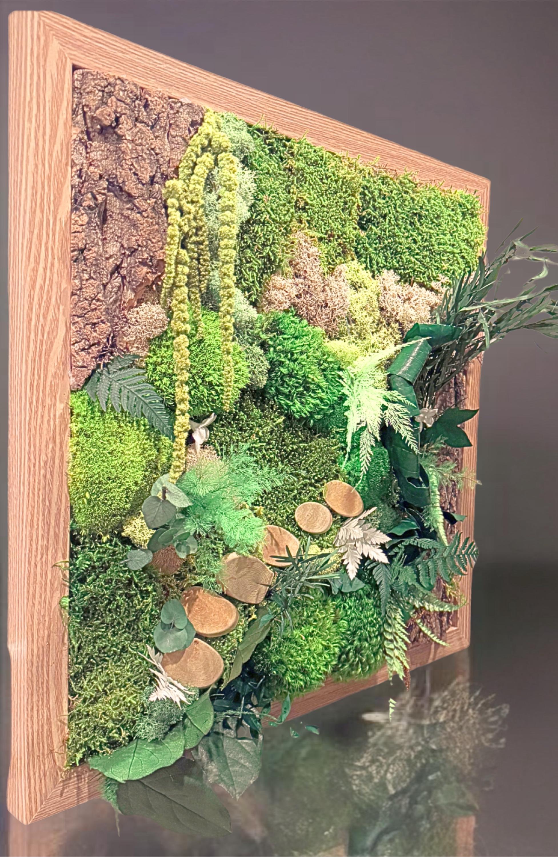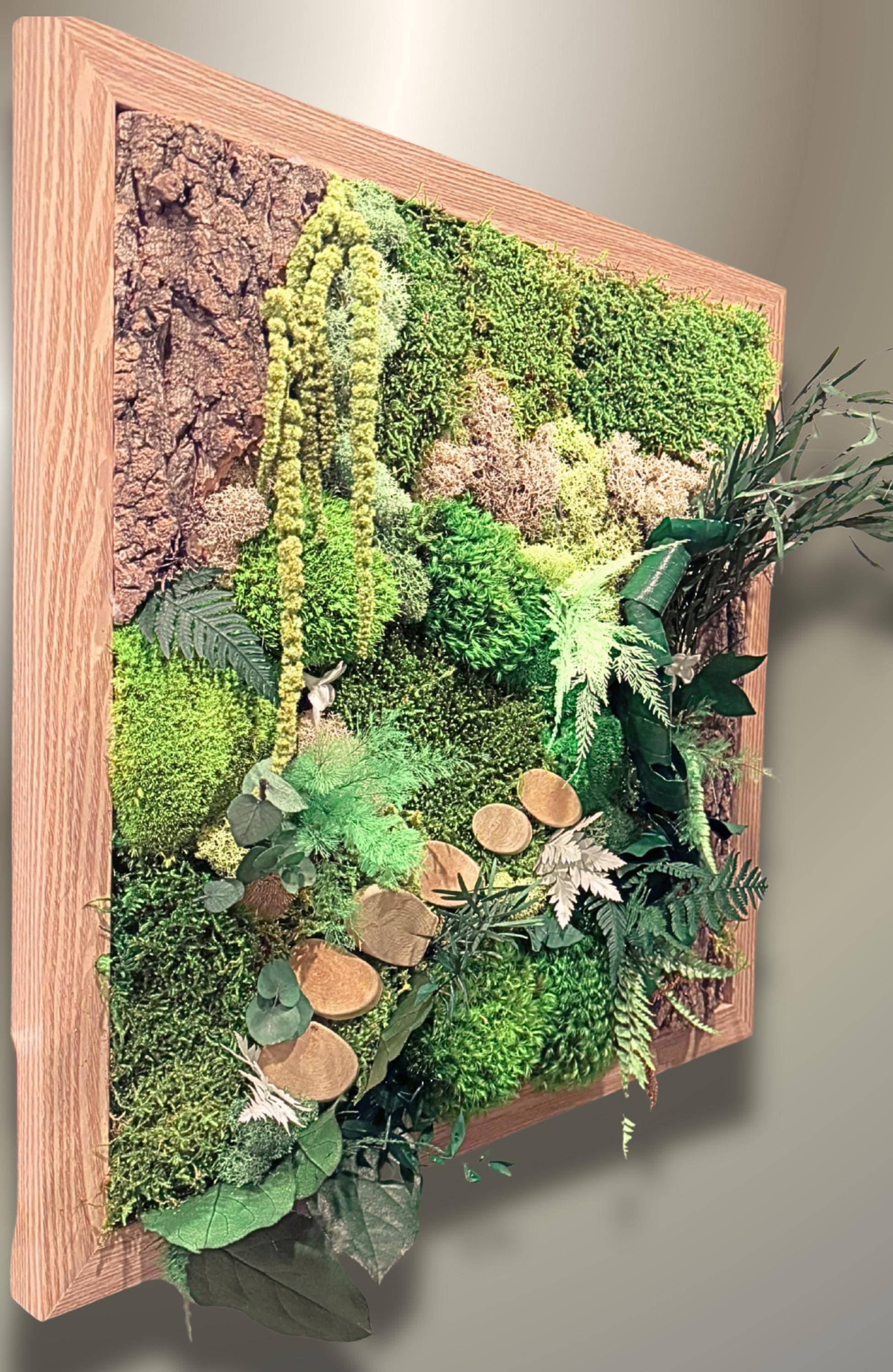 Plongez votre intérieur dans une atmosphère apaisante grâce à ce tableau végétal unique, voici un mur de mousse stabilisée, d’écorce naturelle et de feuillages stabilisés soigneusement agencés à la main.