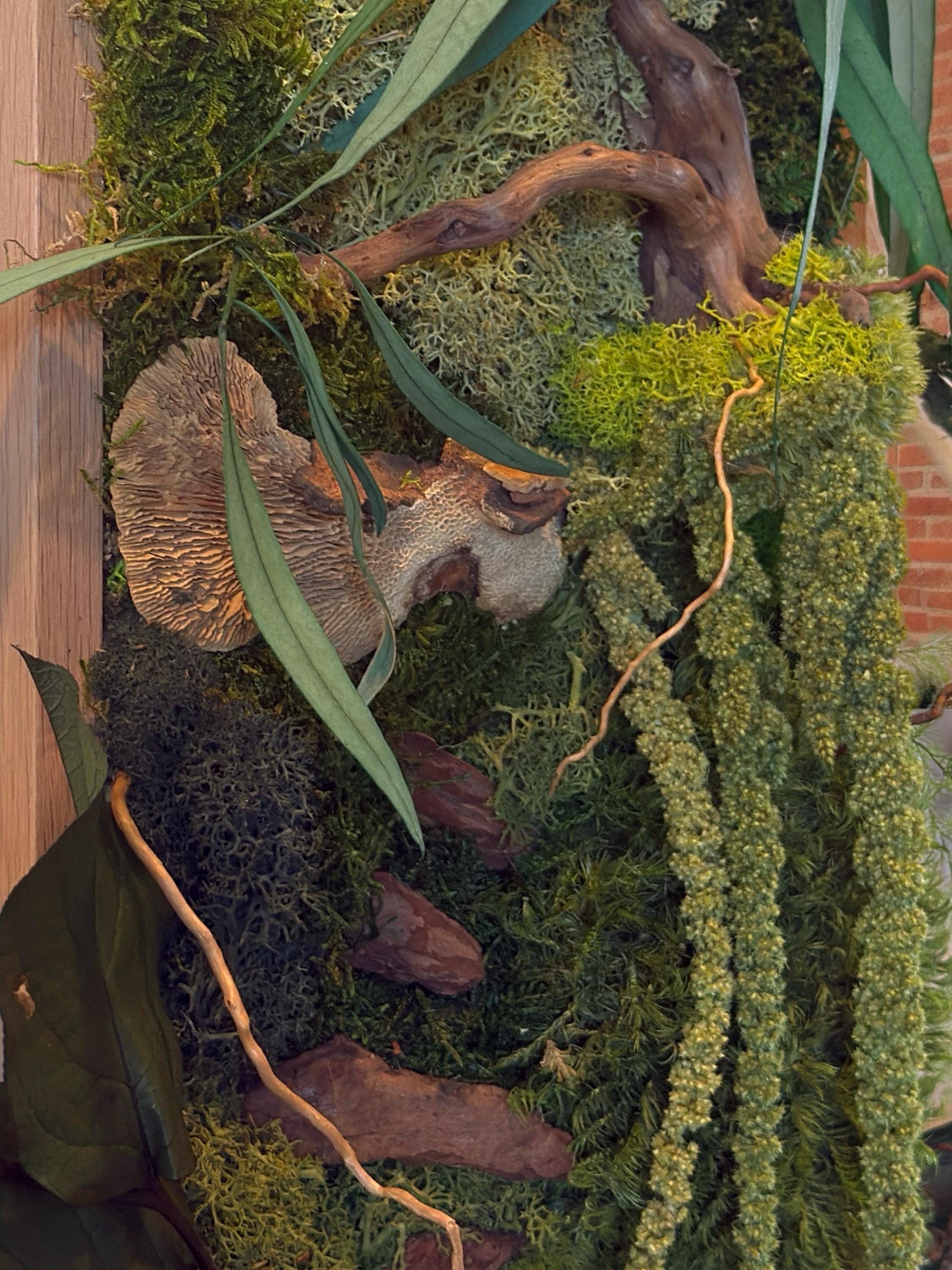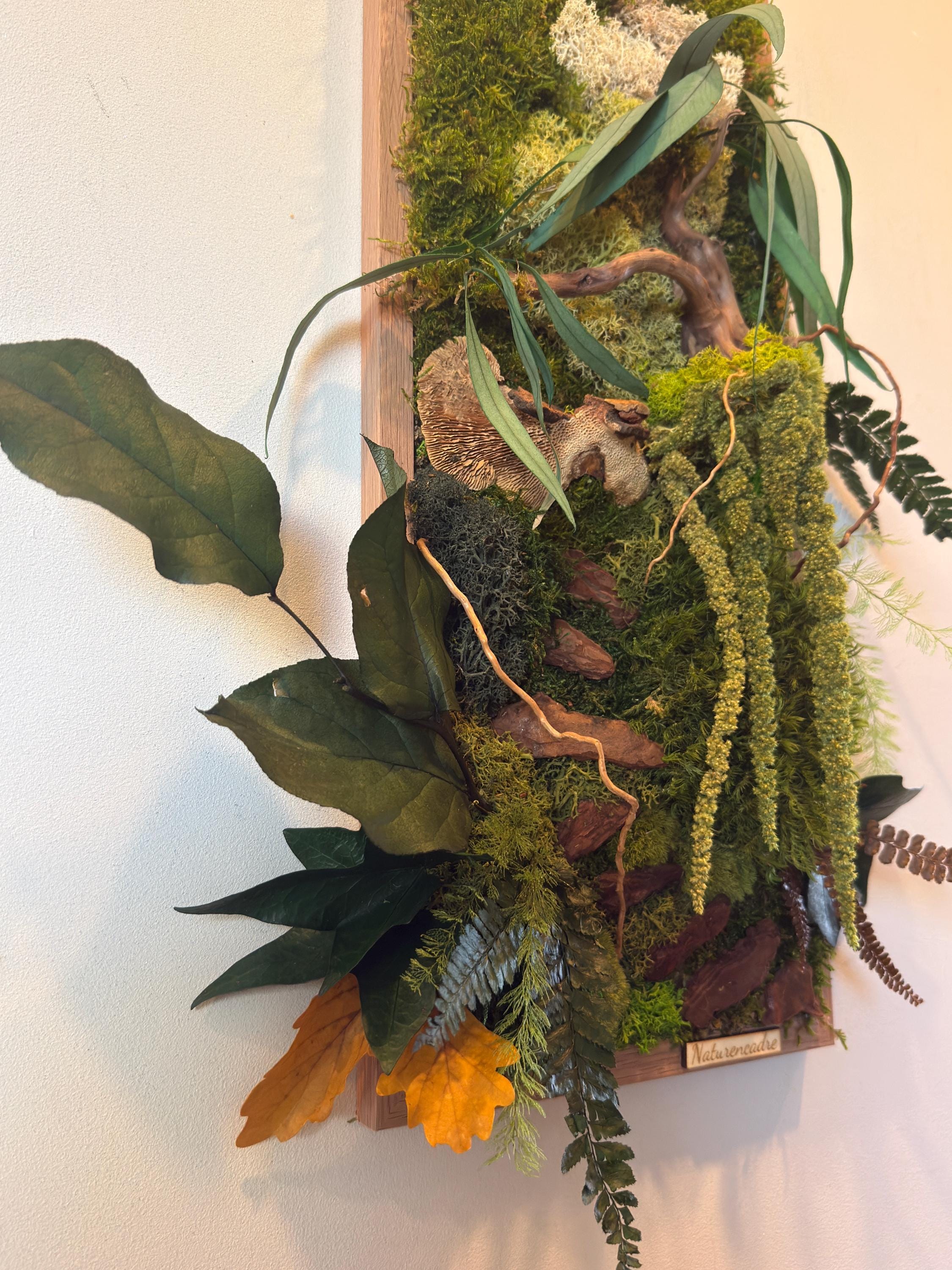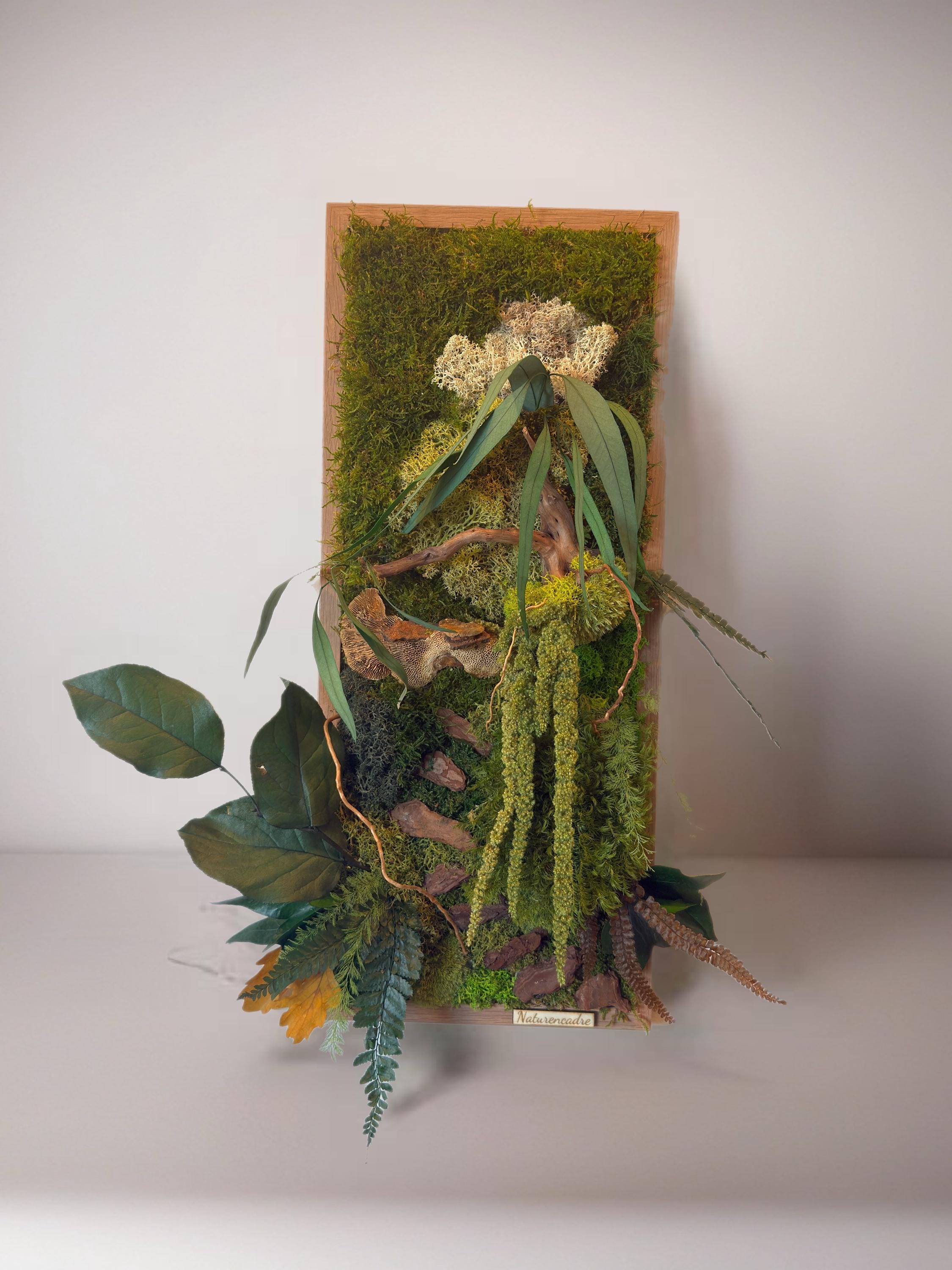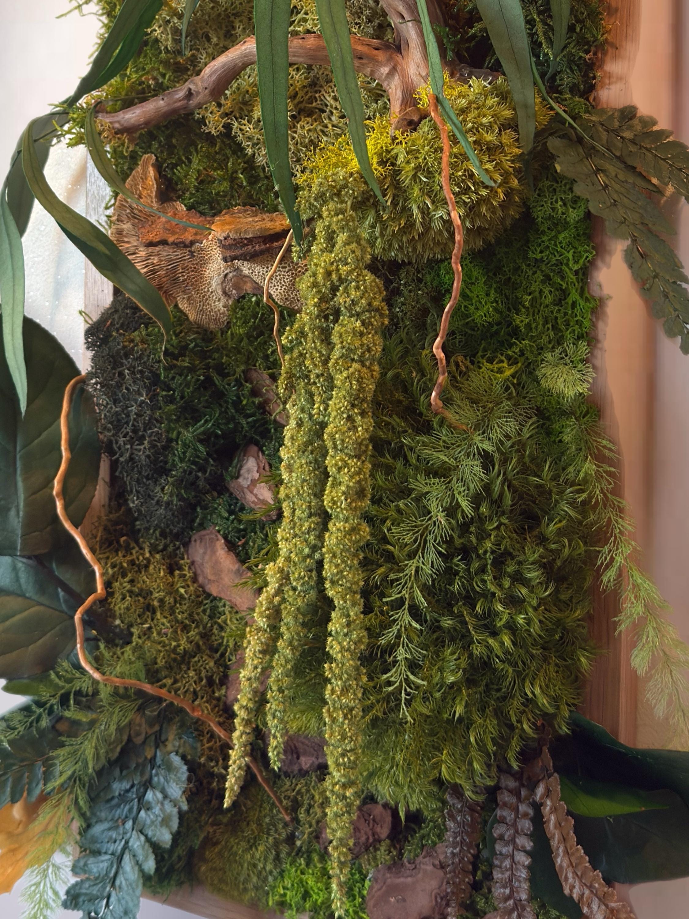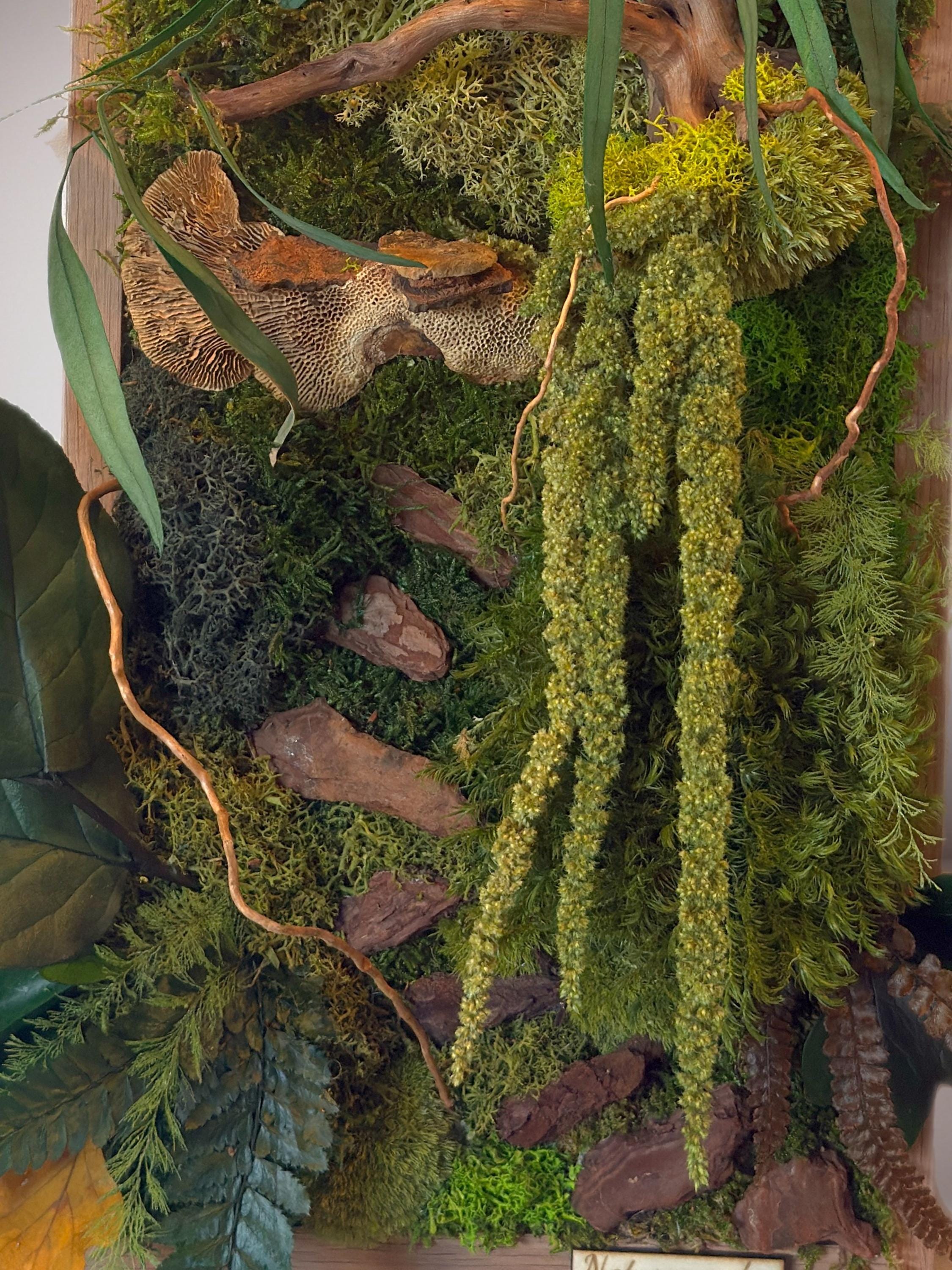 Son format allongé met en valeur un jeu de textures entre mousses naturelles, feuillages tombants et bois flotté, créant une scène forestière en relief où la nature semble suspendue au mur.
