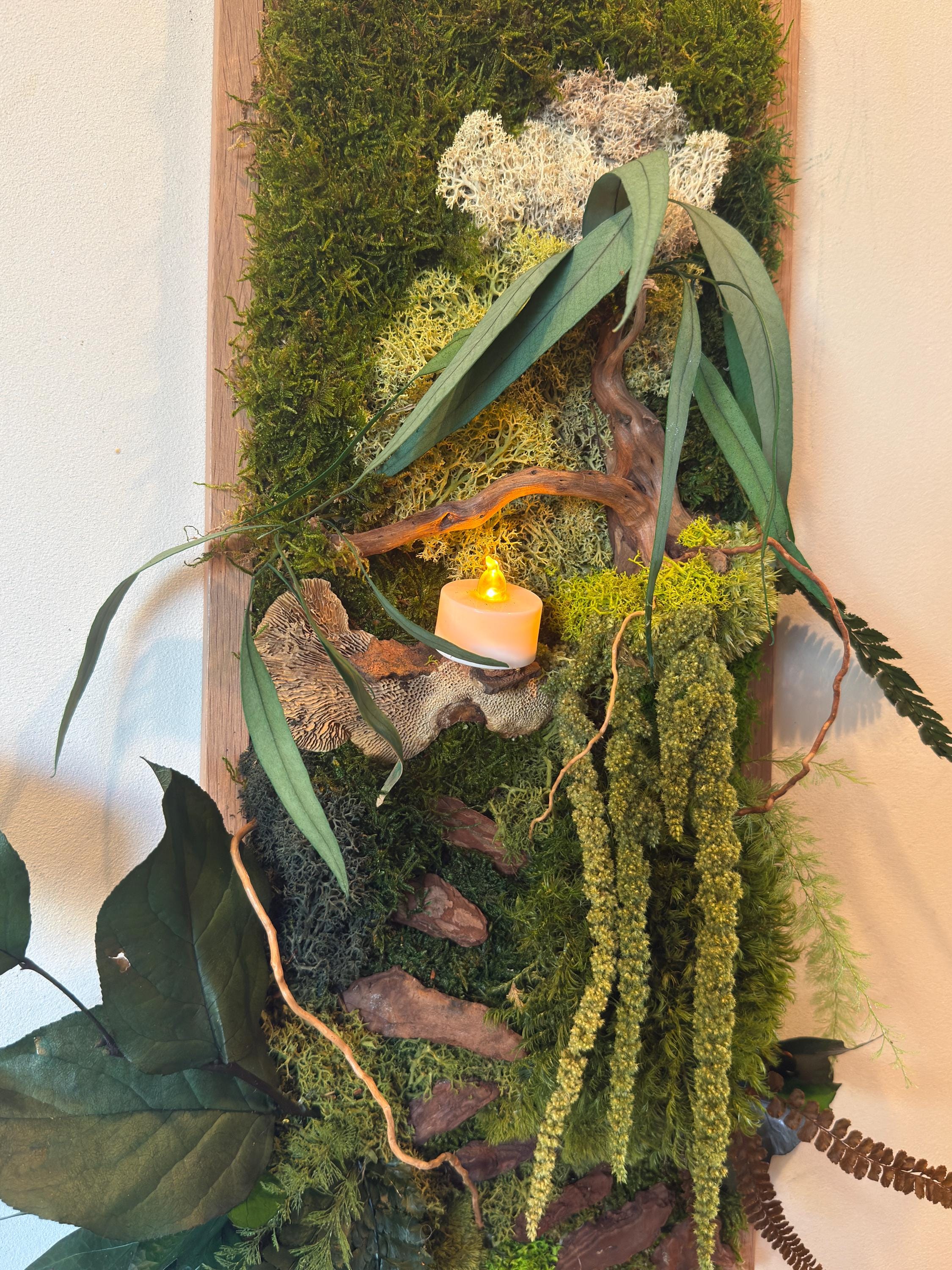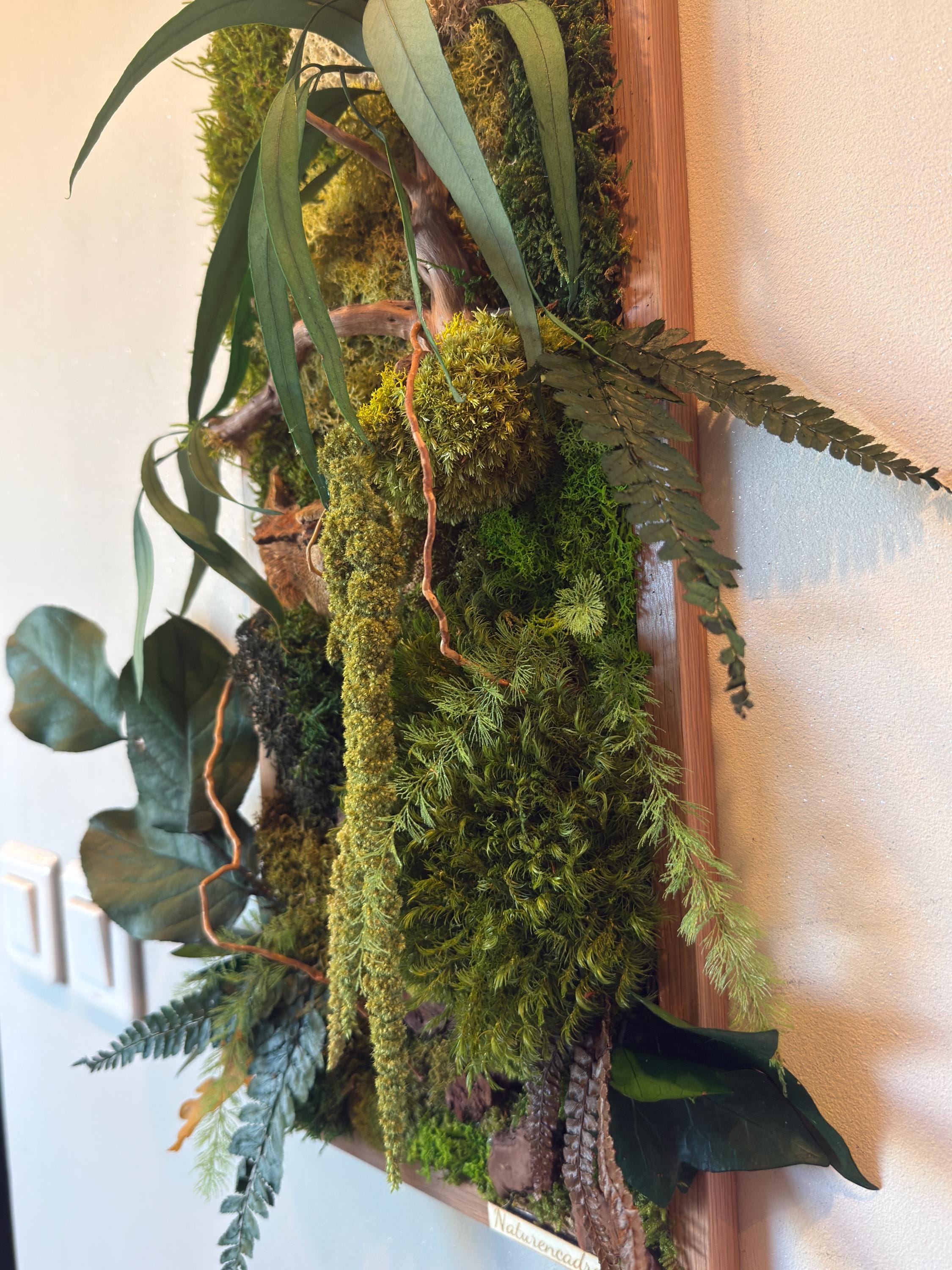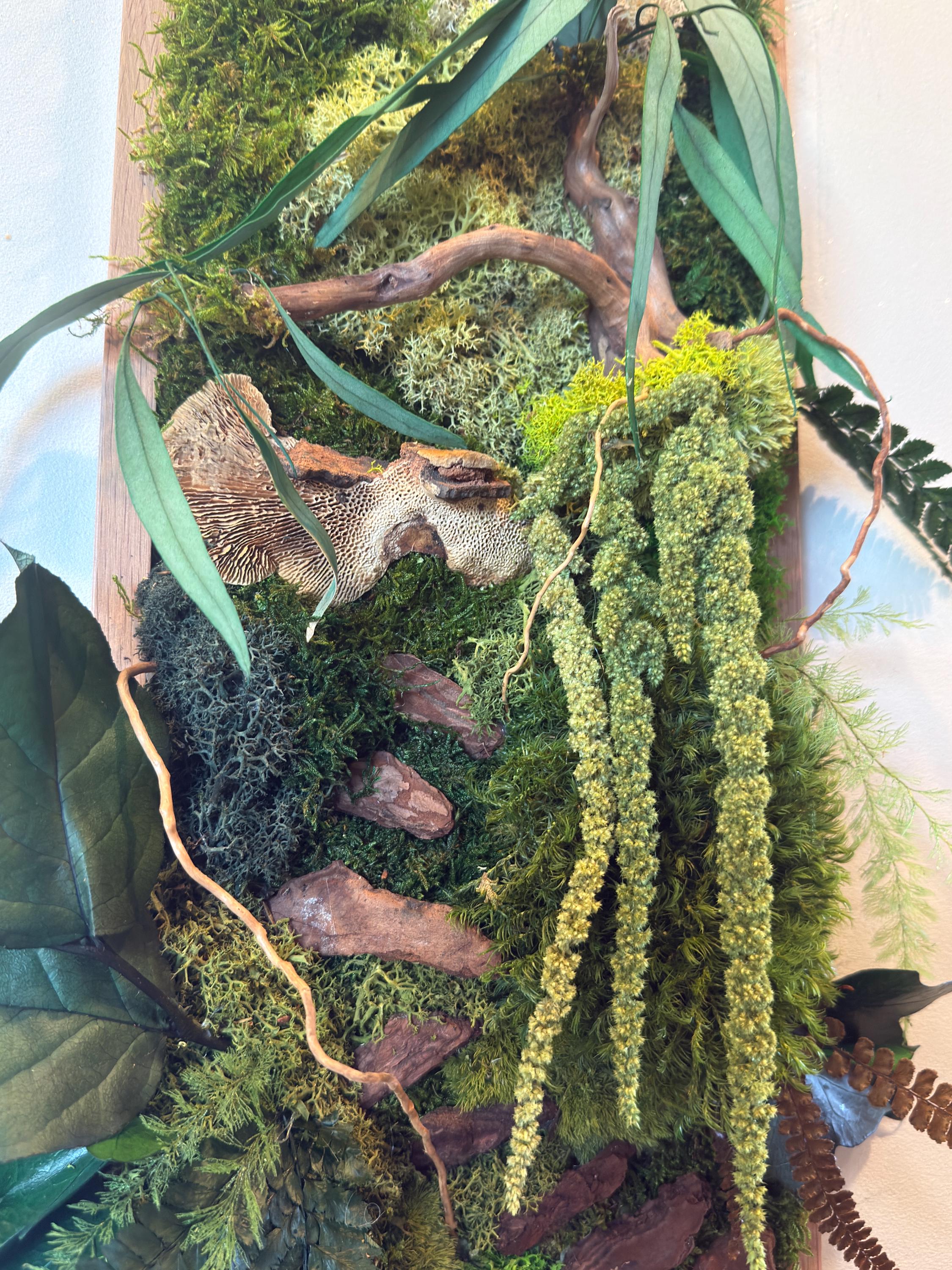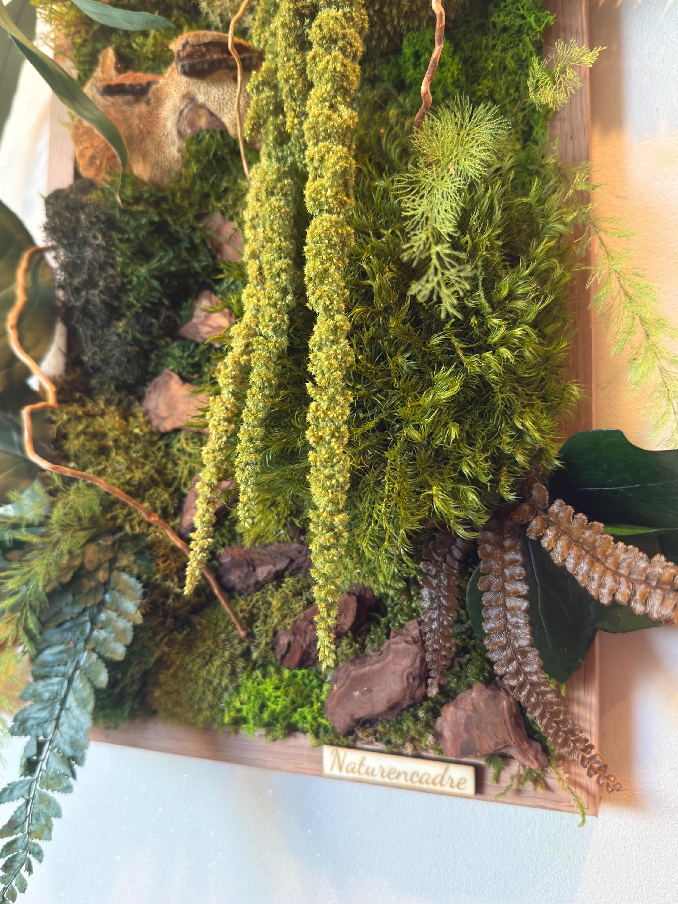 Son format allongé met en valeur un jeu de textures entre mousses naturelles, feuillages tombants et bois flotté, créant une scène forestière en relief où la nature semble suspendue au mur.