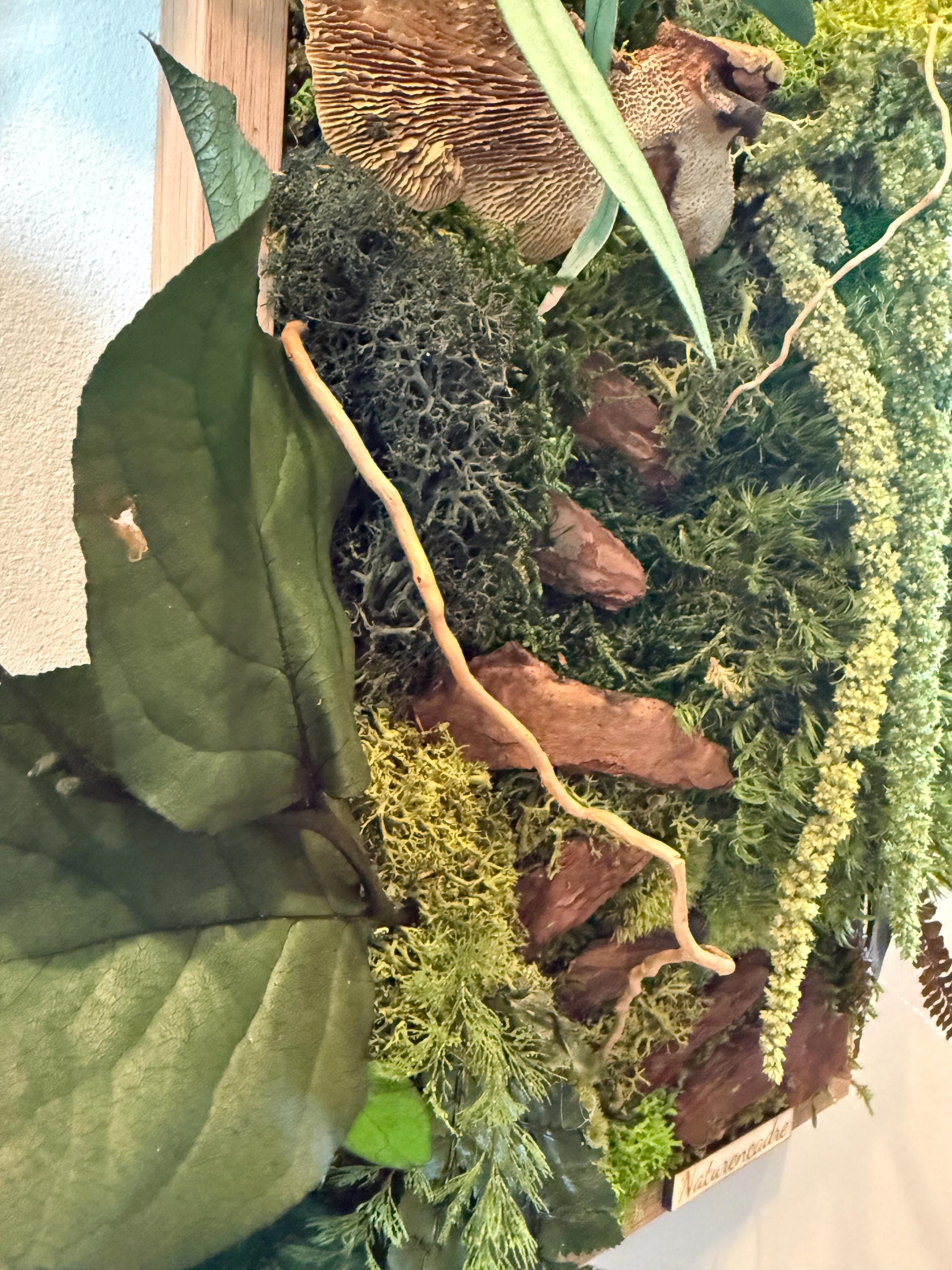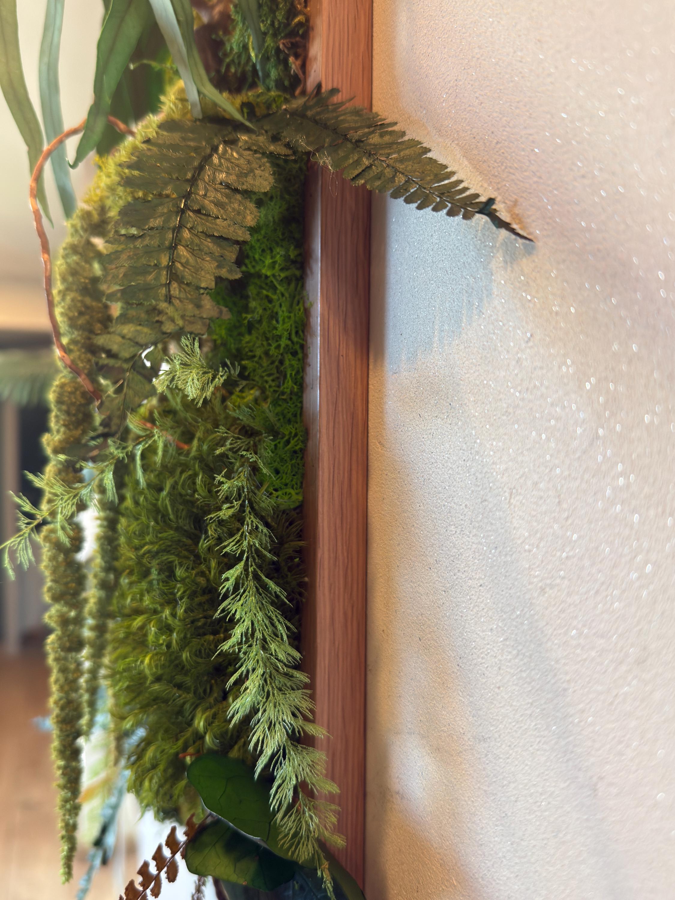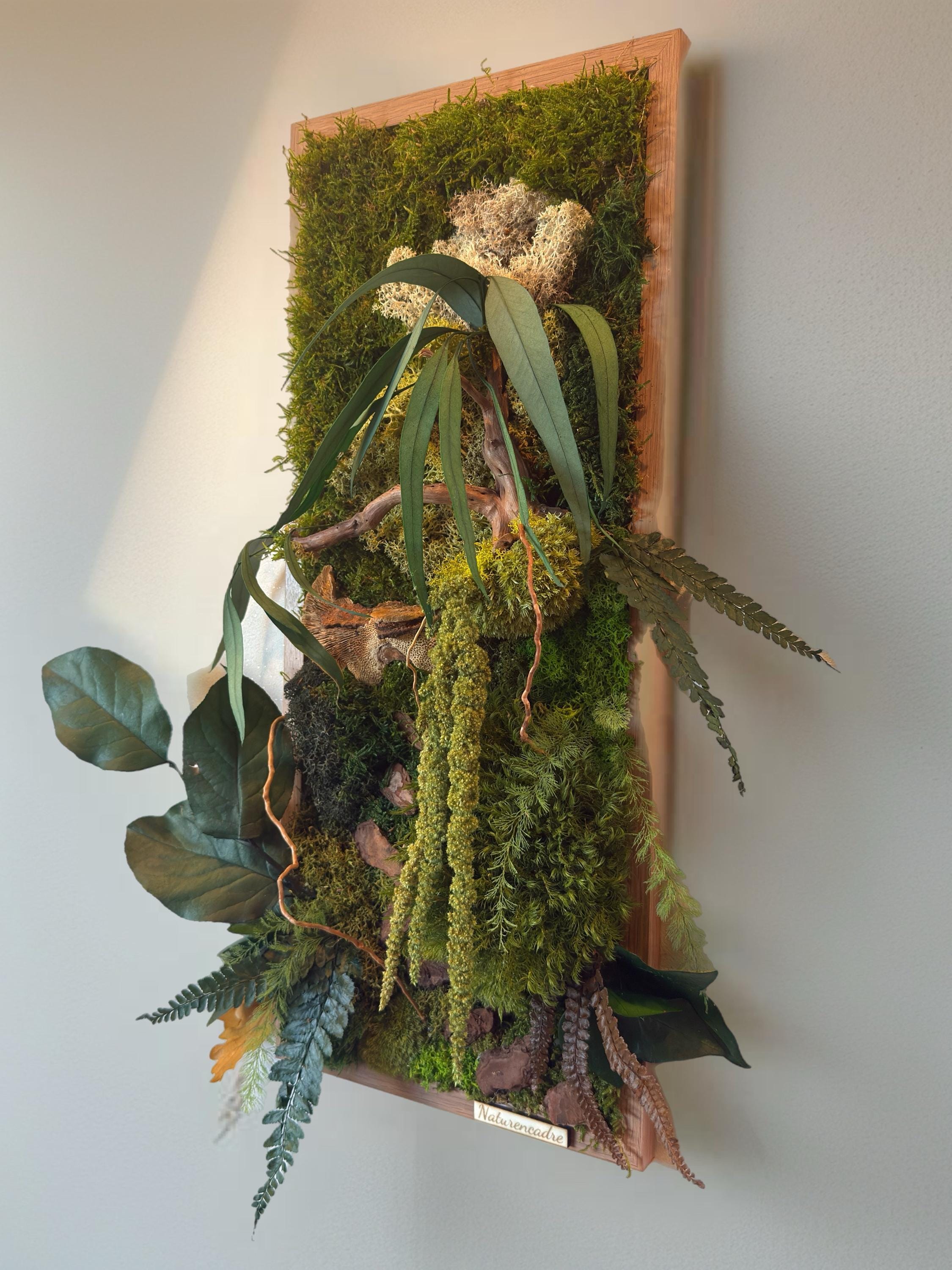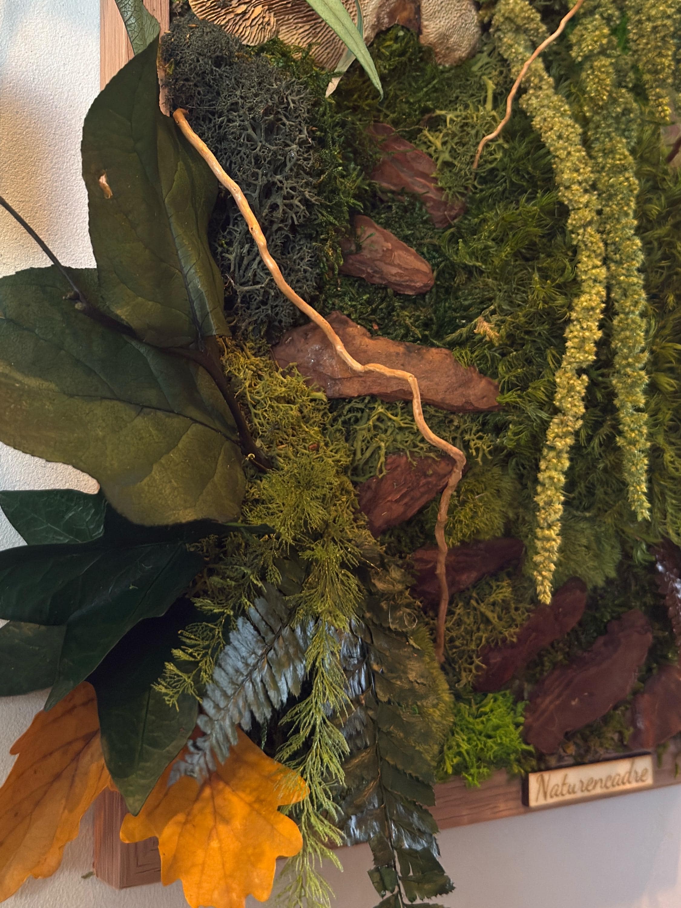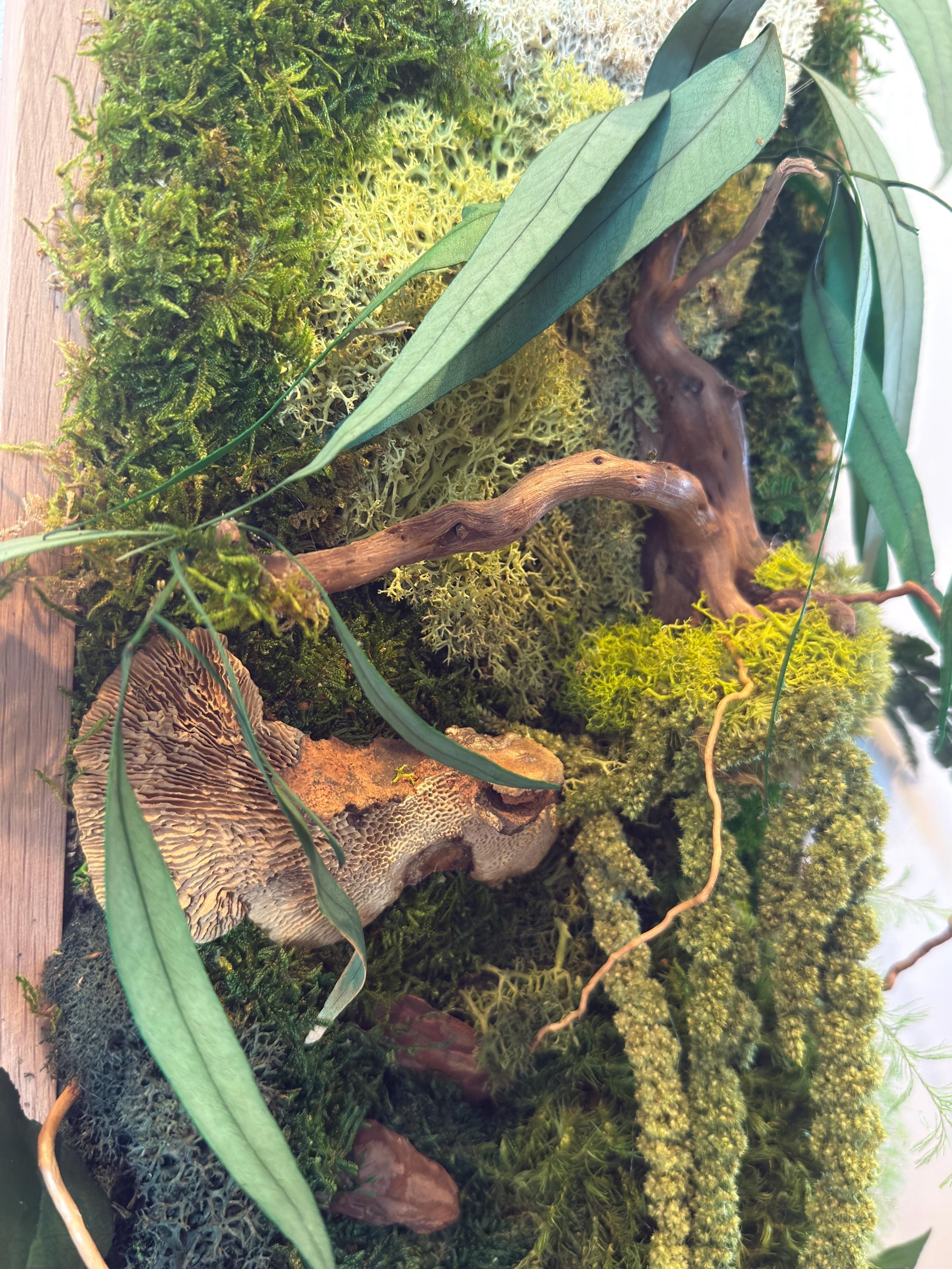 Son format allongé met en valeur un jeu de textures entre mousses naturelles, feuillages tombants et bois flotté, créant une scène forestière en relief où la nature semble suspendue au mur.