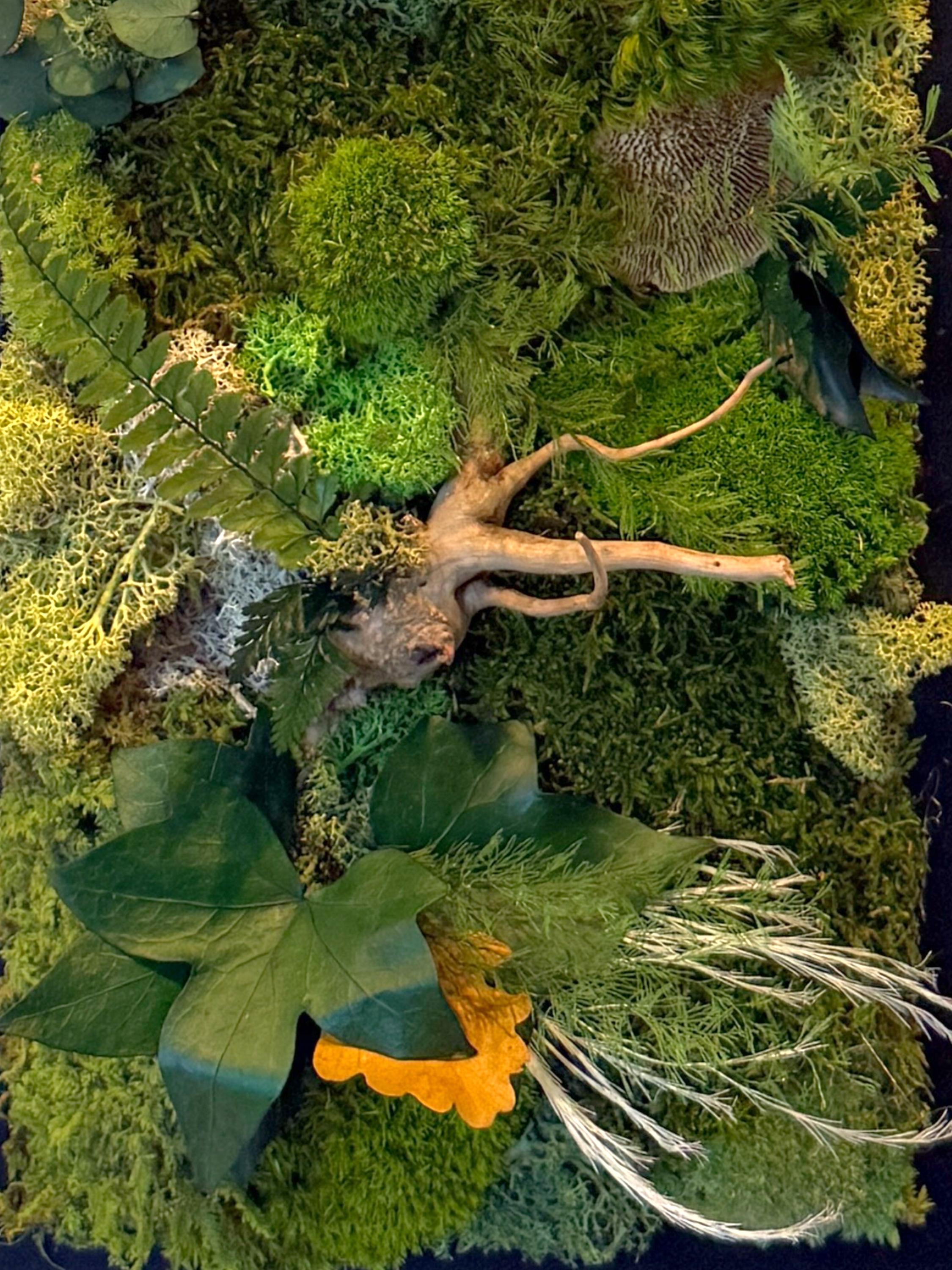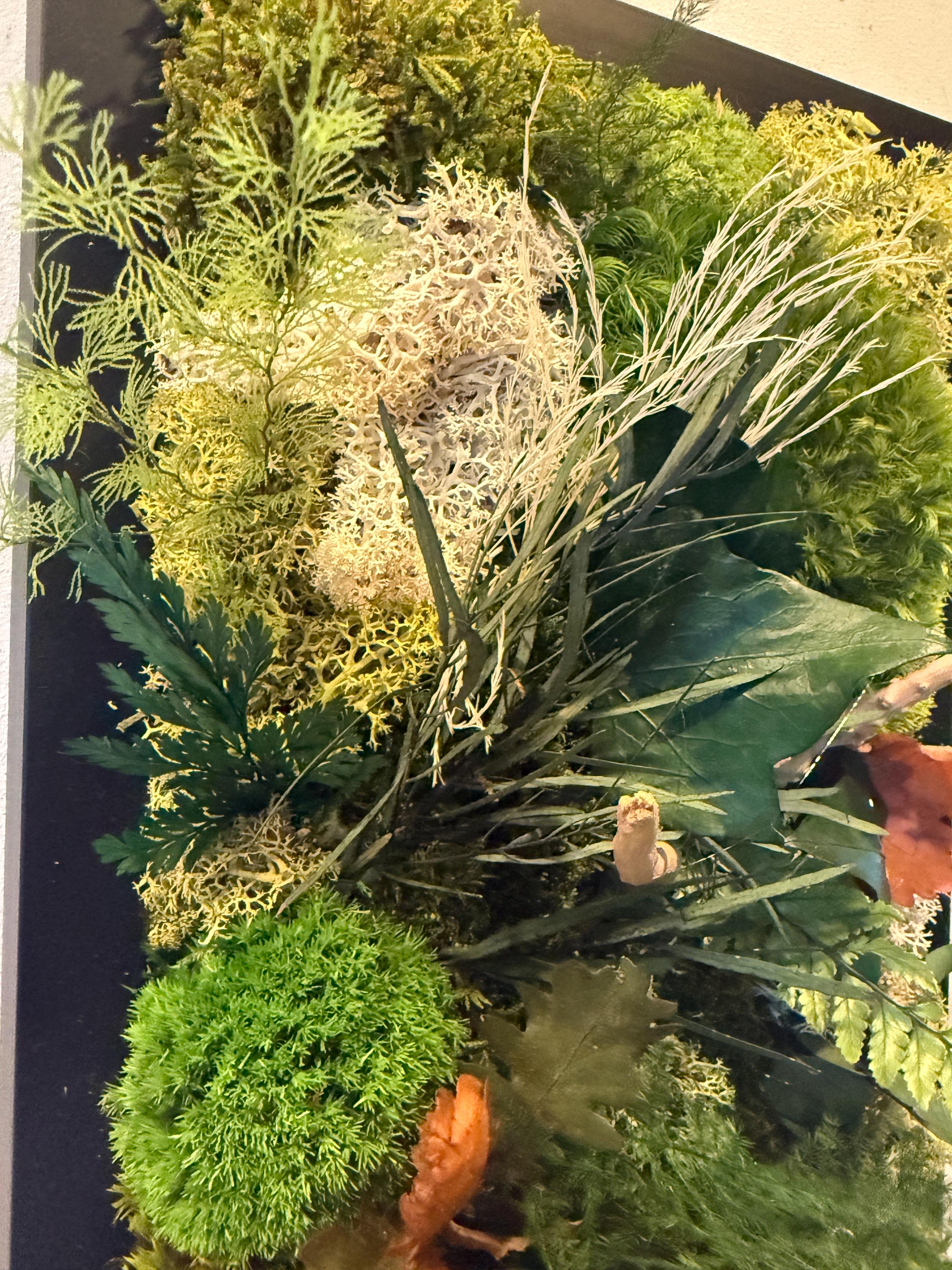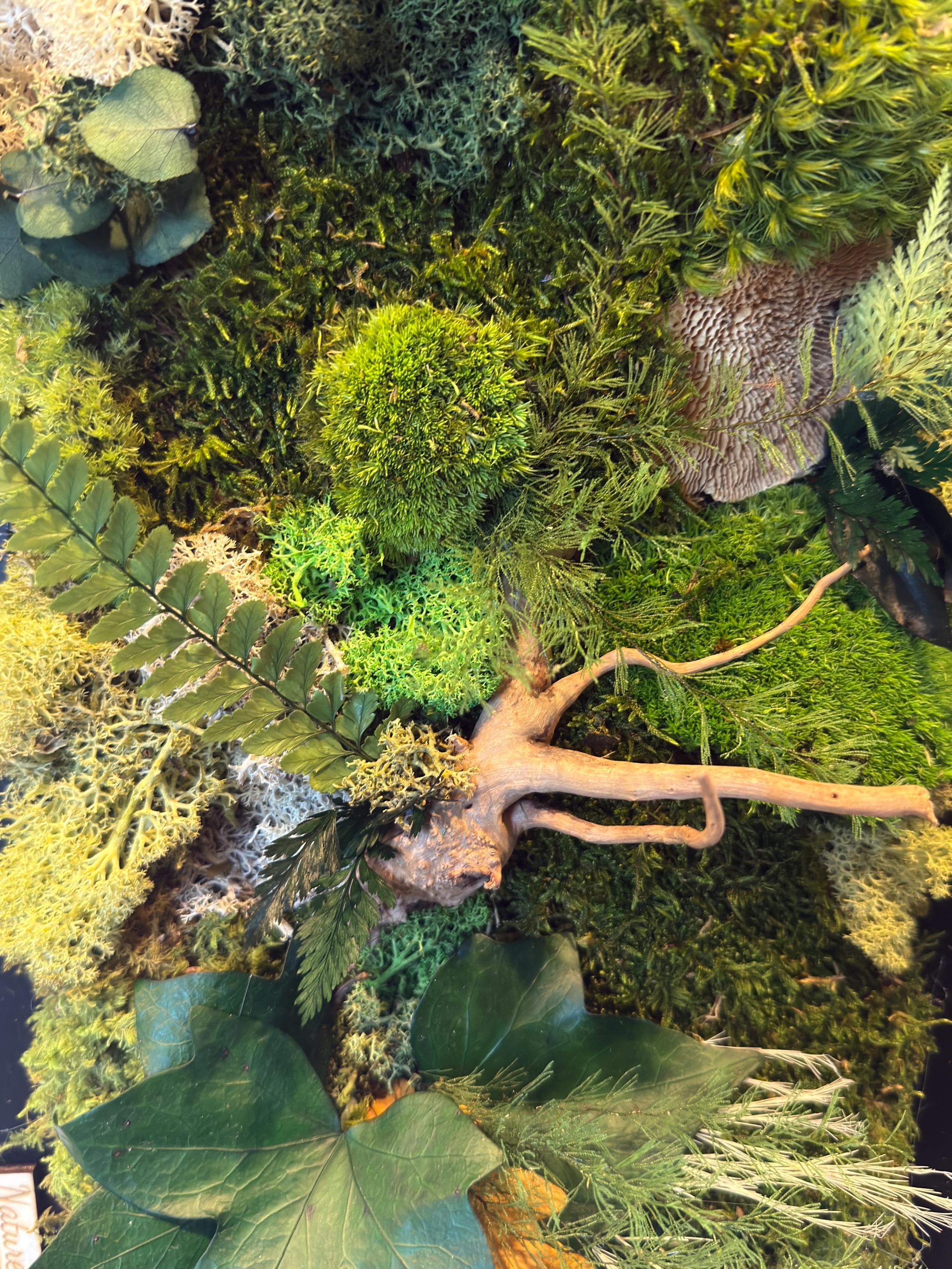 Composé de mousses stabilisées, de lichens nordiques, de fougères et de feuillages naturels, il évoque la beauté d’une forêt miniature figée dans le temps.