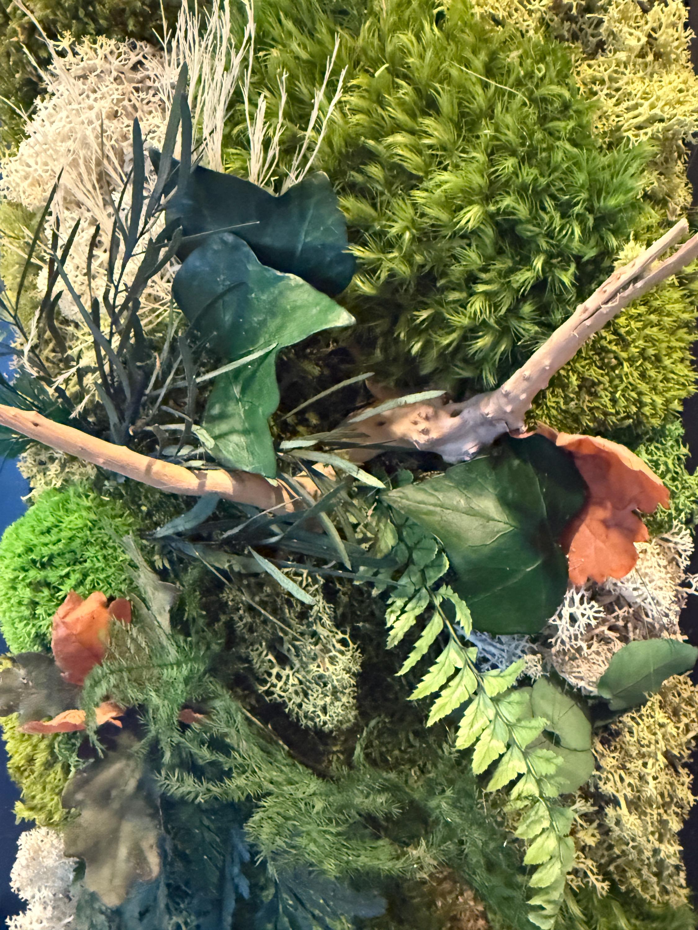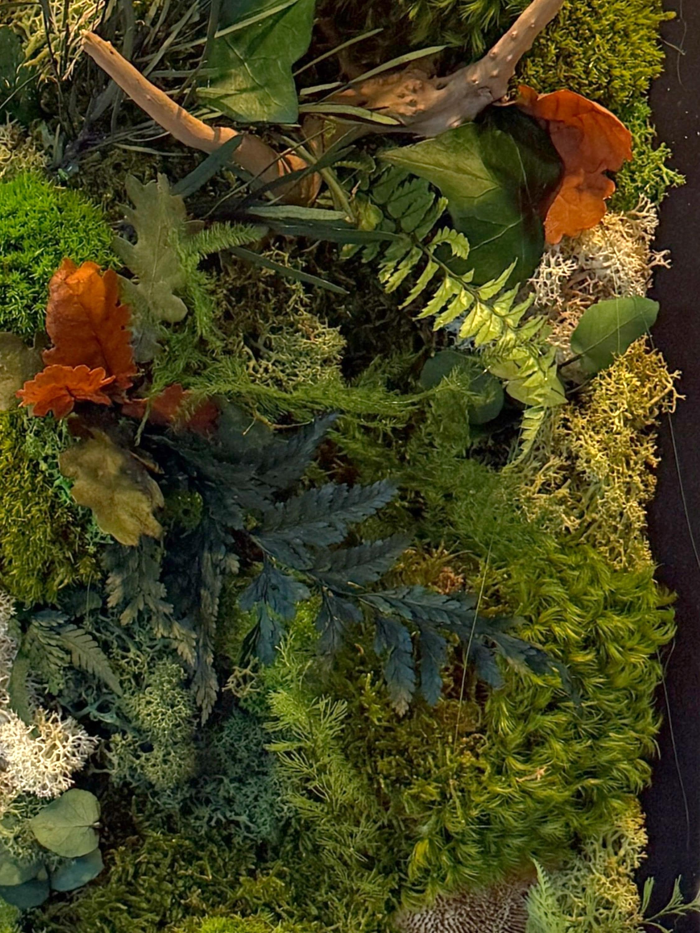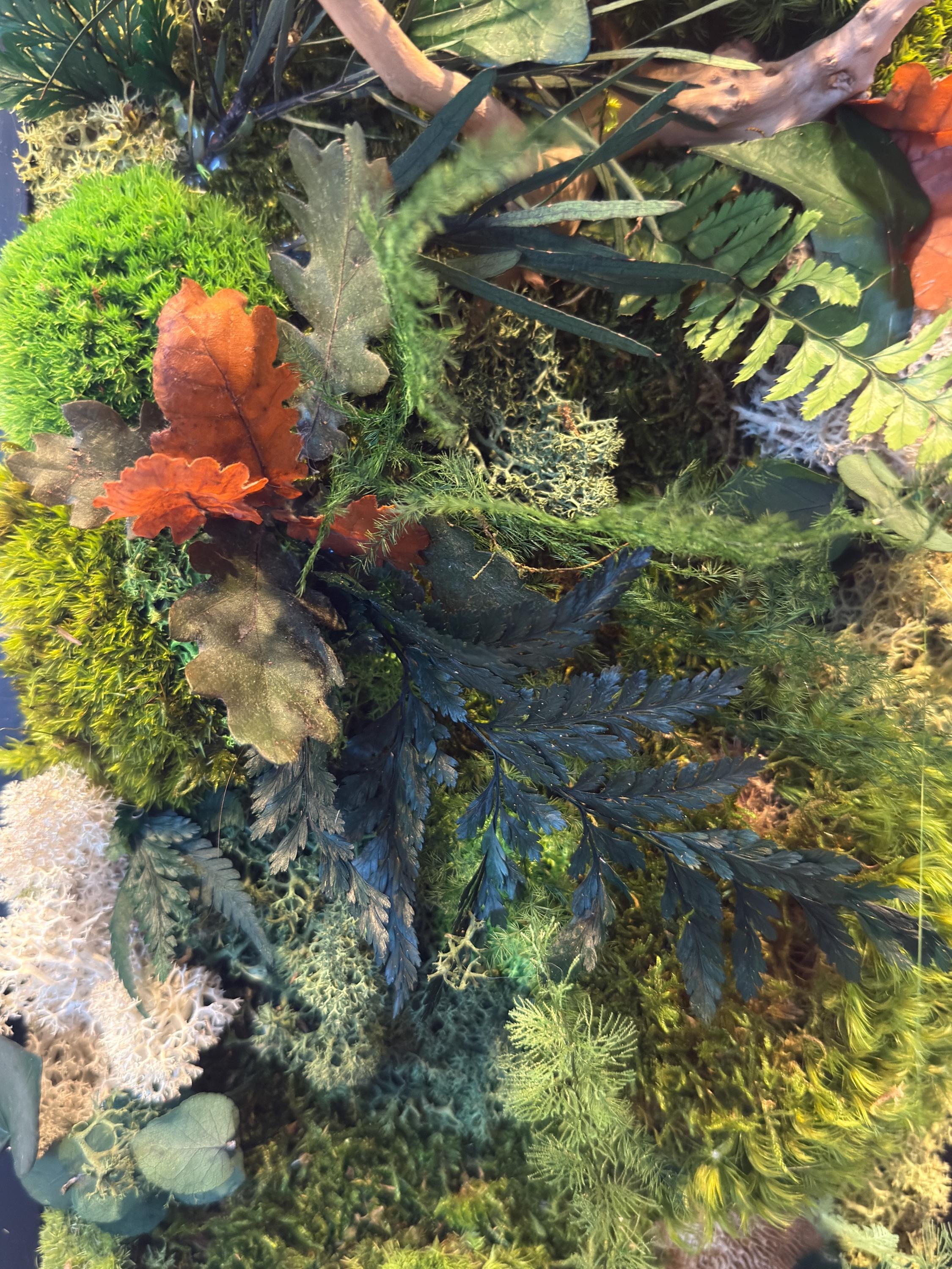 • Matériaux : mousse de forêt, mousse boule, lichen scandinave, fougère stabilisée, écorce, branches et feuillage préservé