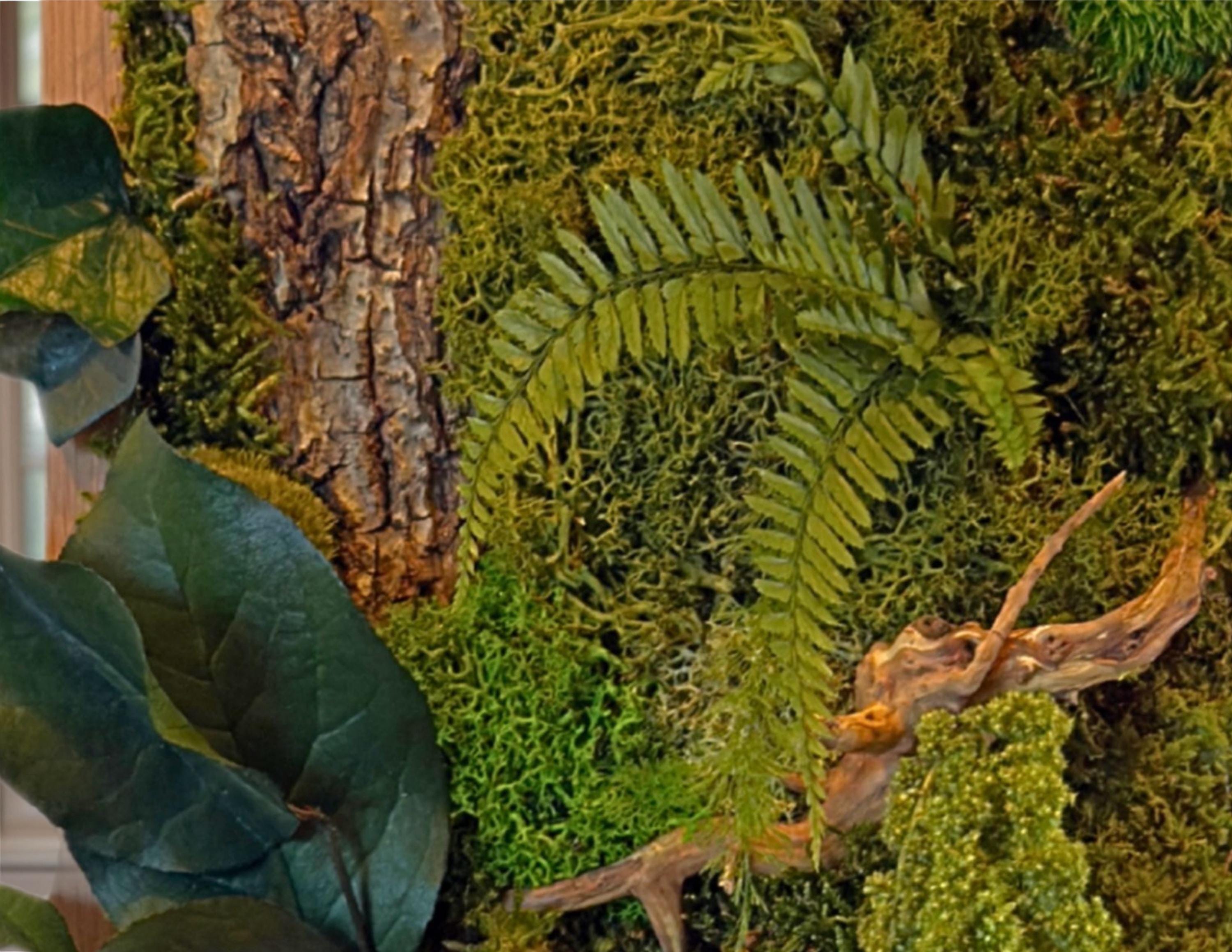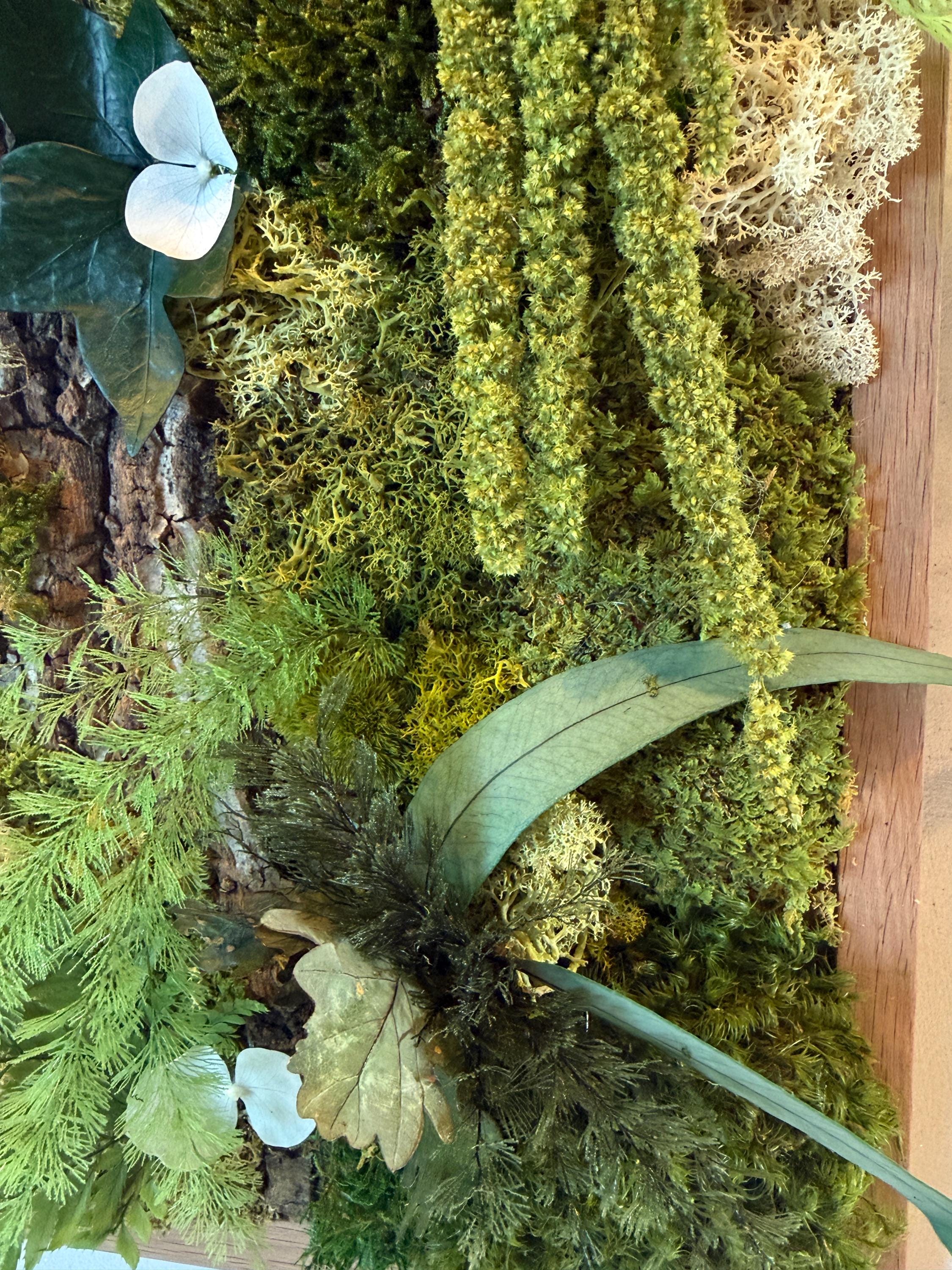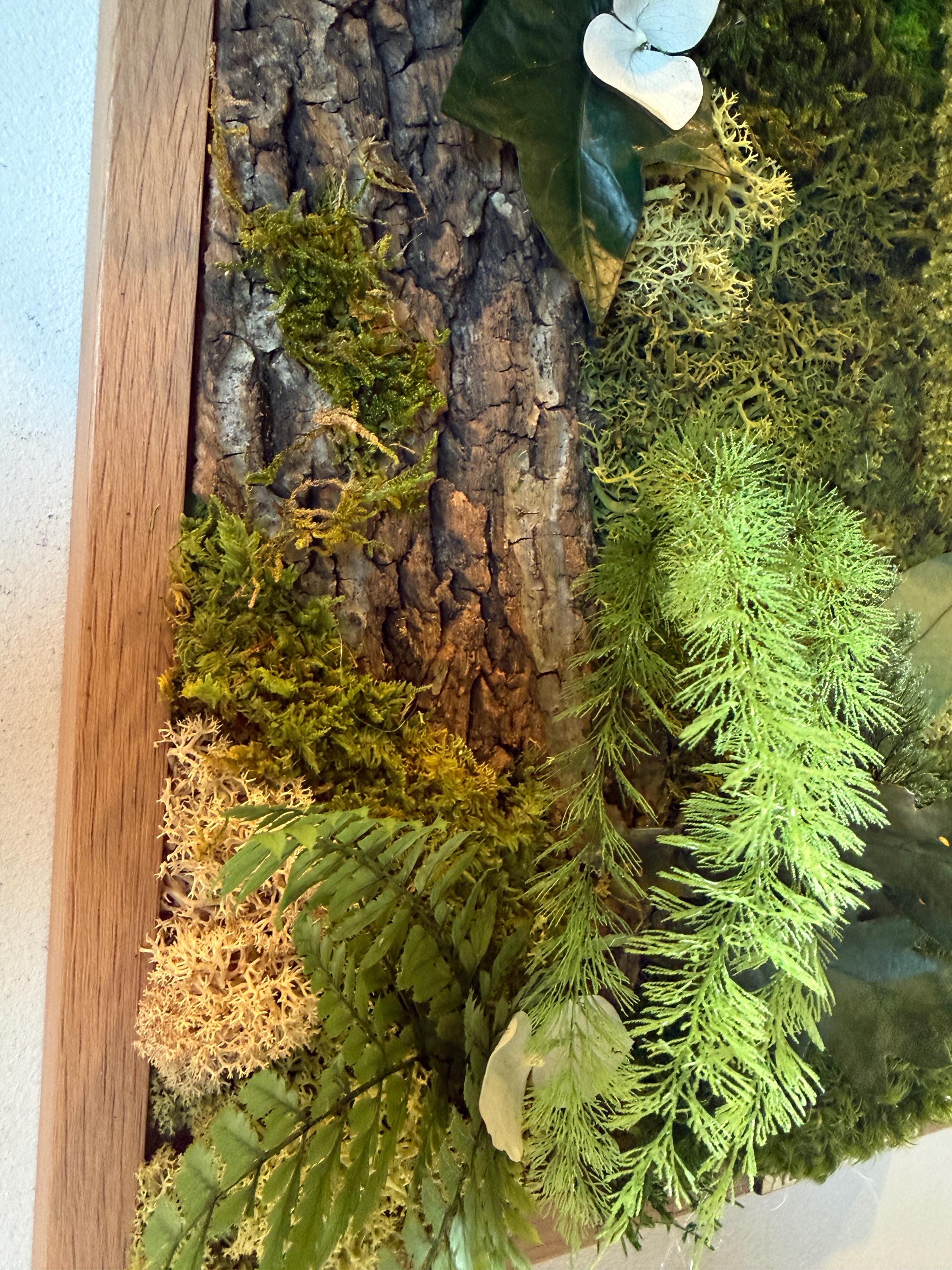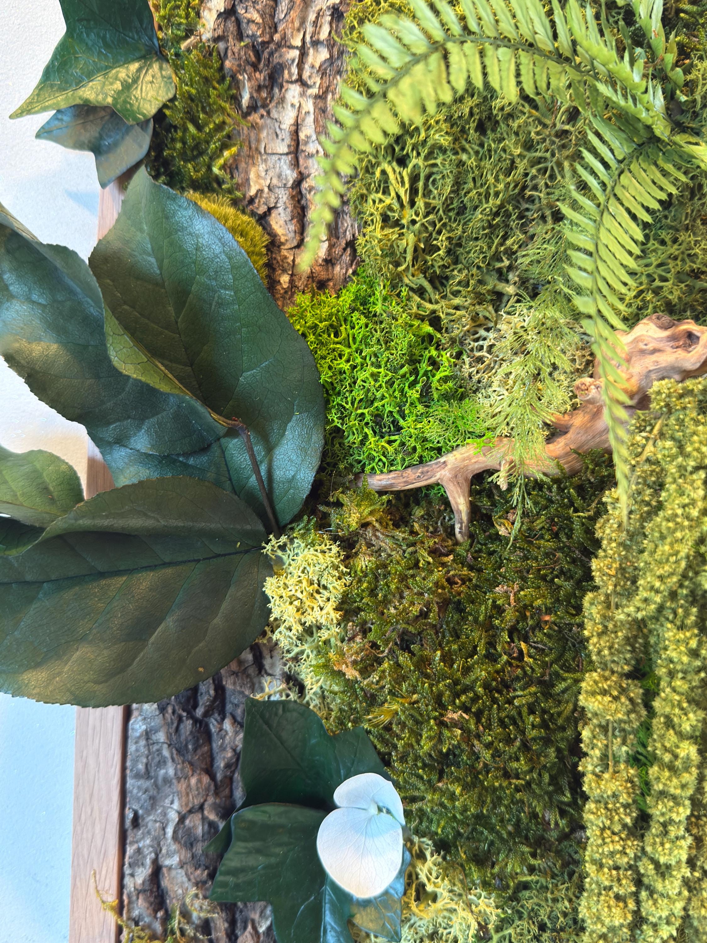 Réalisé à la main, il associe écorce naturelle, mousses stabilisées, fougères et feuillages stabilisés pour une décoration murale durable, sans aucun entretien.