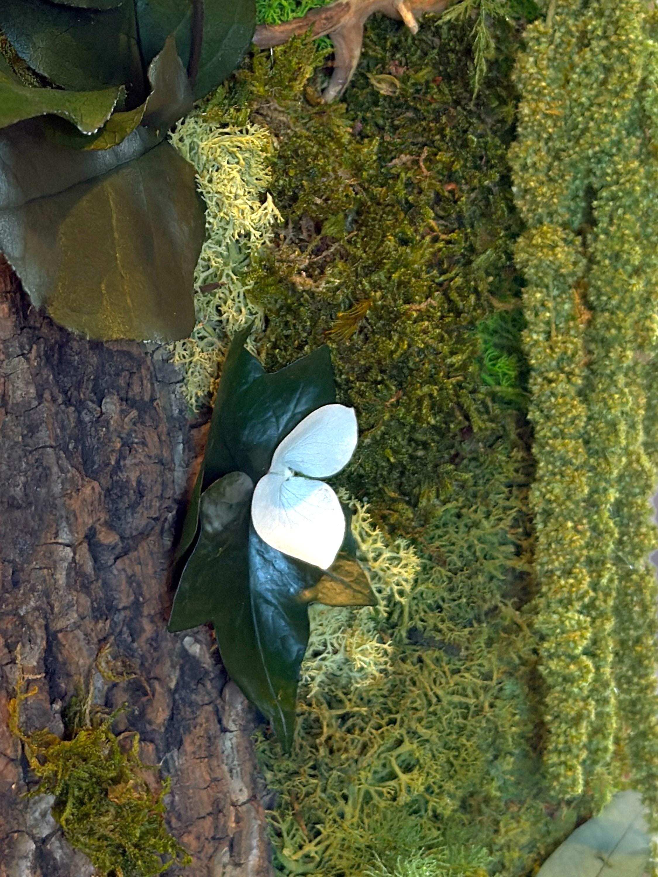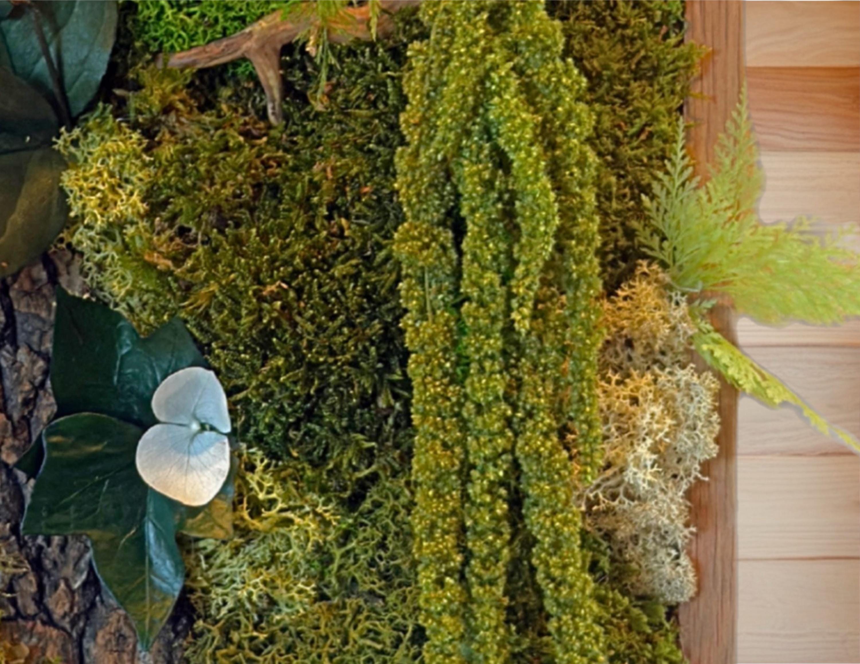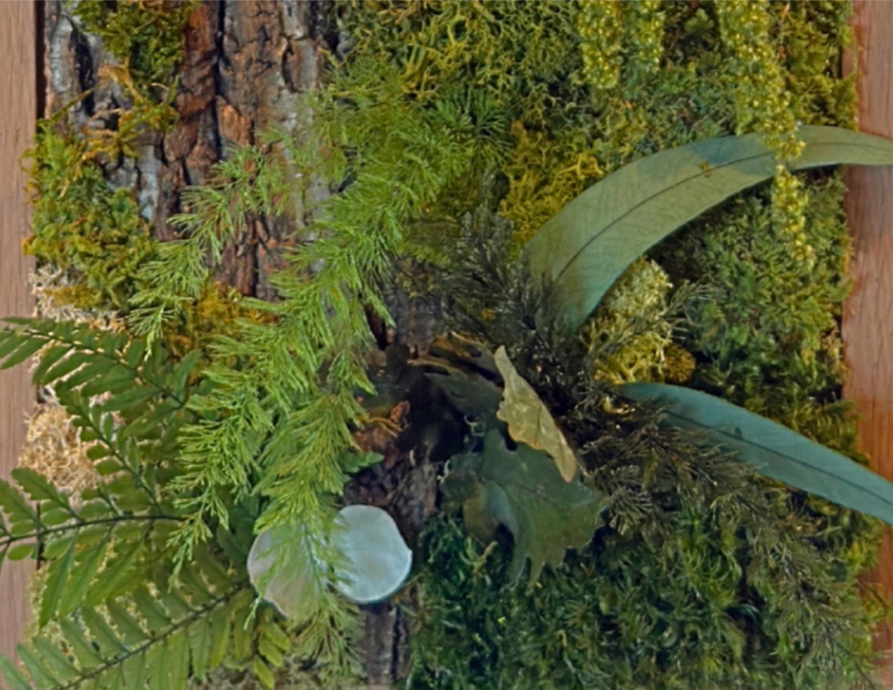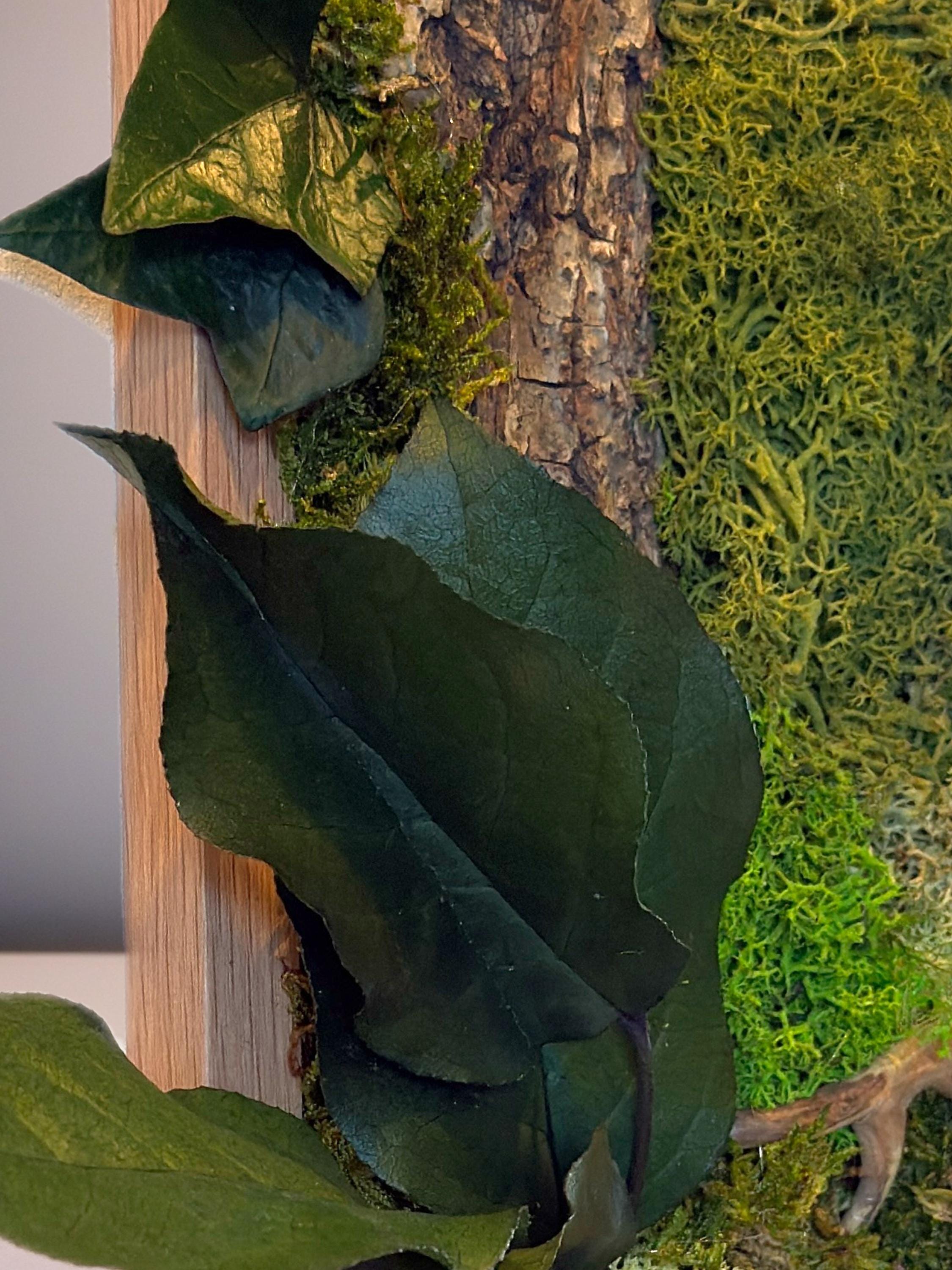 Réalisé à la main, il associe écorce naturelle, mousses stabilisées, fougères et feuillages stabilisés pour une décoration murale durable, sans aucun entretien.
