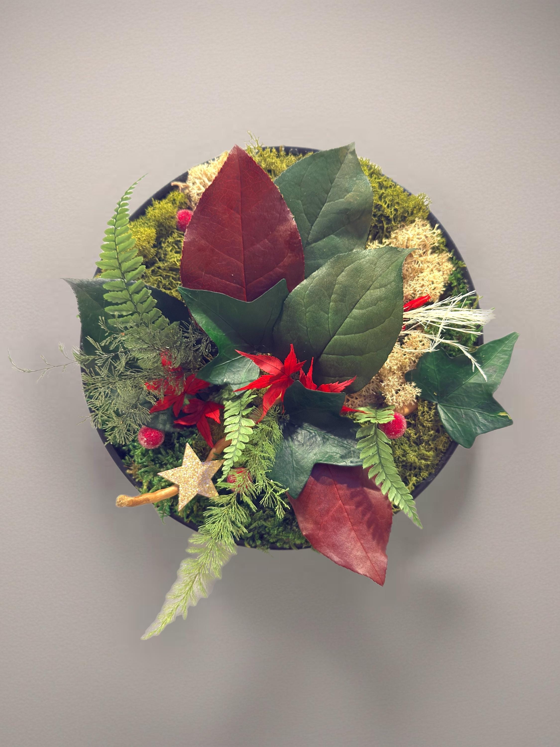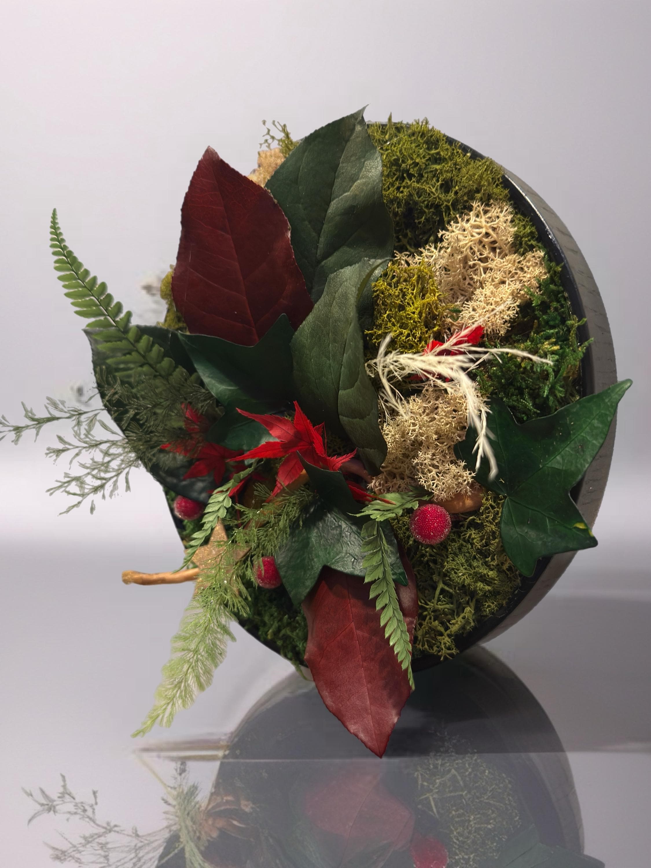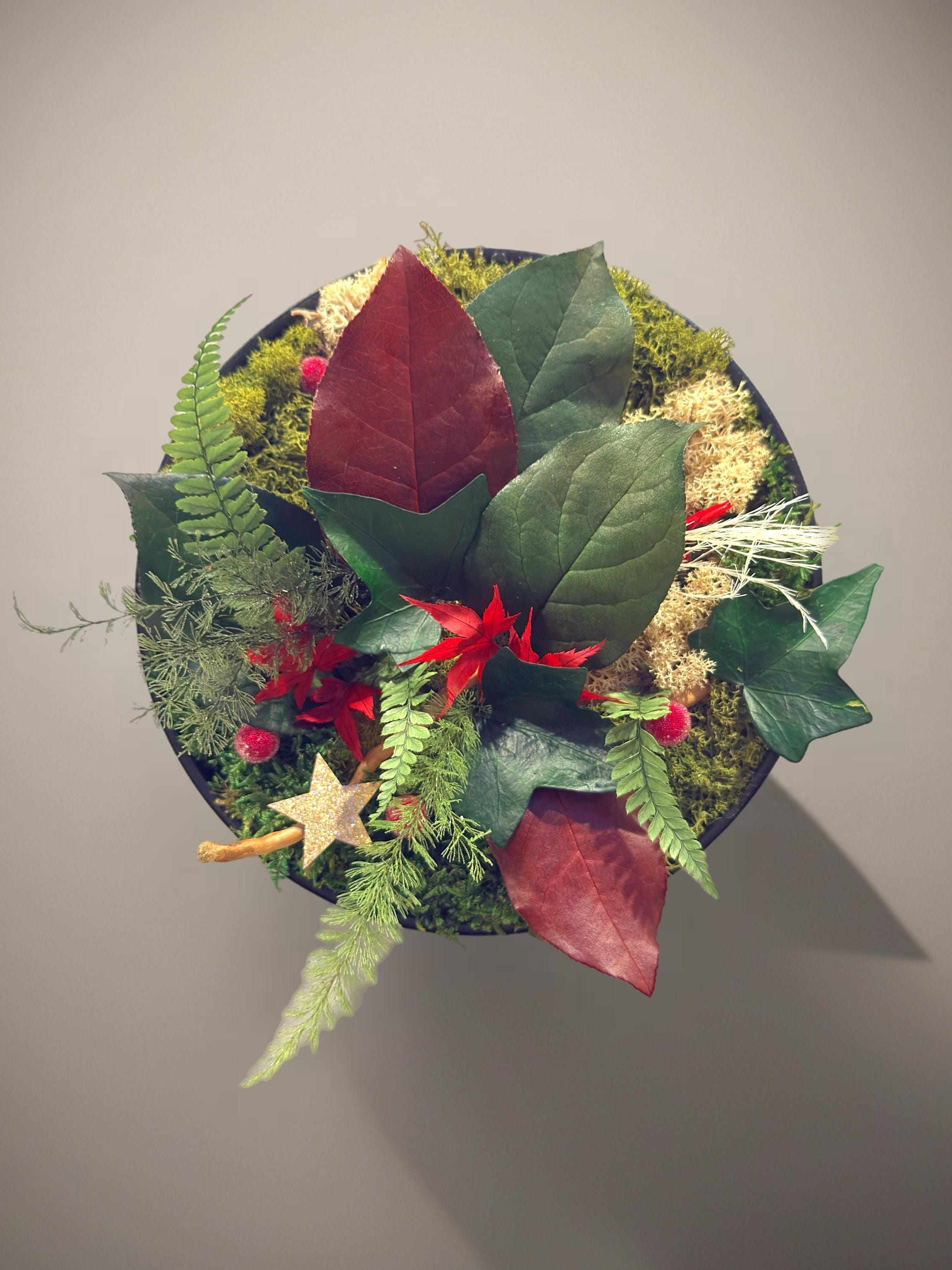 • Plantes stabilisées naturelles : mousse plate, mousse boule, lichen, bear grass, brightgrass, feuillage de cyprès stabilisé