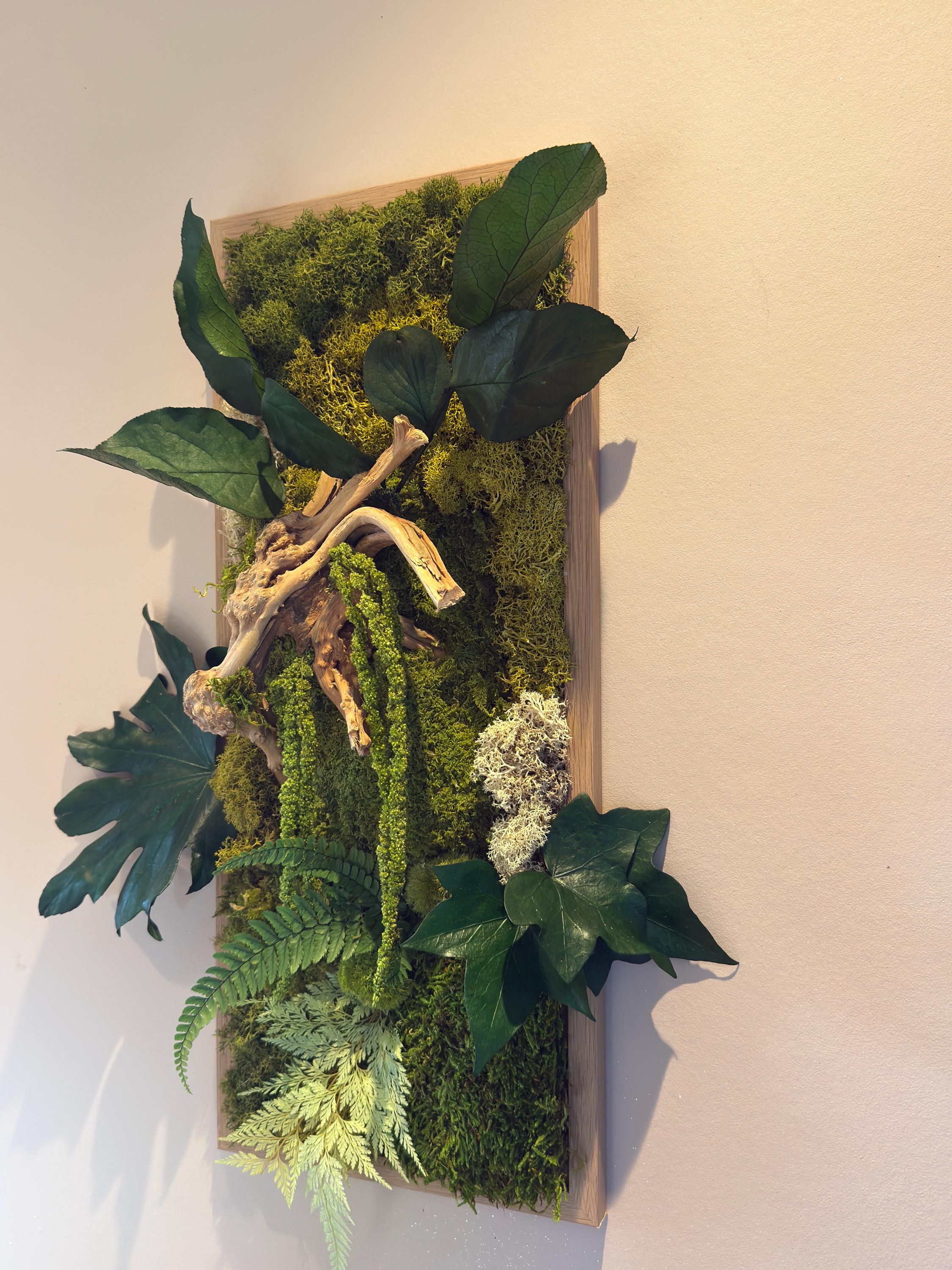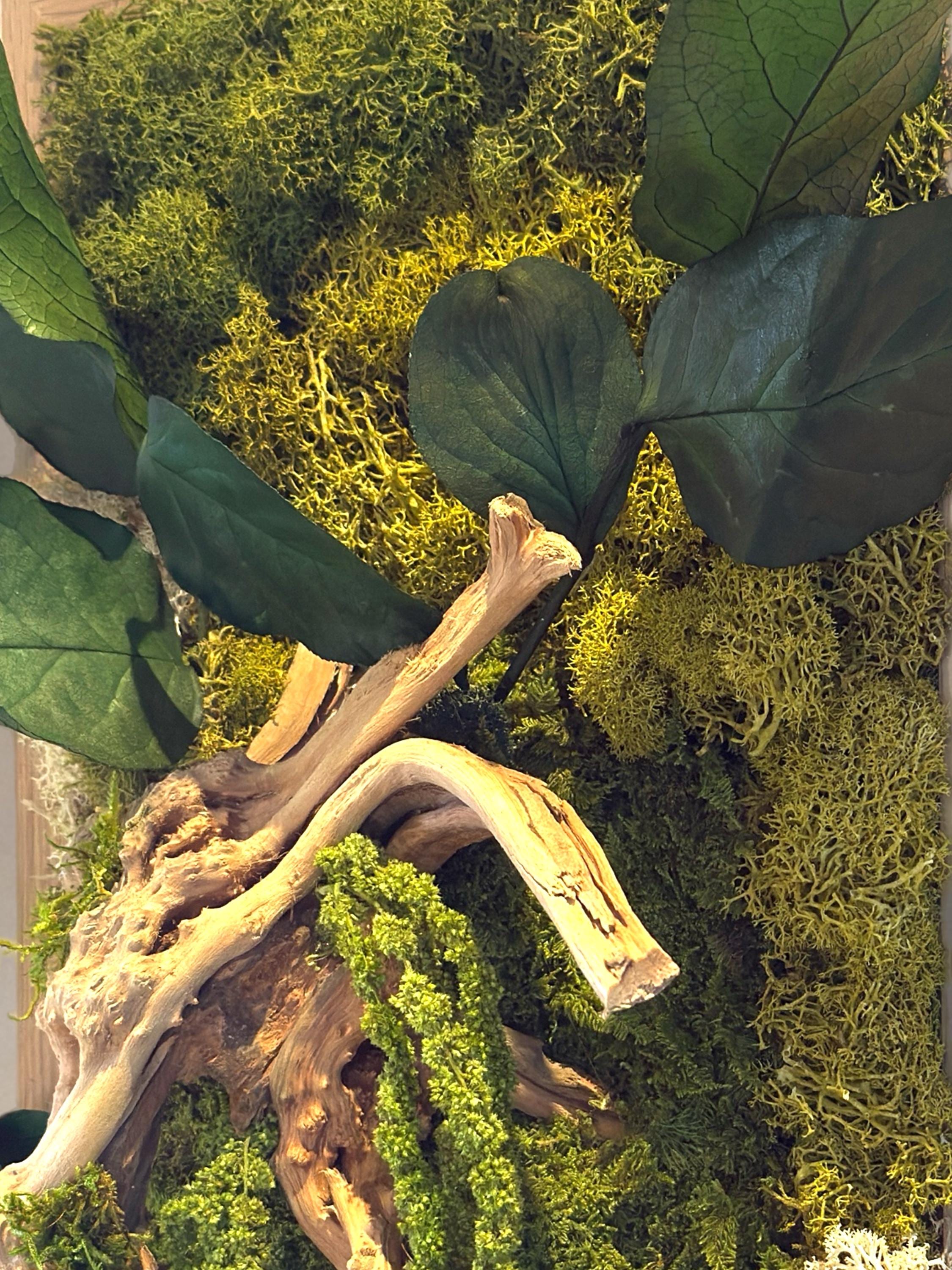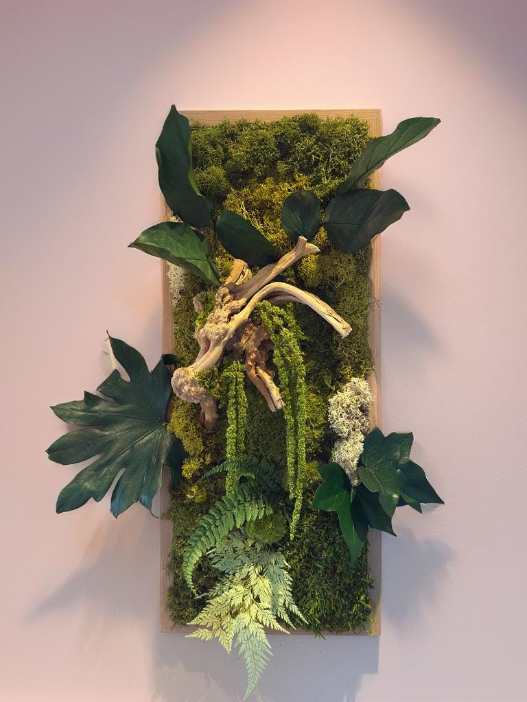 RĂ©alisĂ© Ă la main dans notre atelier Nature EncadrĂ©, il mĂȘle diffĂ©rentes mousses stabilisĂ©es, feuillages tropicaux et morceaux de bois flottĂ© pour un rendu organique, apaisant et design.