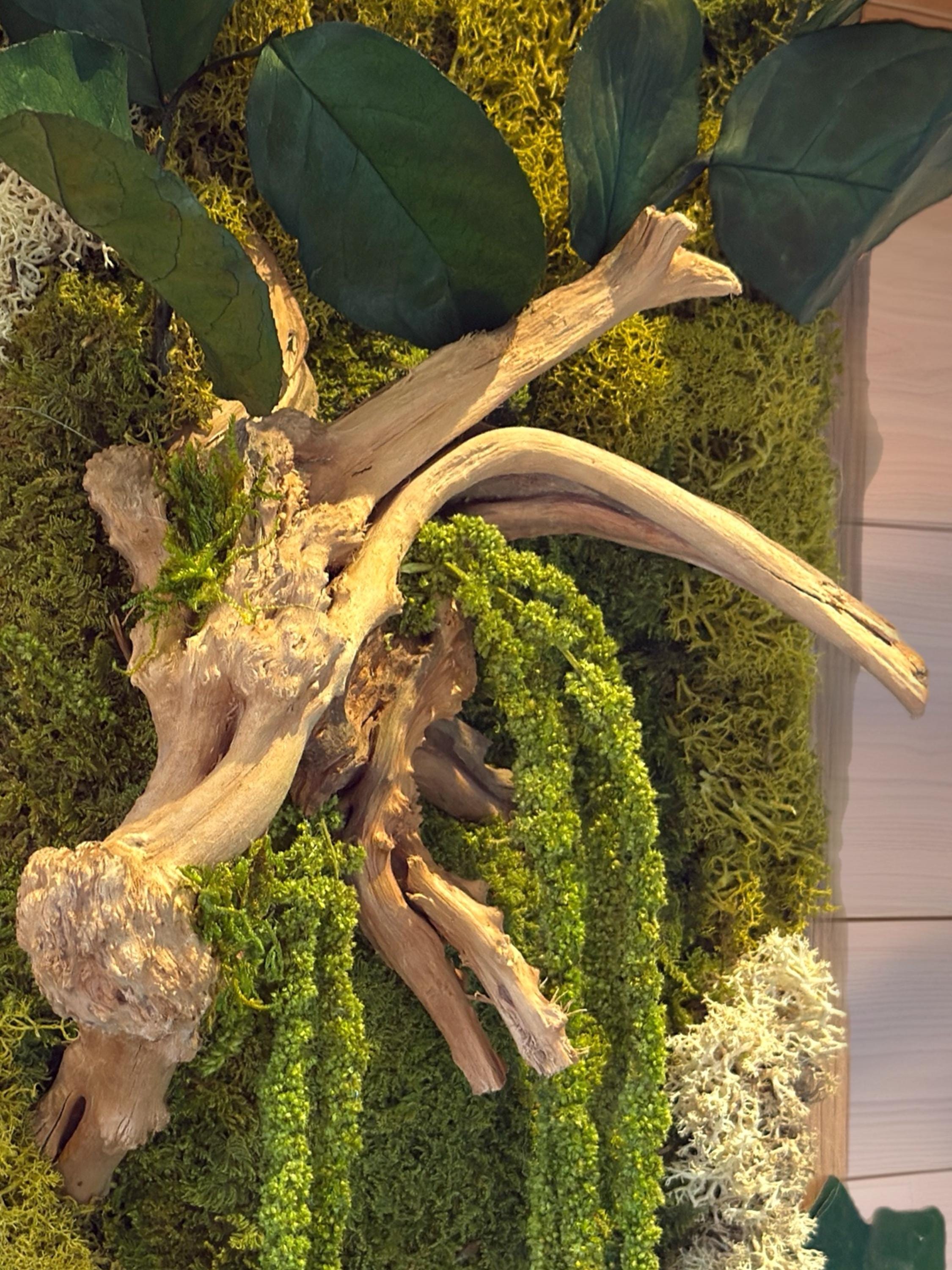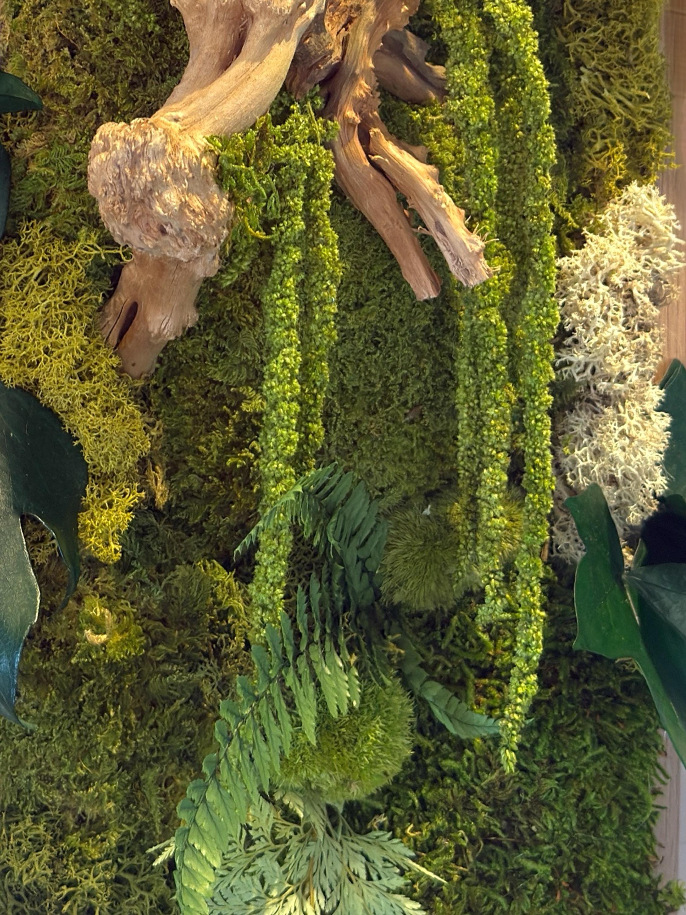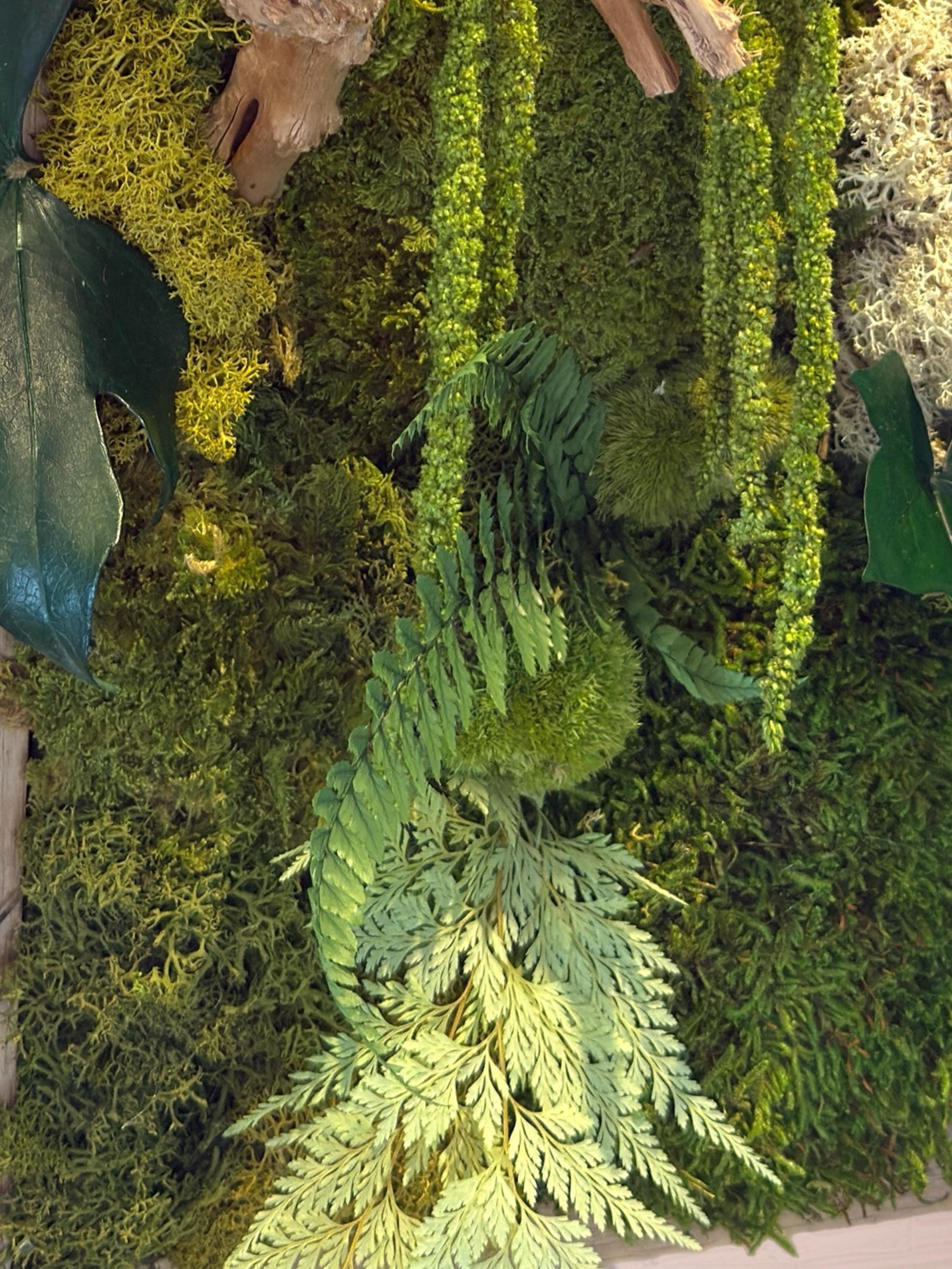 RĂ©alisĂ© Ă la main dans notre atelier Nature EncadrĂ©, il mĂȘle diffĂ©rentes mousses stabilisĂ©es, feuillages tropicaux et morceaux de bois flottĂ© pour un rendu organique, apaisant et design.