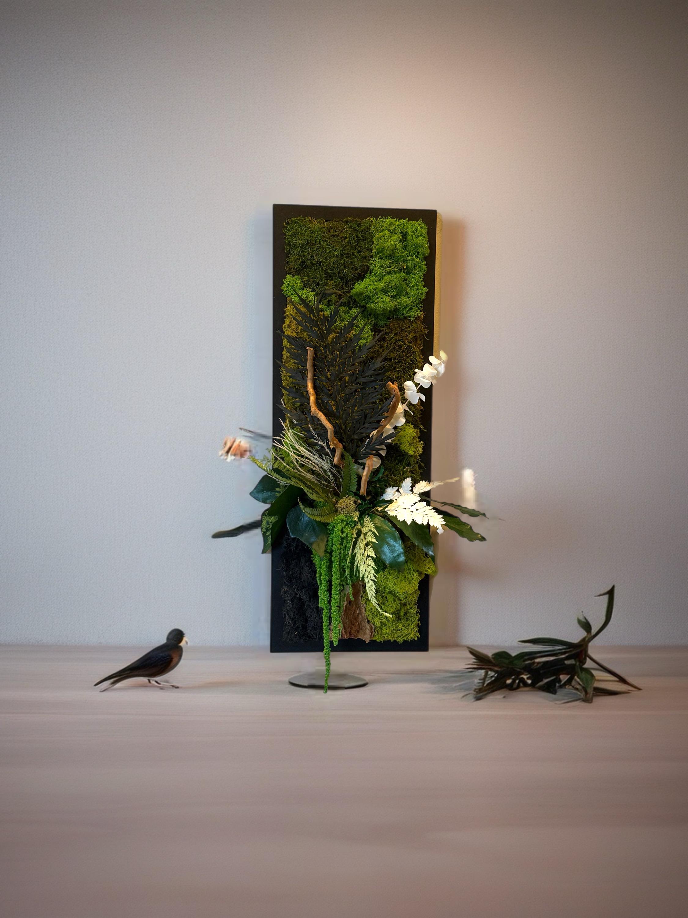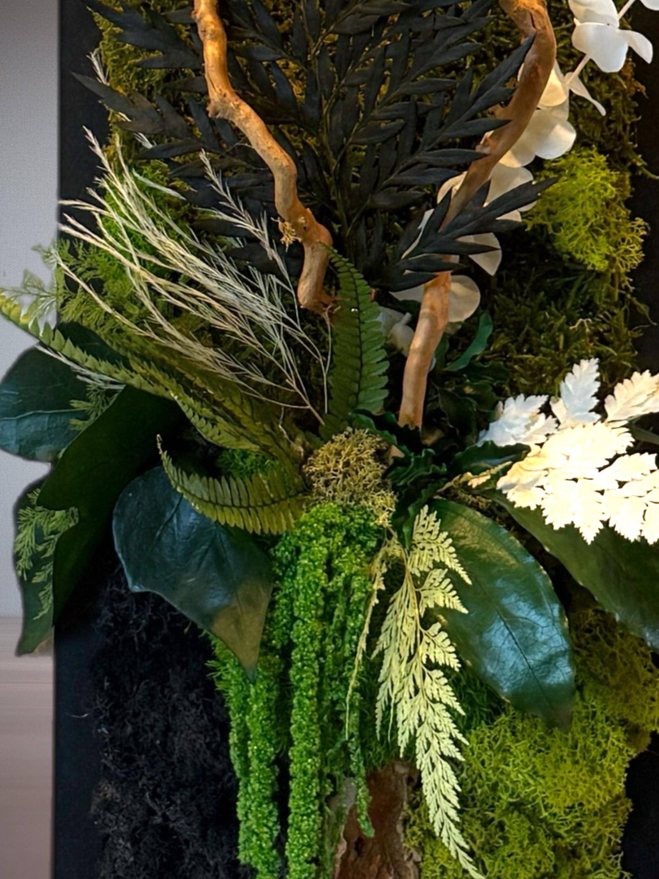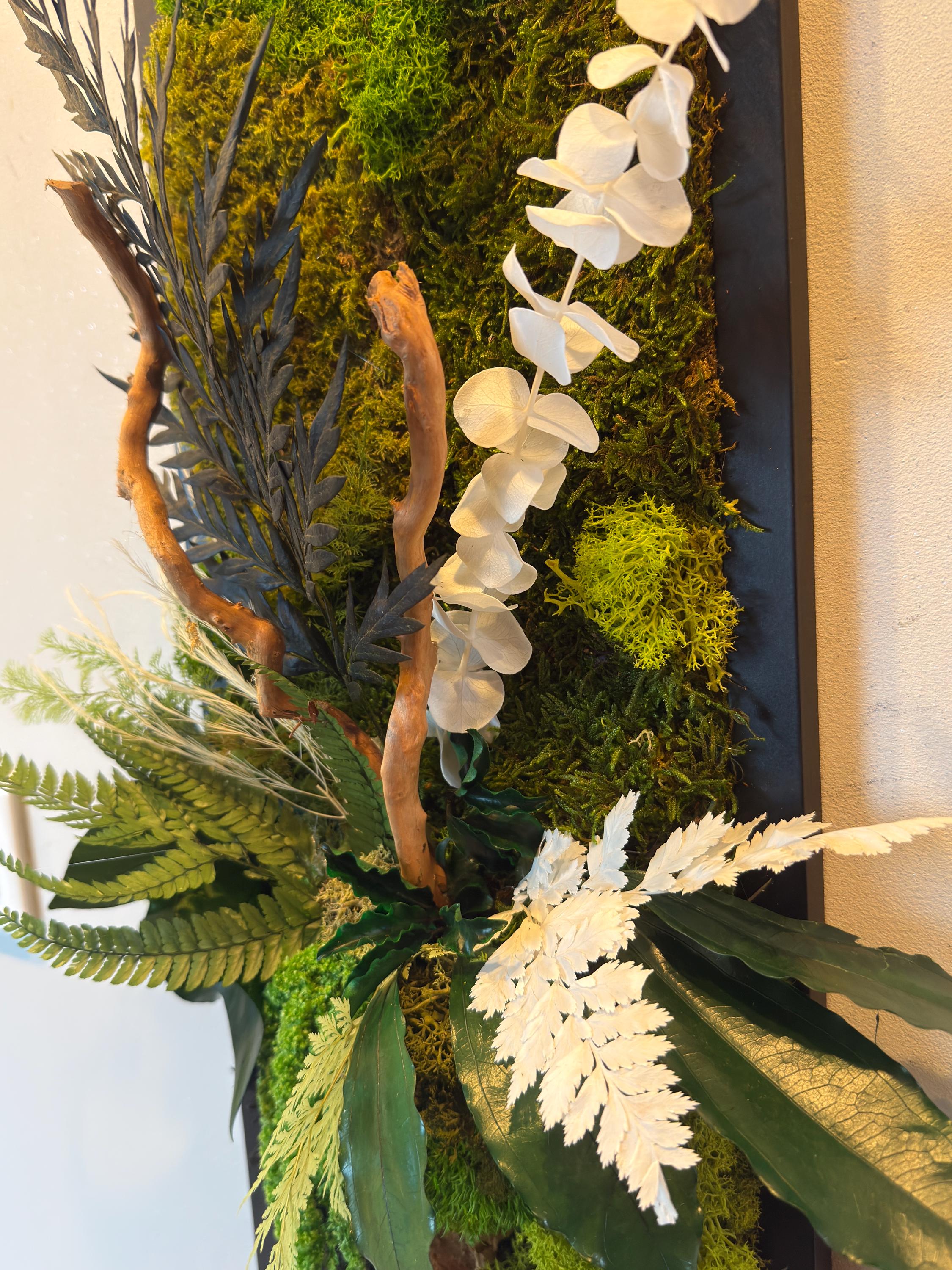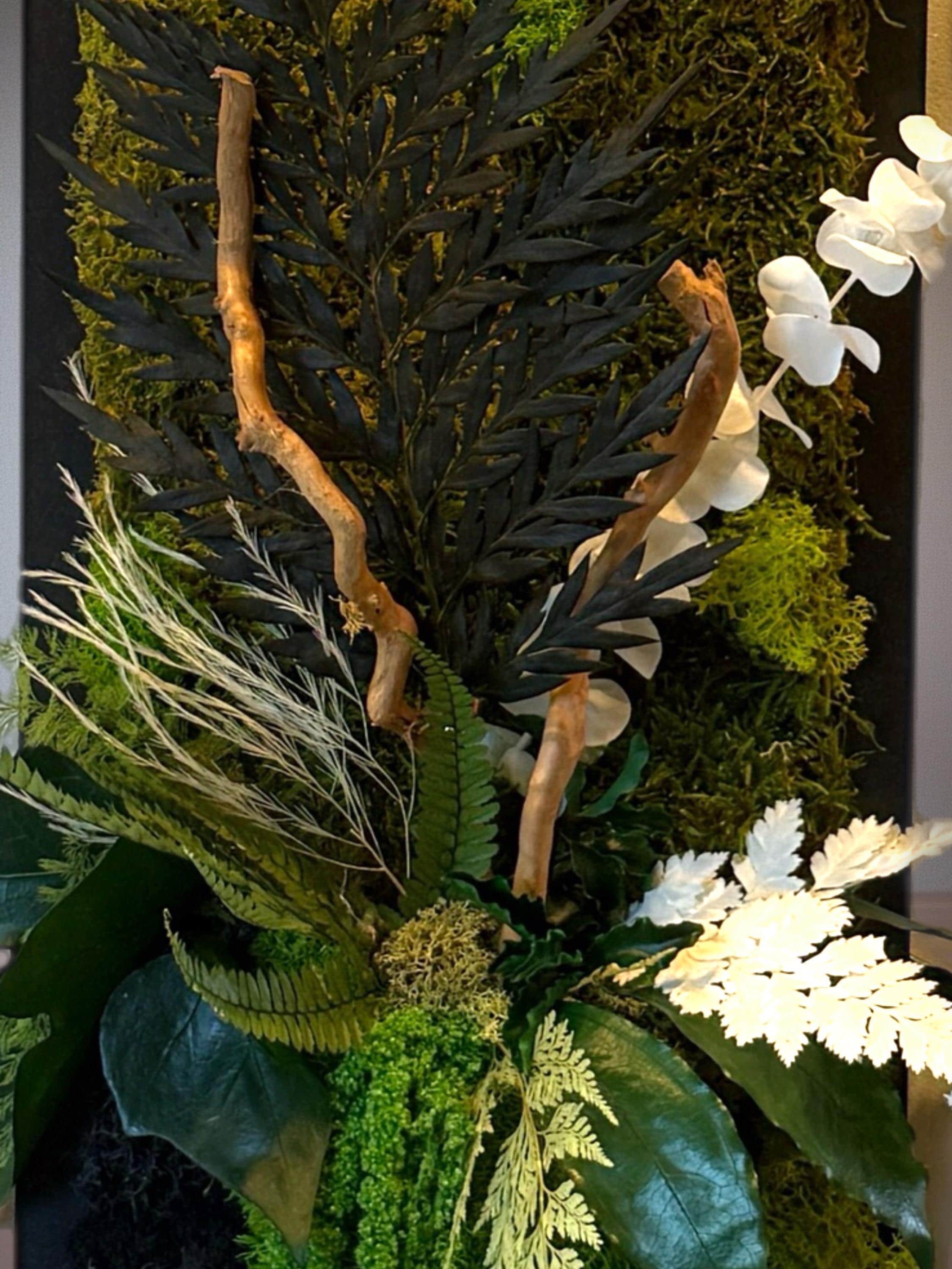 Chaque pièce est unique, réalisée dans l’atelier Nature Encadré avec soin et sens artistique, pour marier harmonieusement mousses, branches et feuillages.