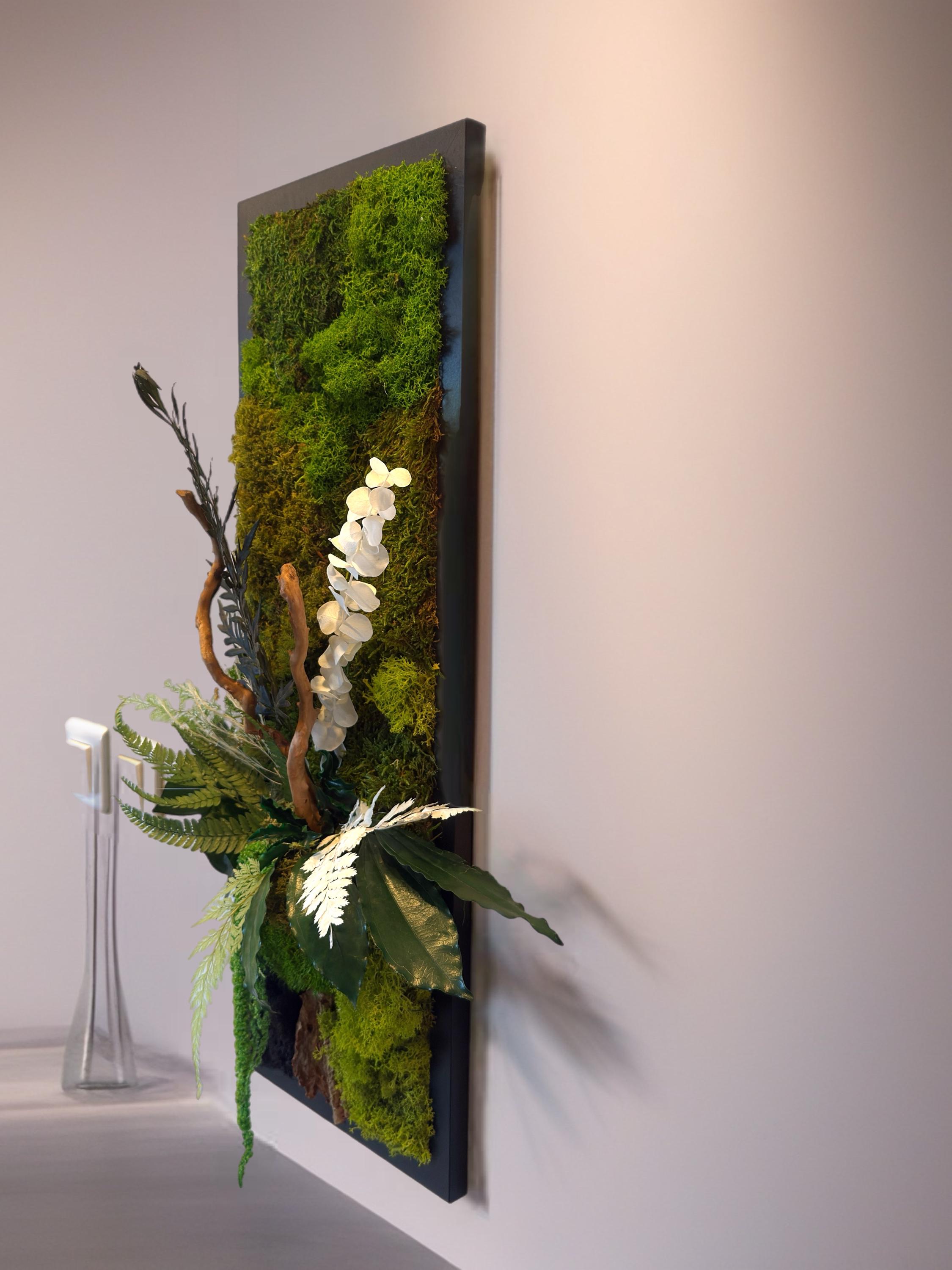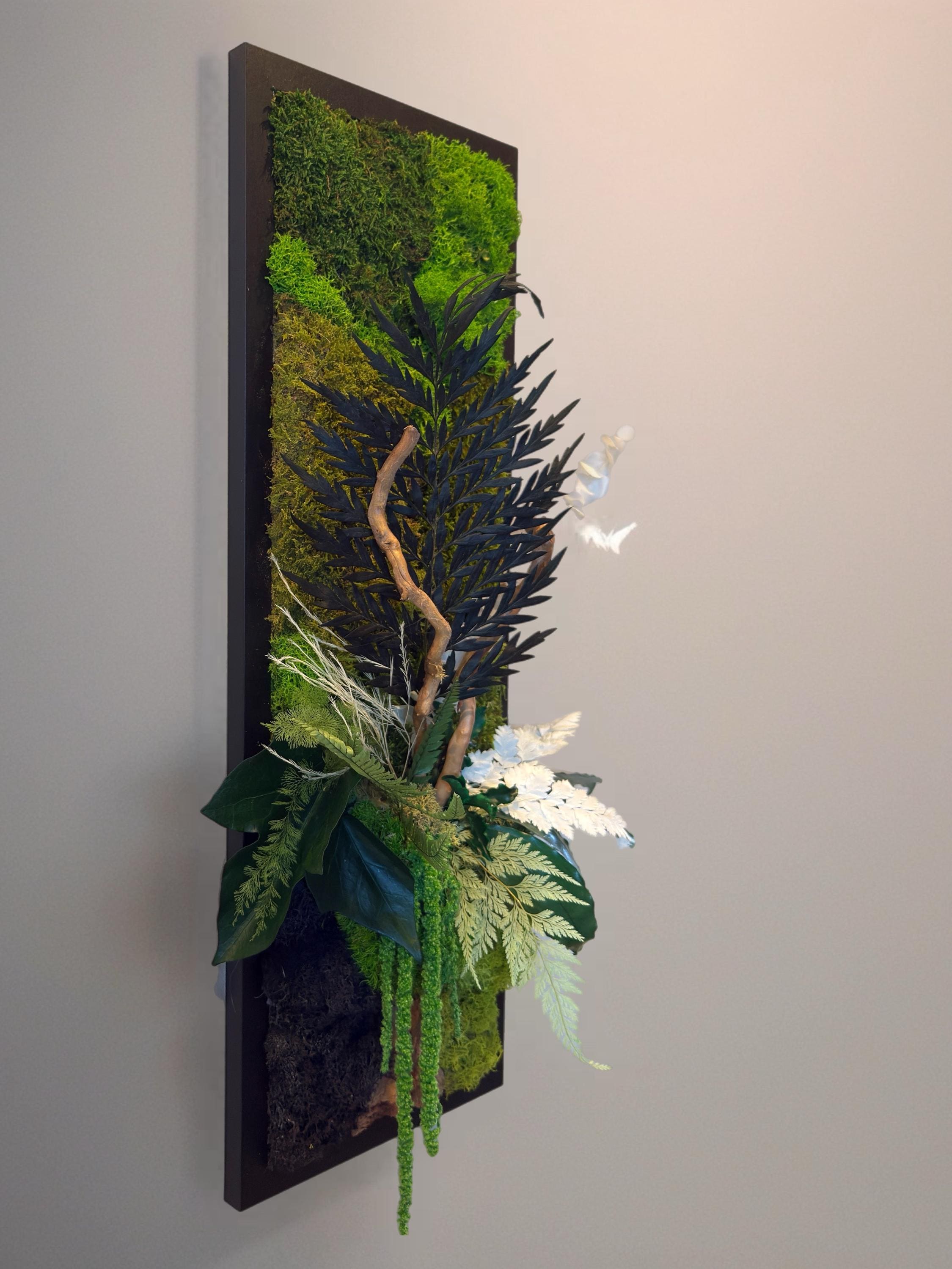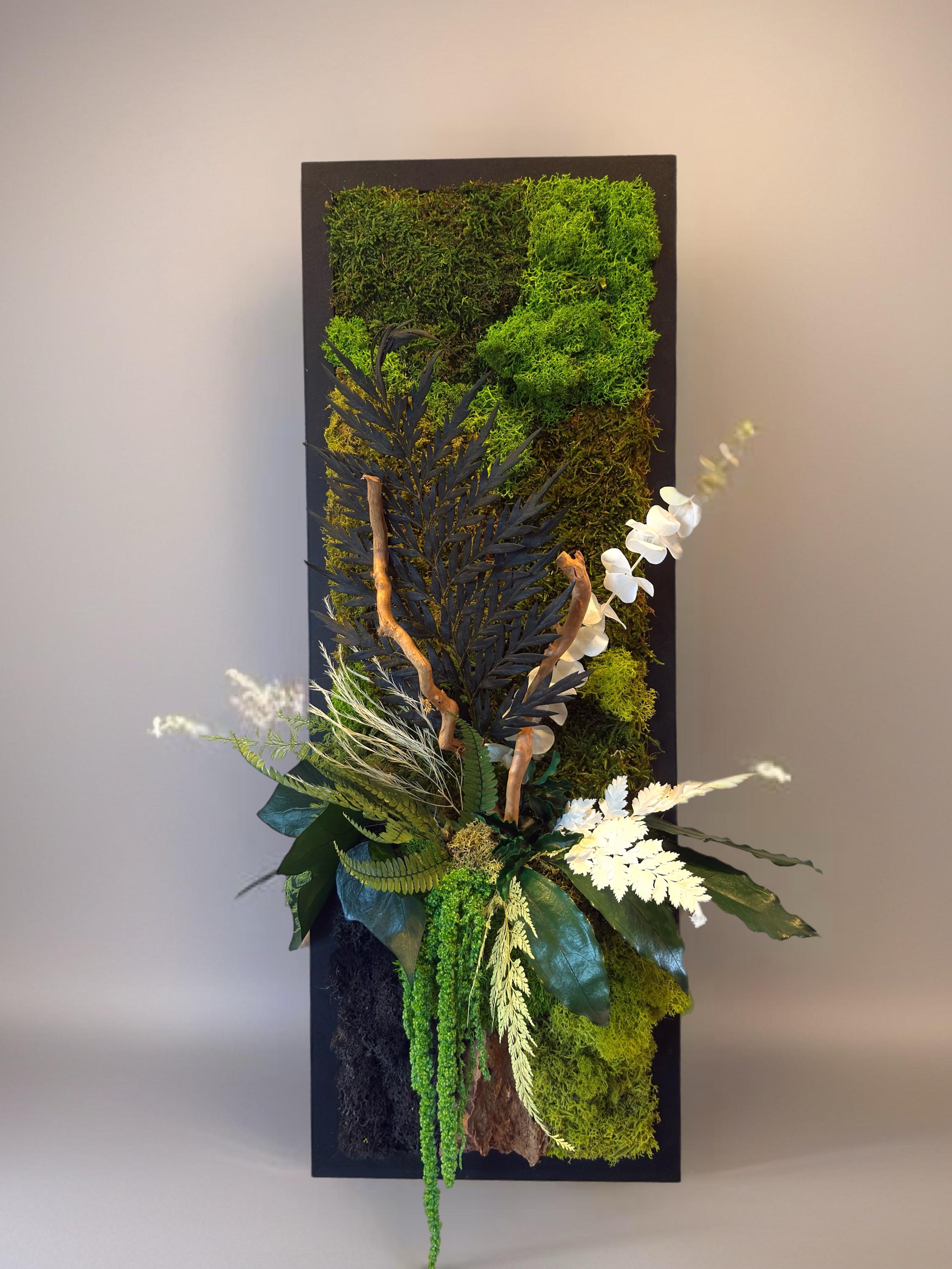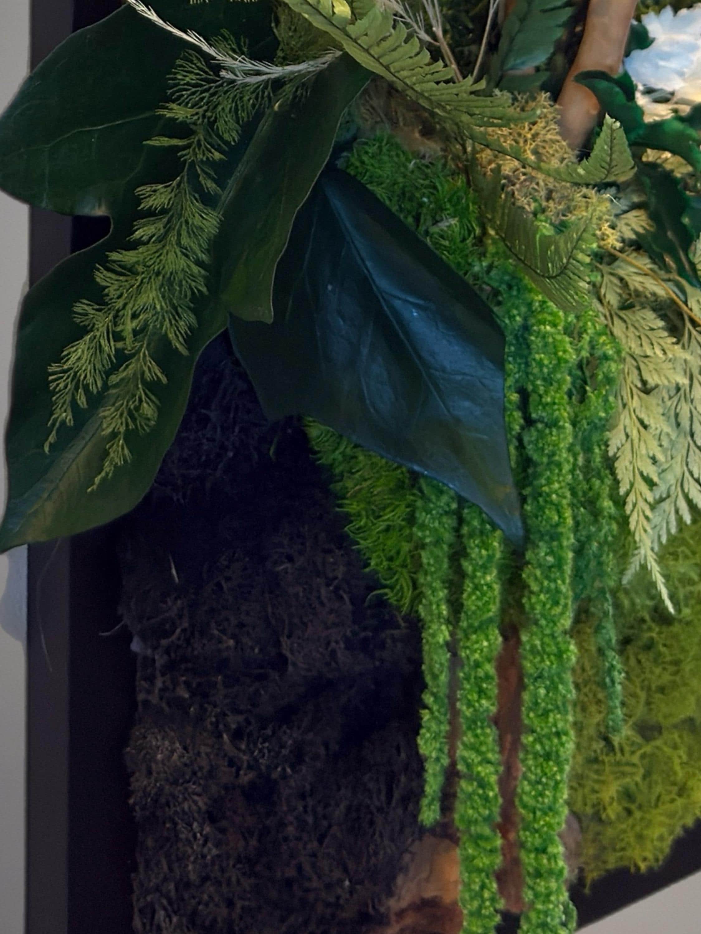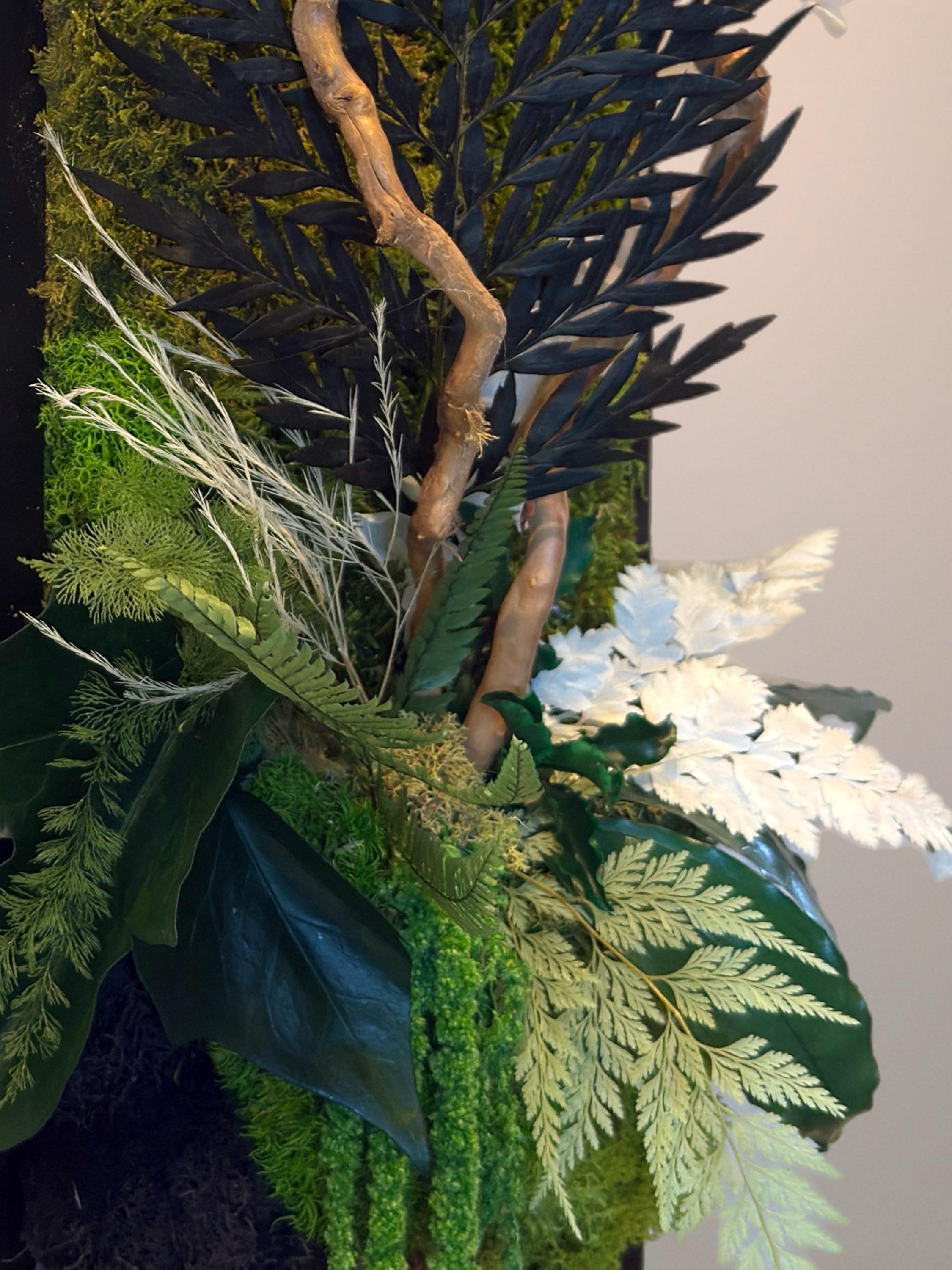 Chaque pièce est unique, réalisée dans l’atelier Nature Encadré avec soin et sens artistique, pour marier harmonieusement mousses, branches et feuillages.