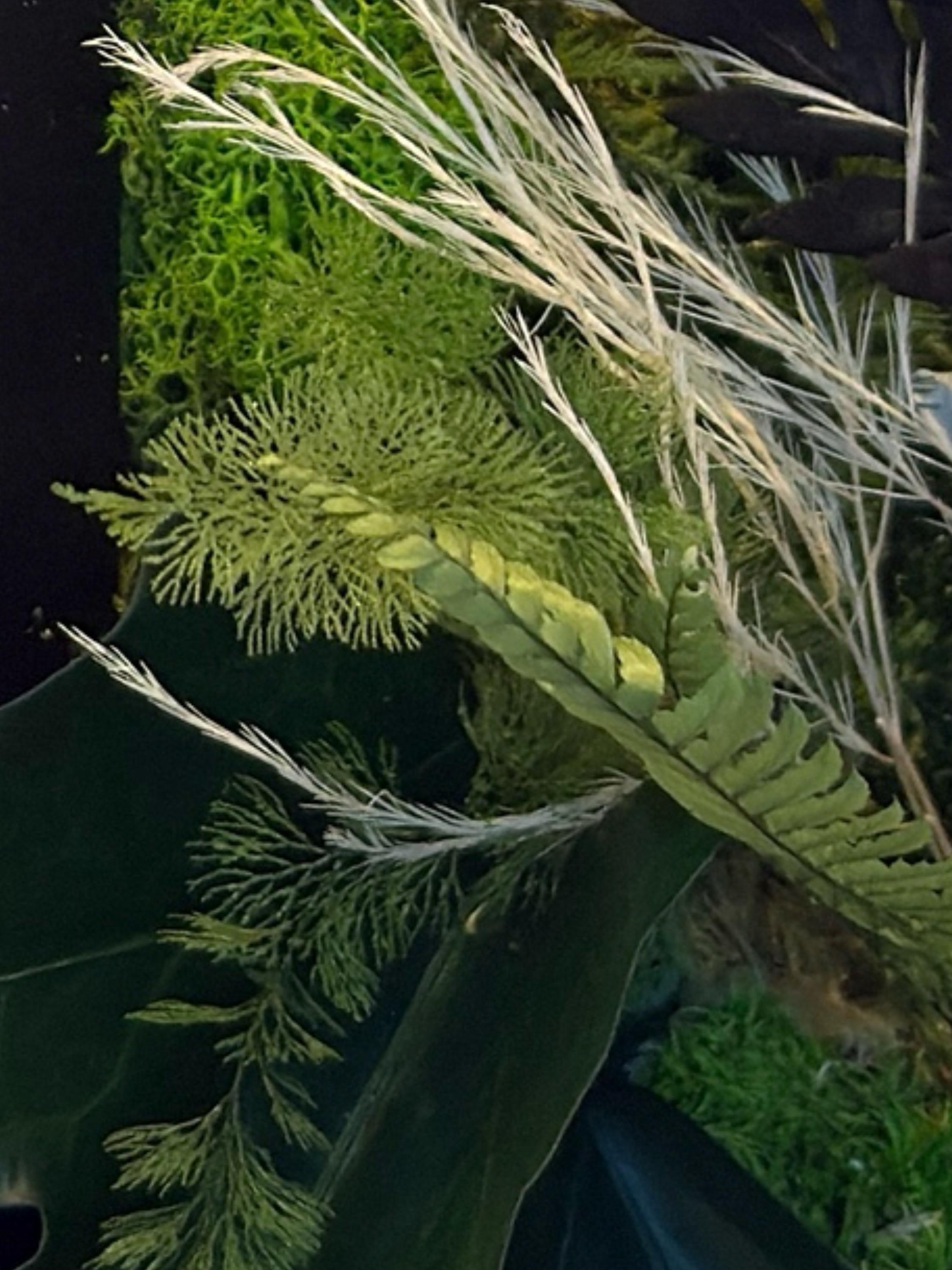 • Composition : mousse de forêt, mousse boule, lichen, fougères, eucalyptus, amarante, branches naturelles