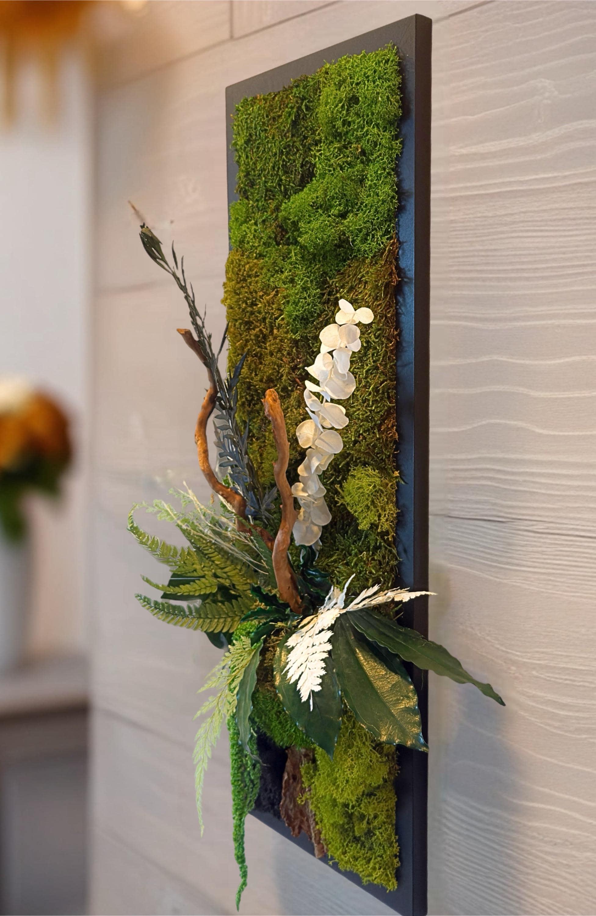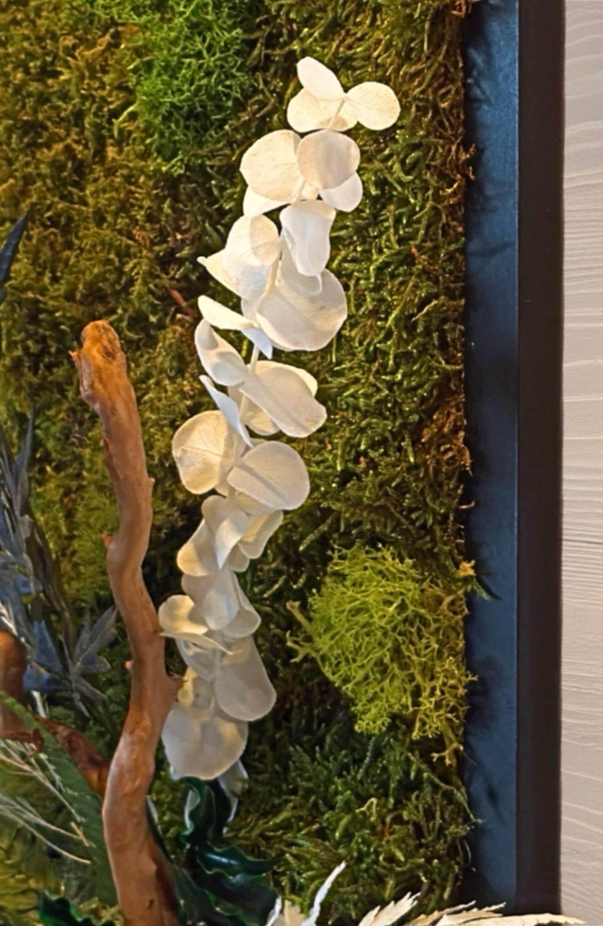 Apportez une touche de nature et d’élégance à votre intérieur avec ce cadre végétal fait main, composé de mousses et de feuillages stabilisés haut de gamme.
