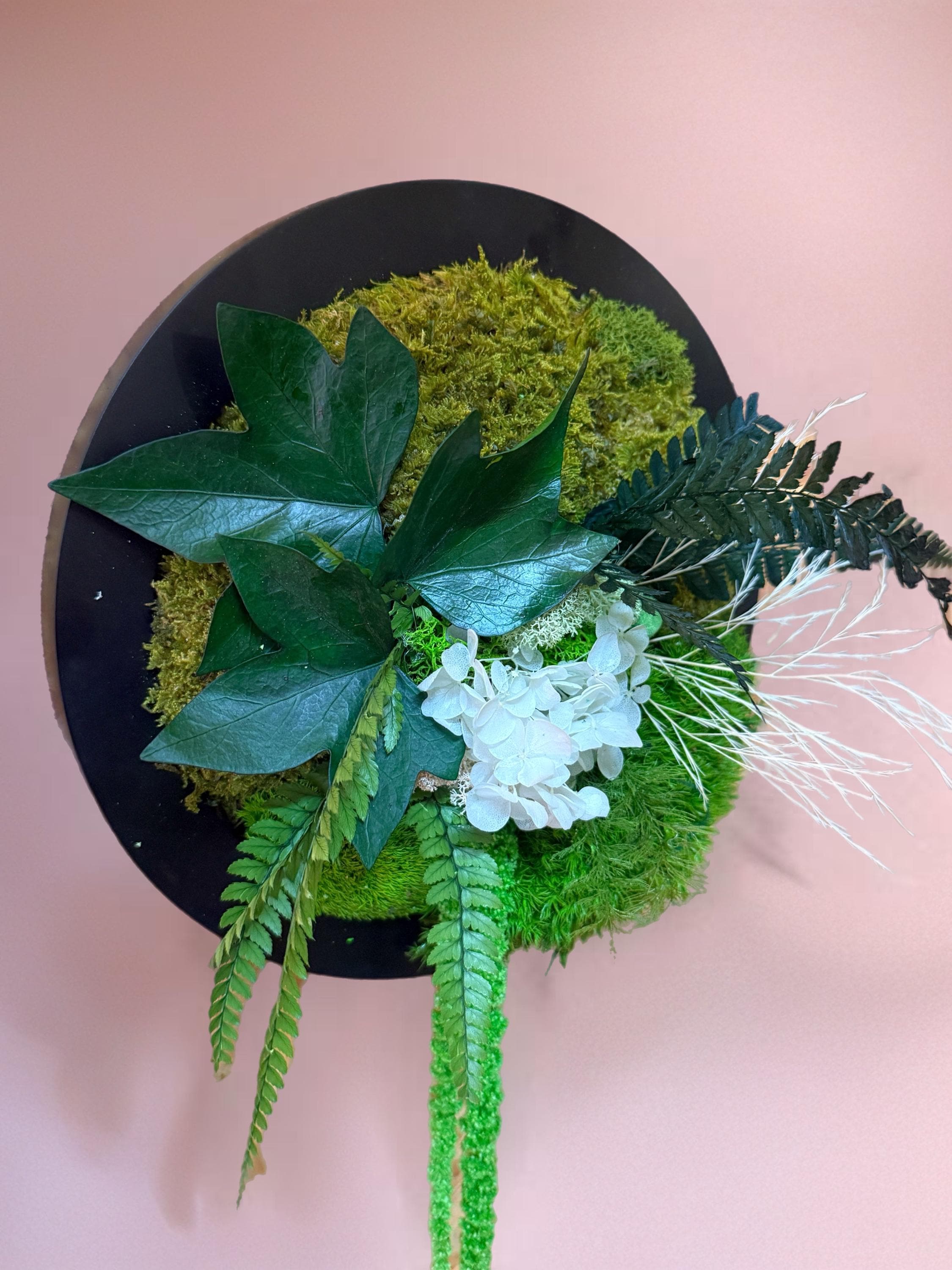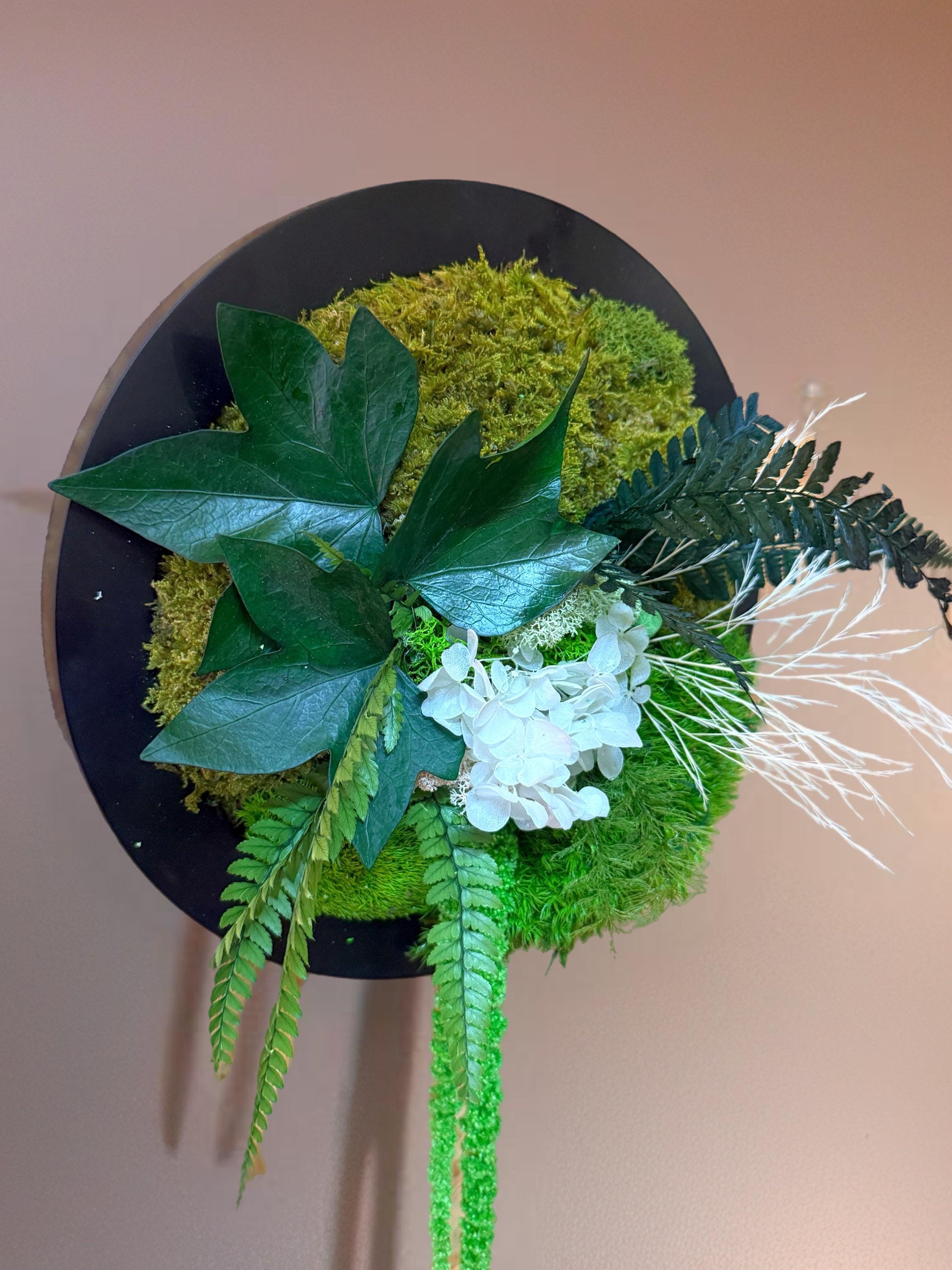 Réalisé à la main dans notre atelier des Hauts-de-France, ce tableau mêle harmonieusement mousses, fougères et feuillages stabilisés, sublimés par une hortensia blanche et des tiges retombantes d’amarante verte.