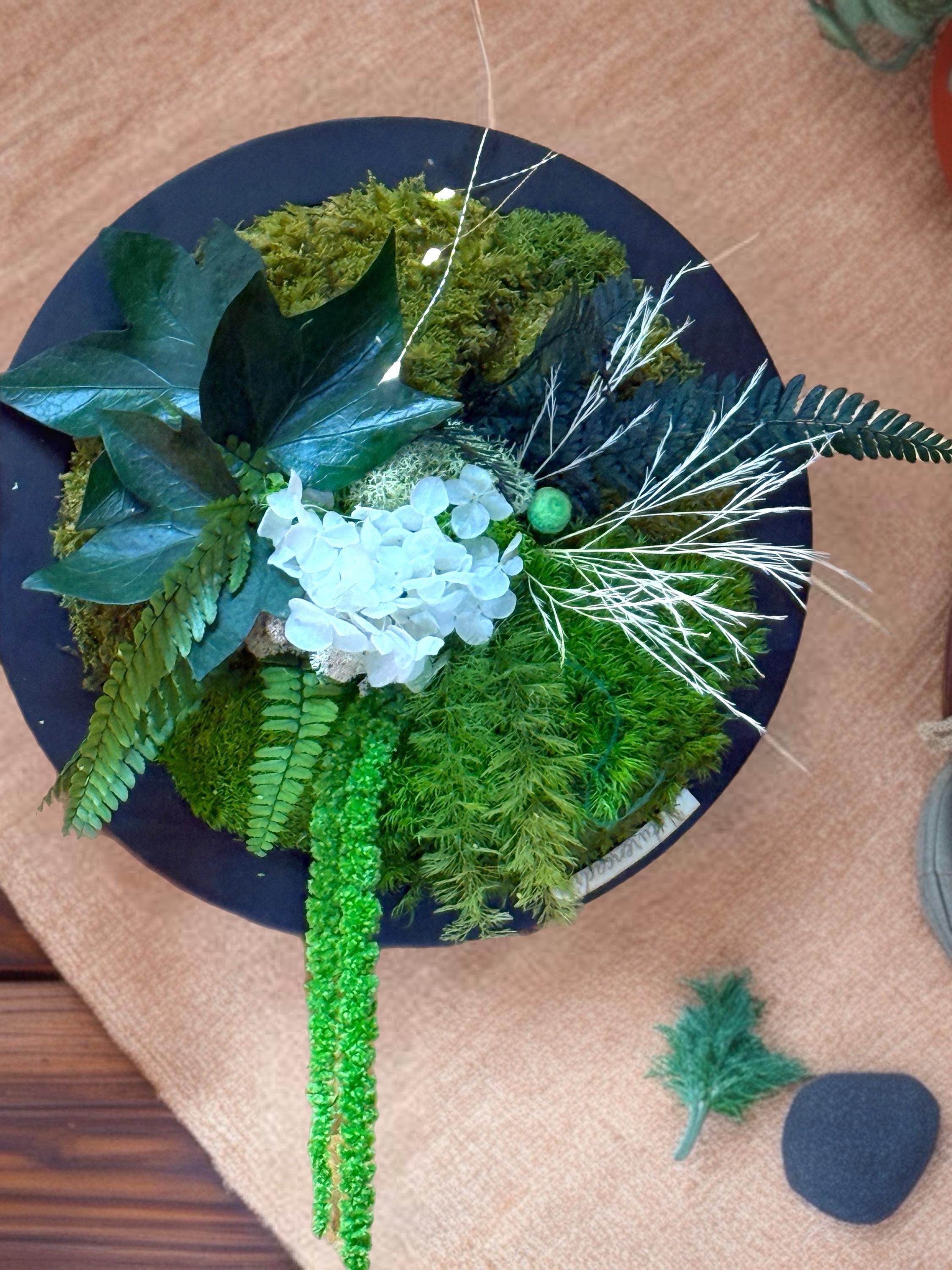 • Composition végétale : mousse de renne, mousse boule, fougères, aralia, graminées, amarante retombante, hortensia blanc