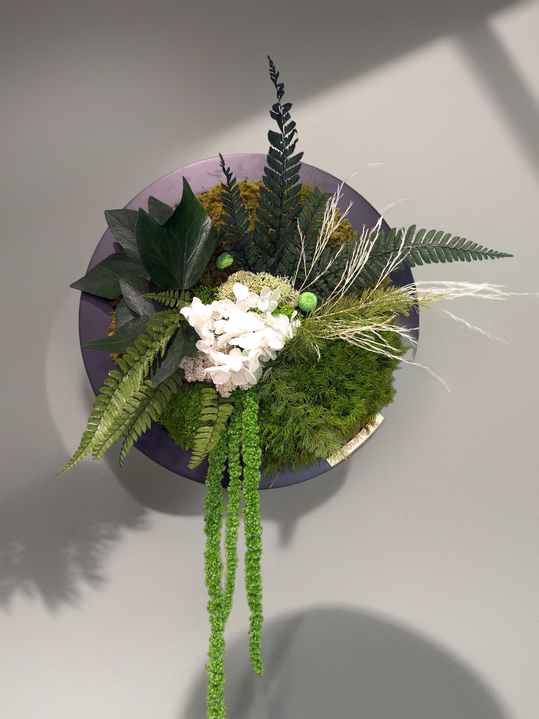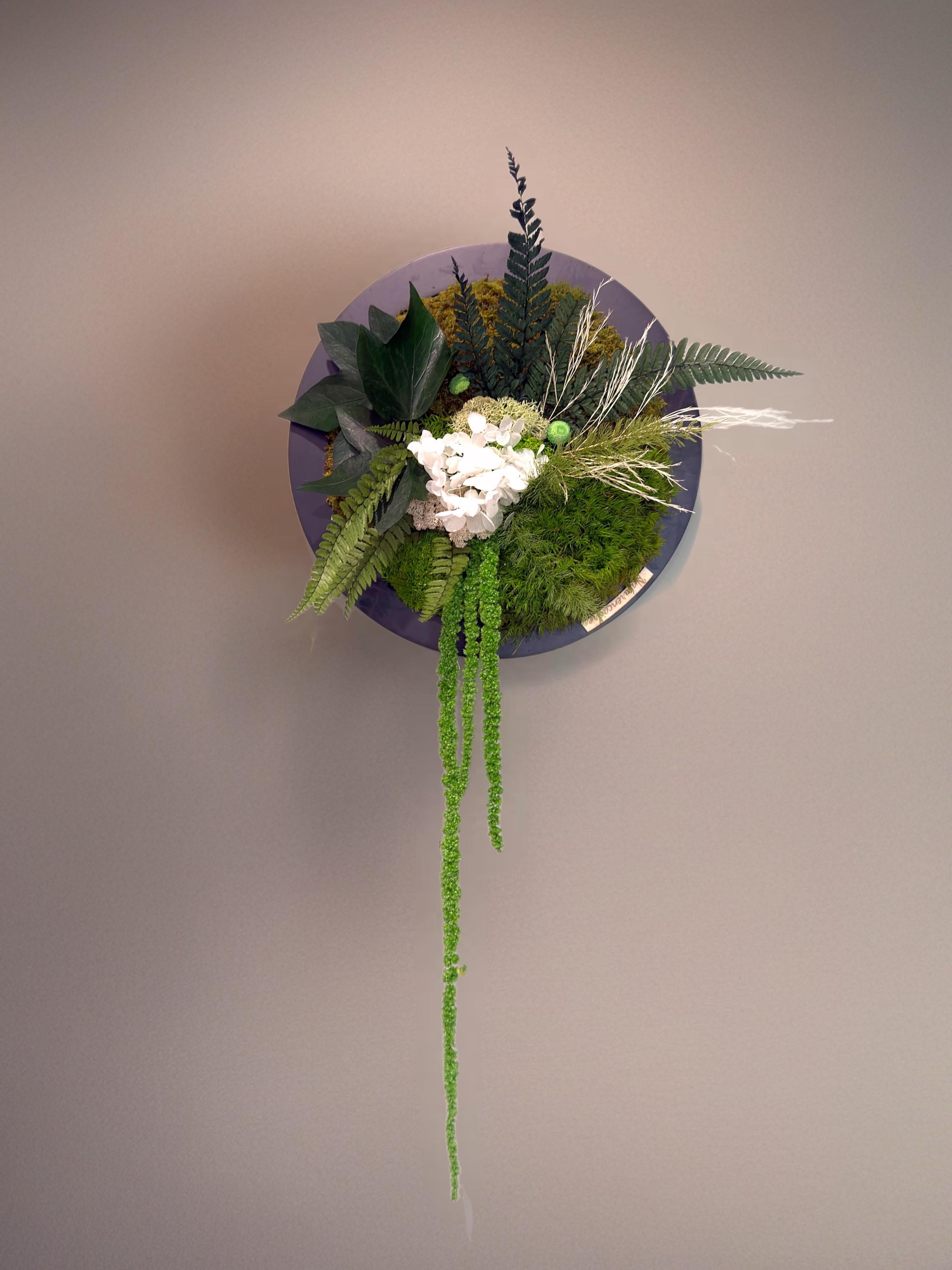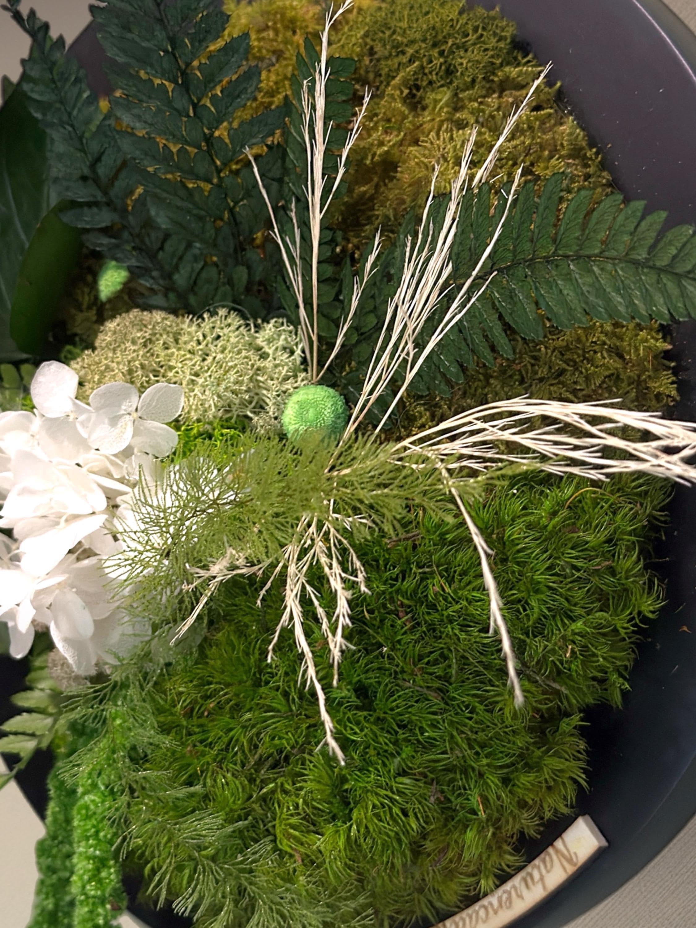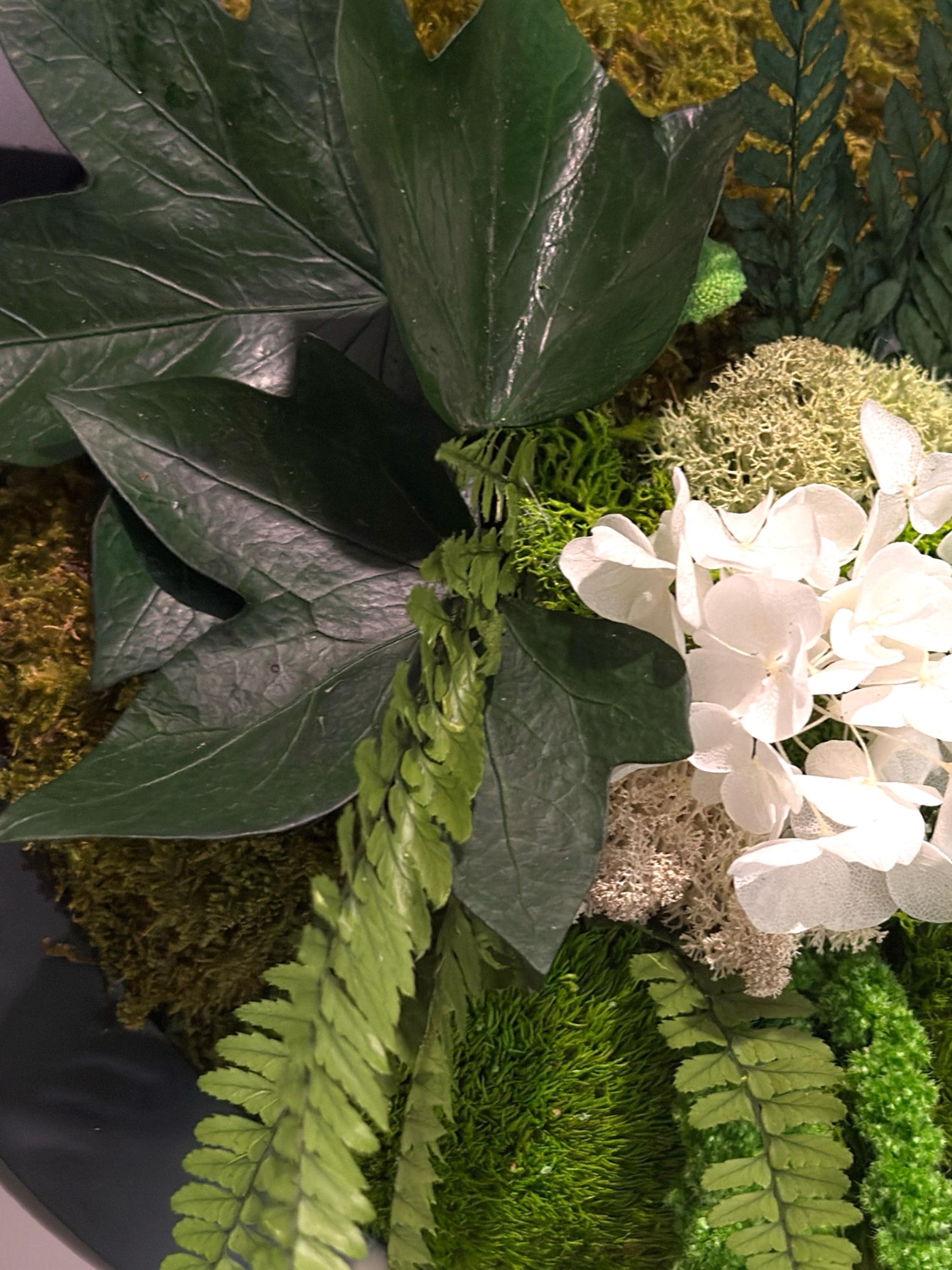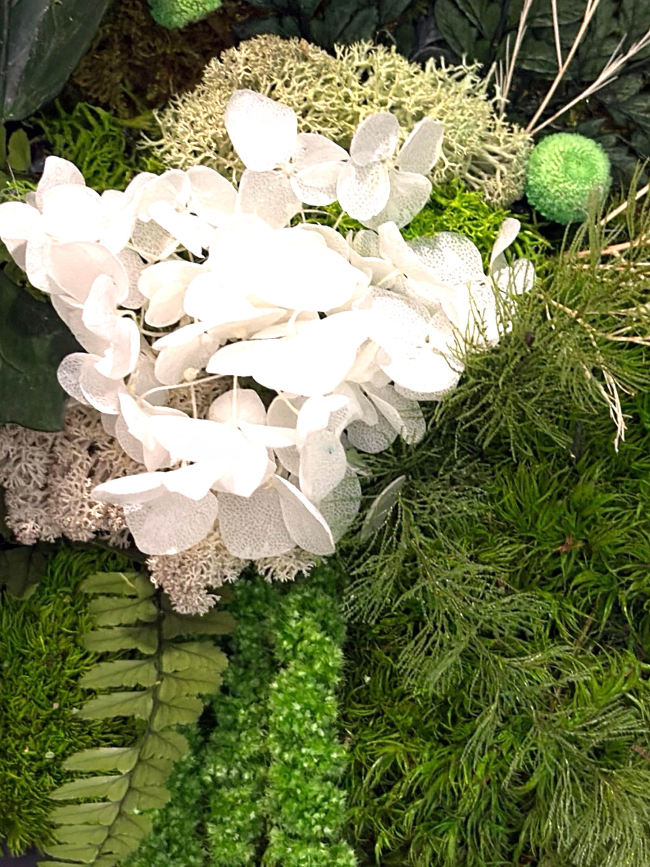 Réalisé à la main dans notre atelier des Hauts-de-France, ce tableau mêle harmonieusement mousses, fougères et feuillages stabilisés, sublimés par une hortensia blanche et des tiges retombantes d’amarante verte.