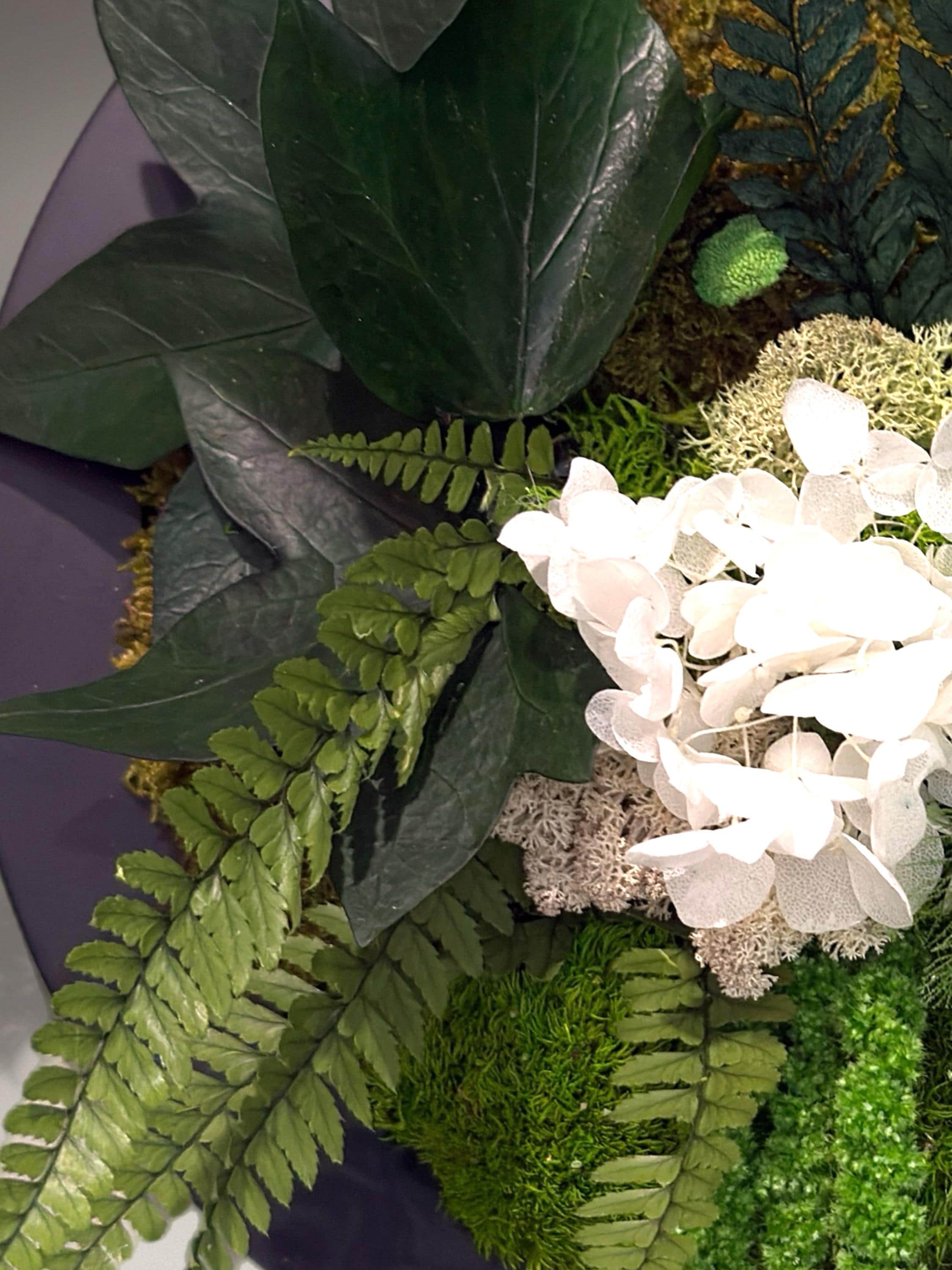 • Composition végétale : mousse de renne, mousse boule, fougères, aralia, graminées, amarante retombante, hortensia blanc