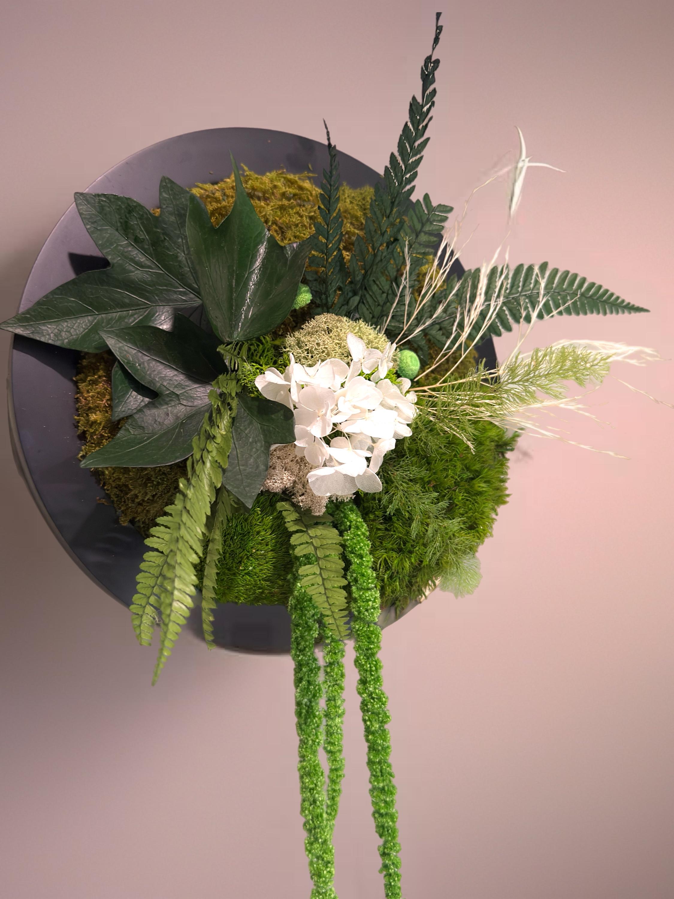 Chaque composition est pensée comme une petite œuvre d’art naturelle : un mur végétal miniature, apaisant et durable, qui ne nécessite aucun entretien.