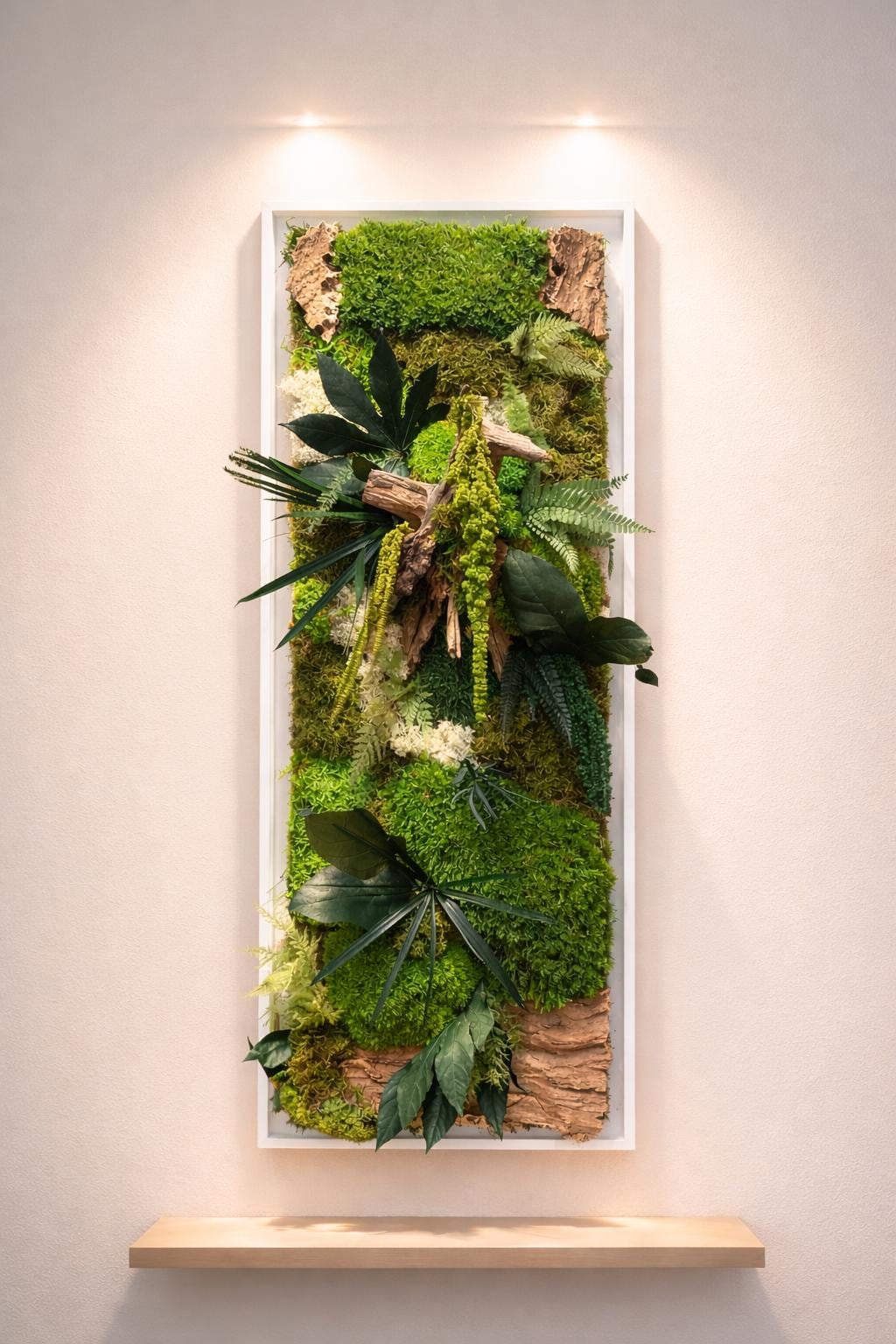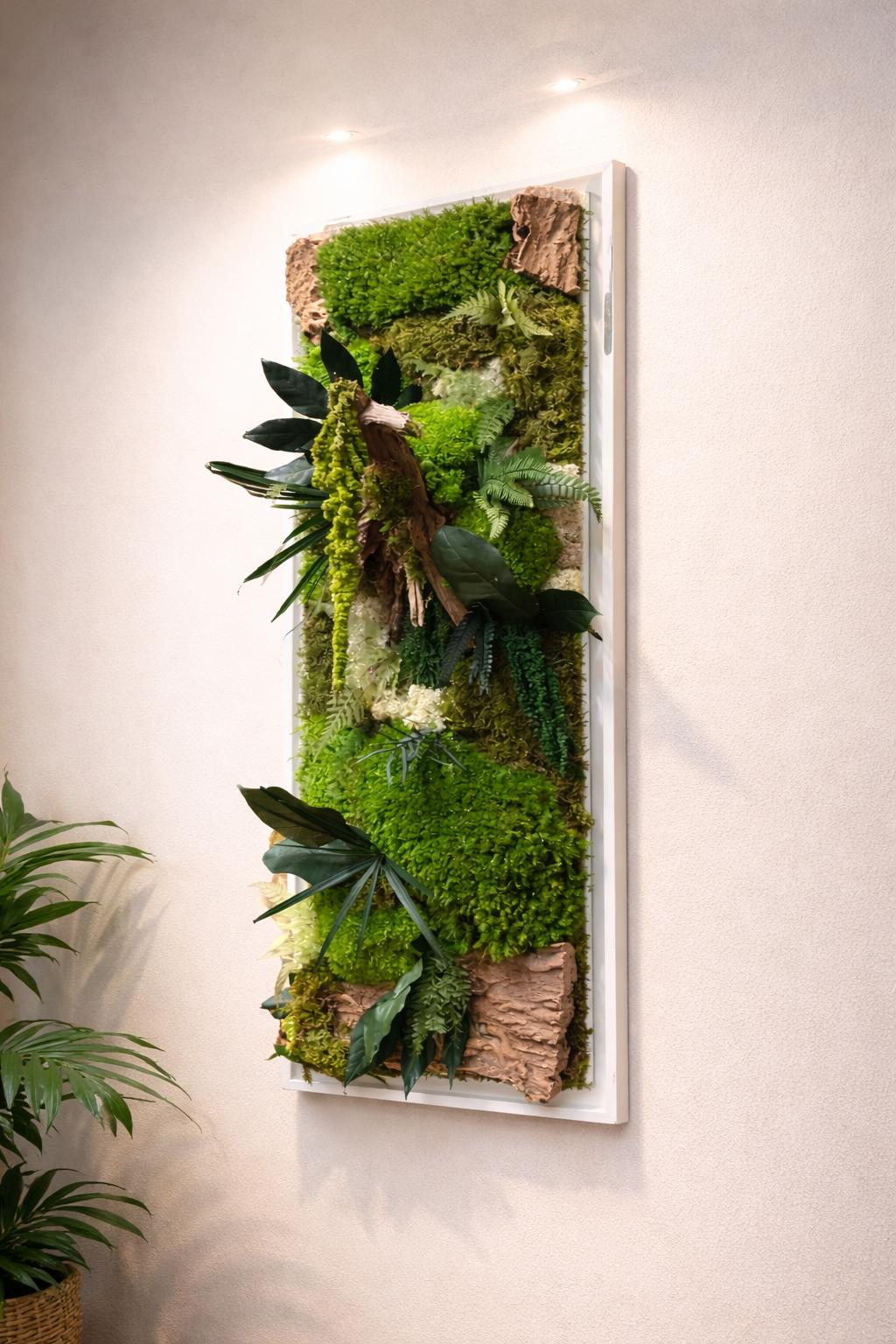 Parfait pour un salon, une entrée ou un bureau, ce format panoramique vertical apporte une touche naturelle et élégante sans entretien. Le contraste du bois blanc et du vert végétal s’accorde aussi bien à une déco bohème qu’à un intérieur design.