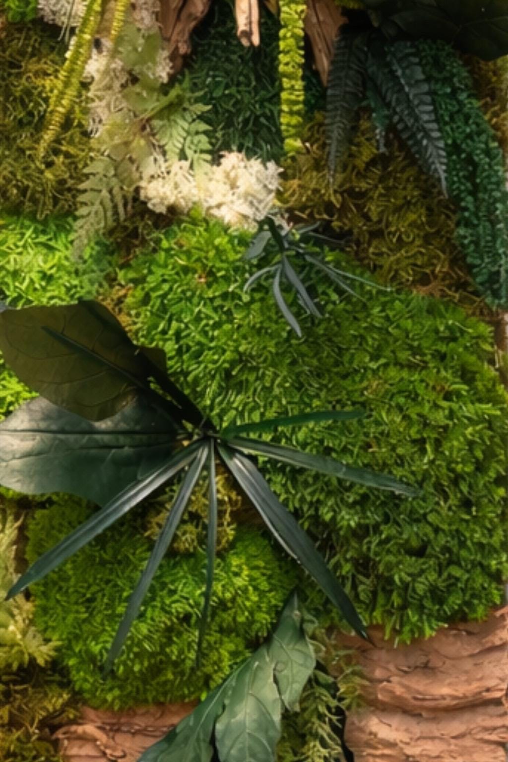 Ce grand tableau végétal stabilisé (98×38 cm) associe des mousses naturelles, des feuillages fins et des éléments de bois, minutieusement agencés pour créer un relief vivant et apaisant.