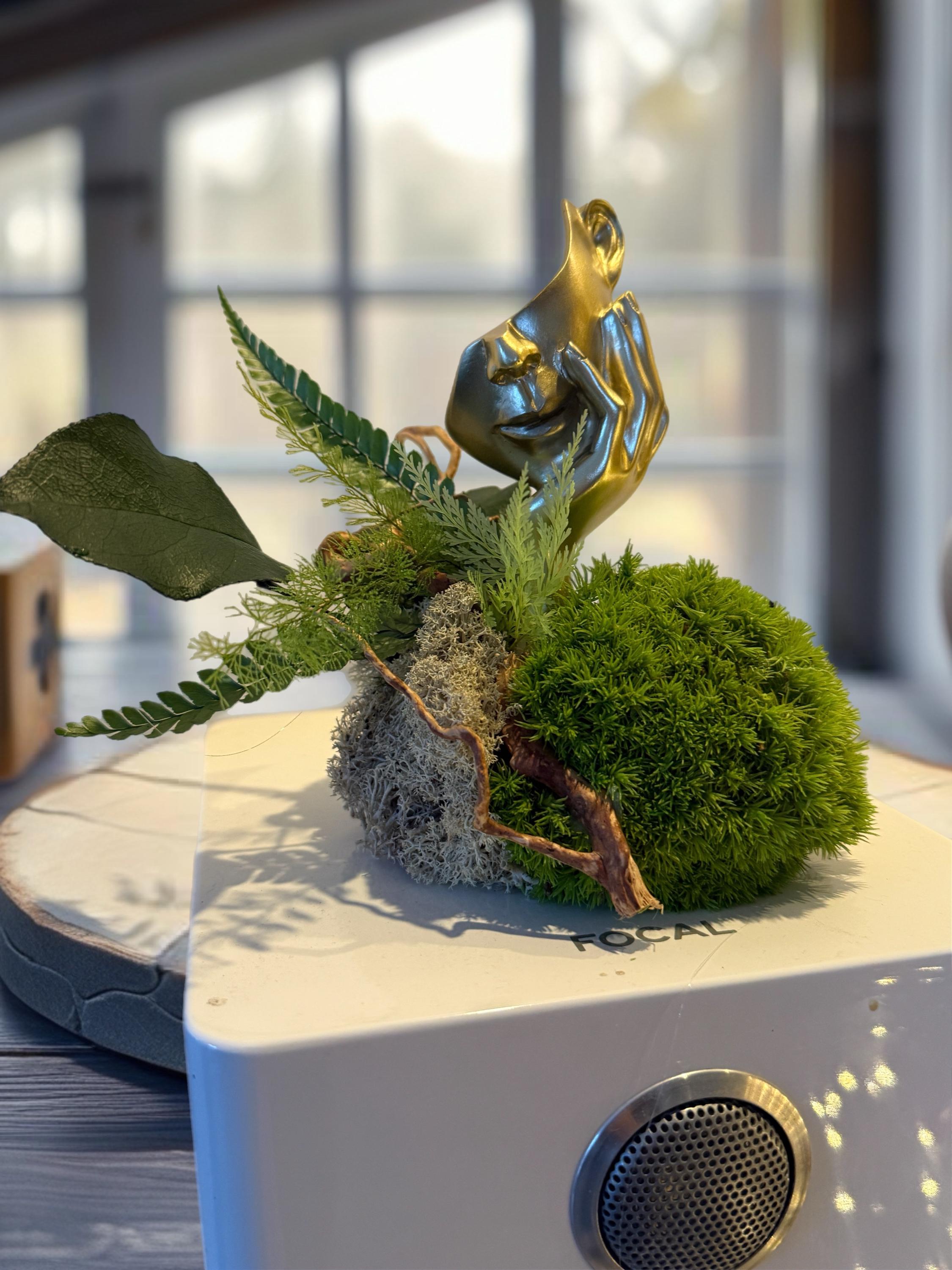 Le visage, aux lignes épurées et modernes, semble émerger d’un écrin de mousses et feuillages stabilisés, évoquant un lien fort entre l’humain et la nature. Chaque détail est pensé pour apporter équilibre, profondeur et sérénité.