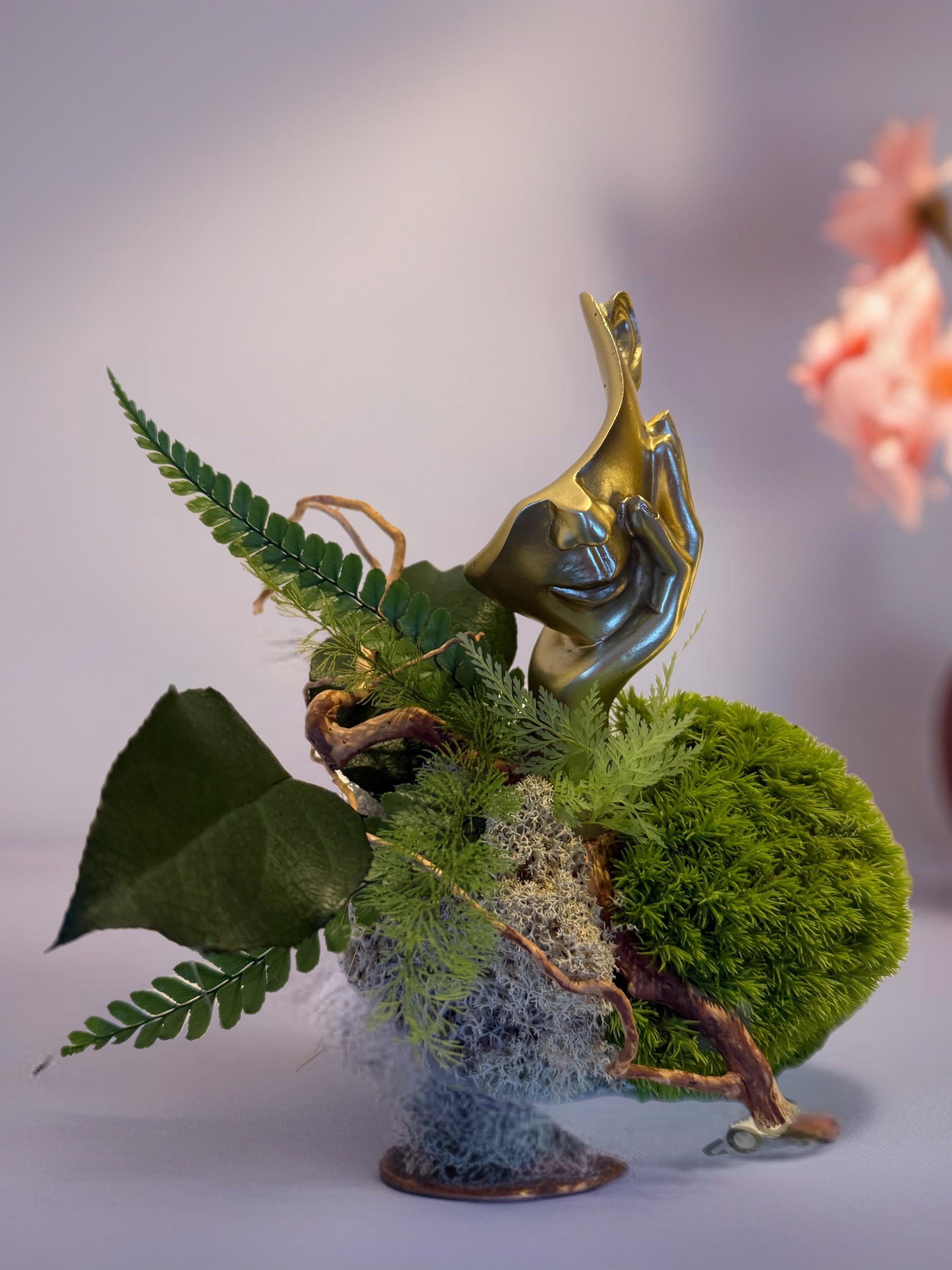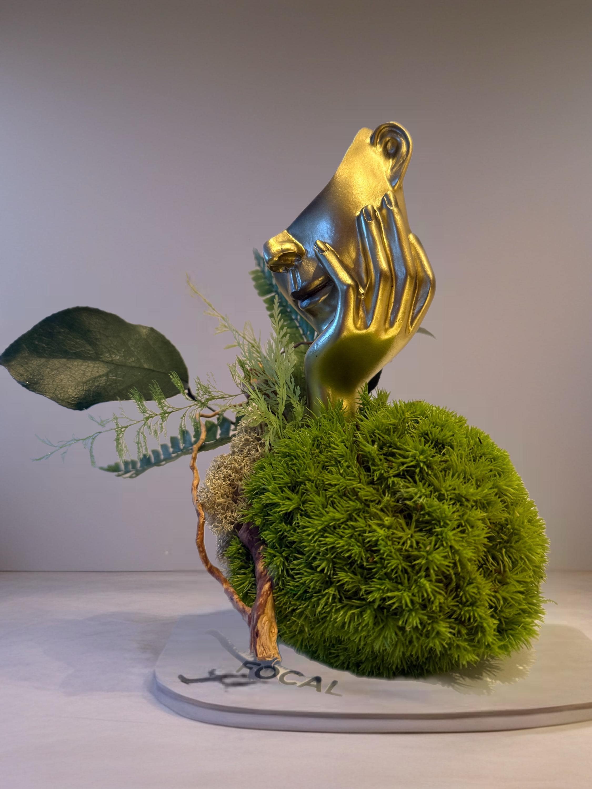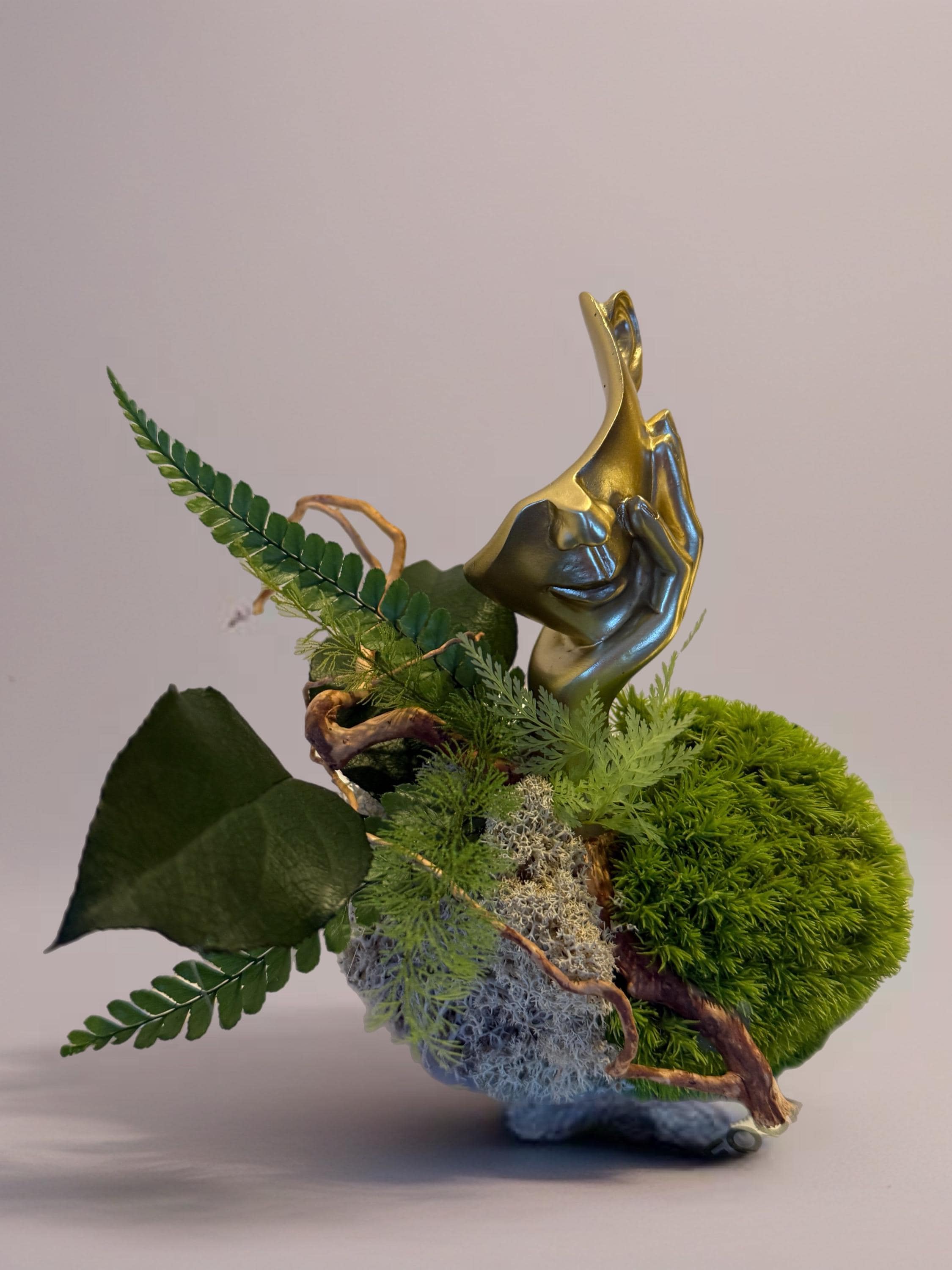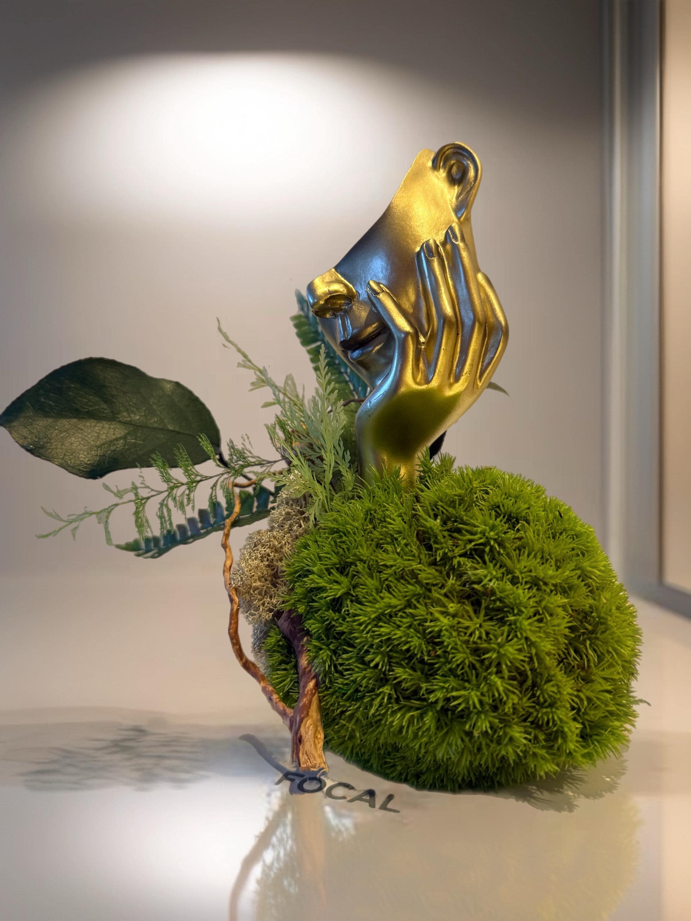 Cette sculpture végétale stabilisée associe l’élégance d’un visage doré contemporain à la douceur du végétal pour créer une pièce unique, à la fois artistique et naturelle.