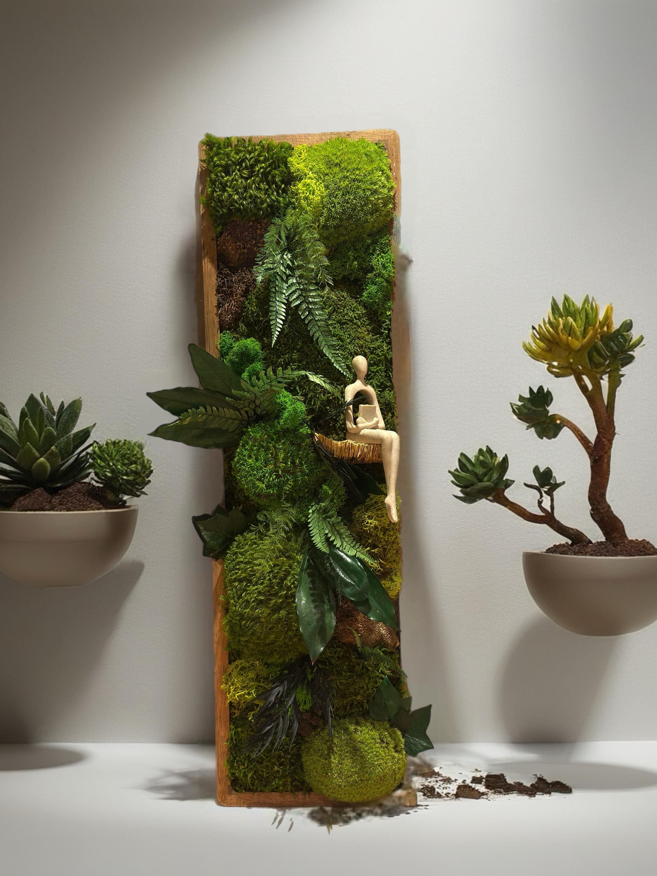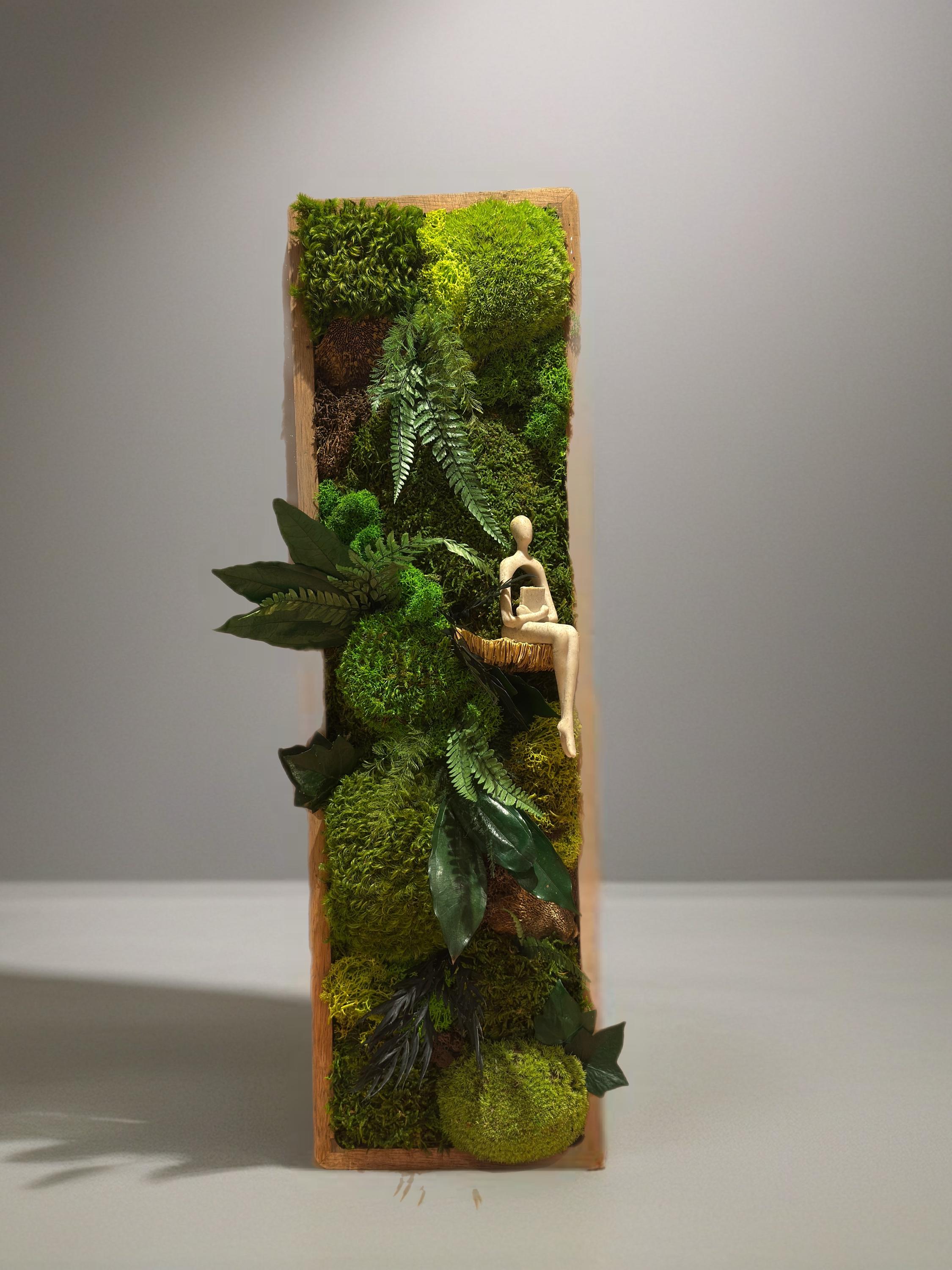 Ce tableau végétal met en scène une silhouette assise en pleine lecture, nichée au cœur d’un décor végétal luxuriant.