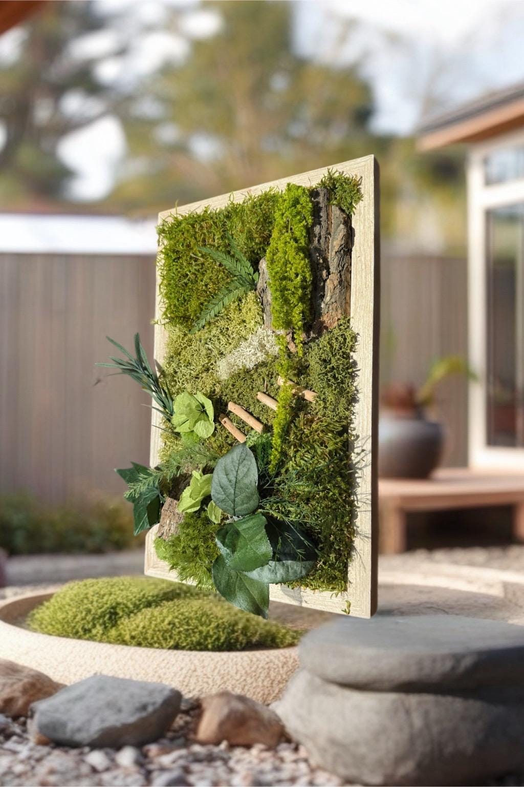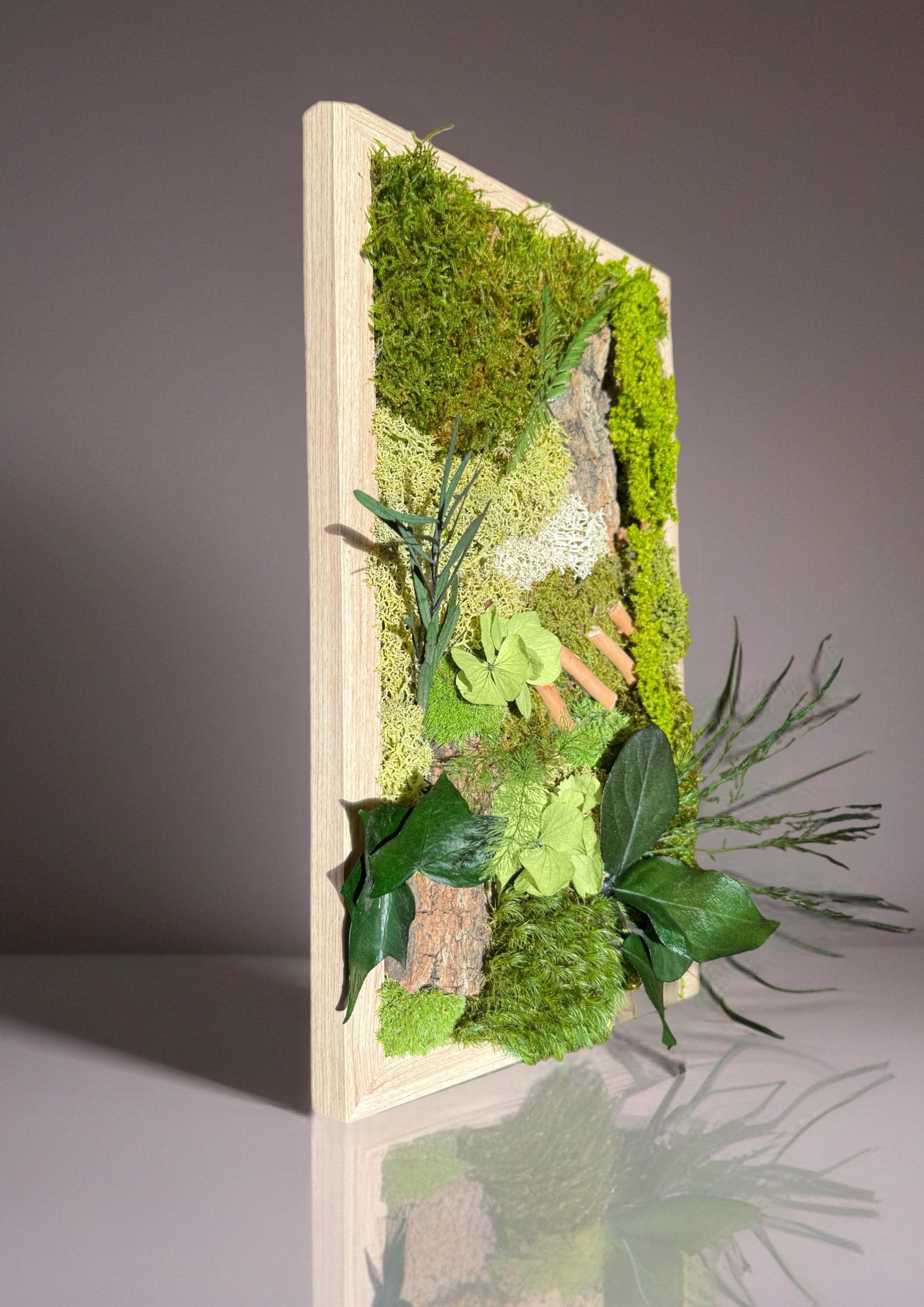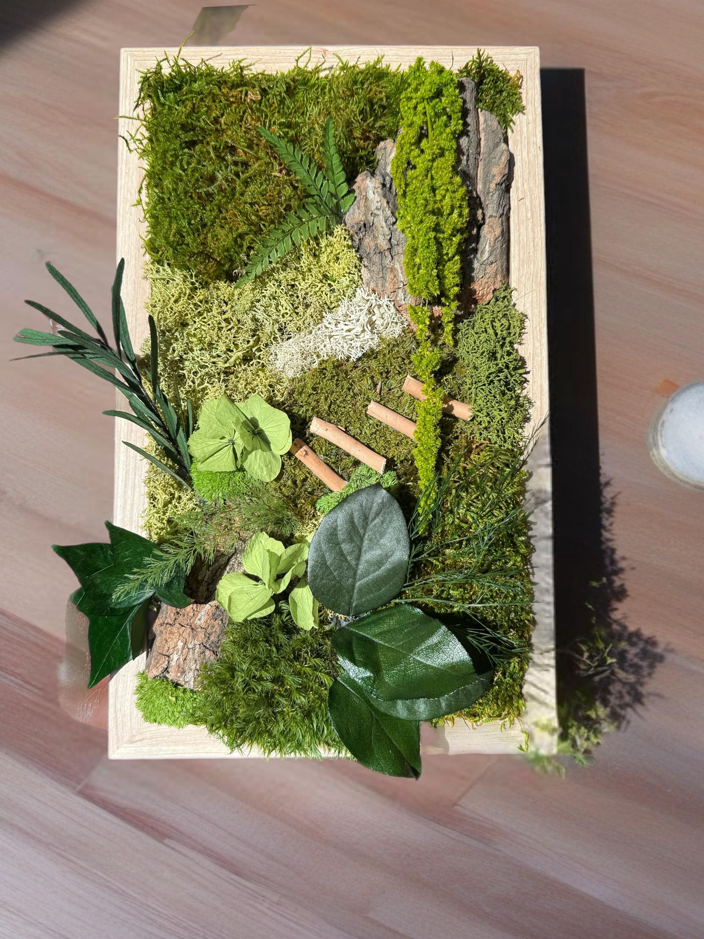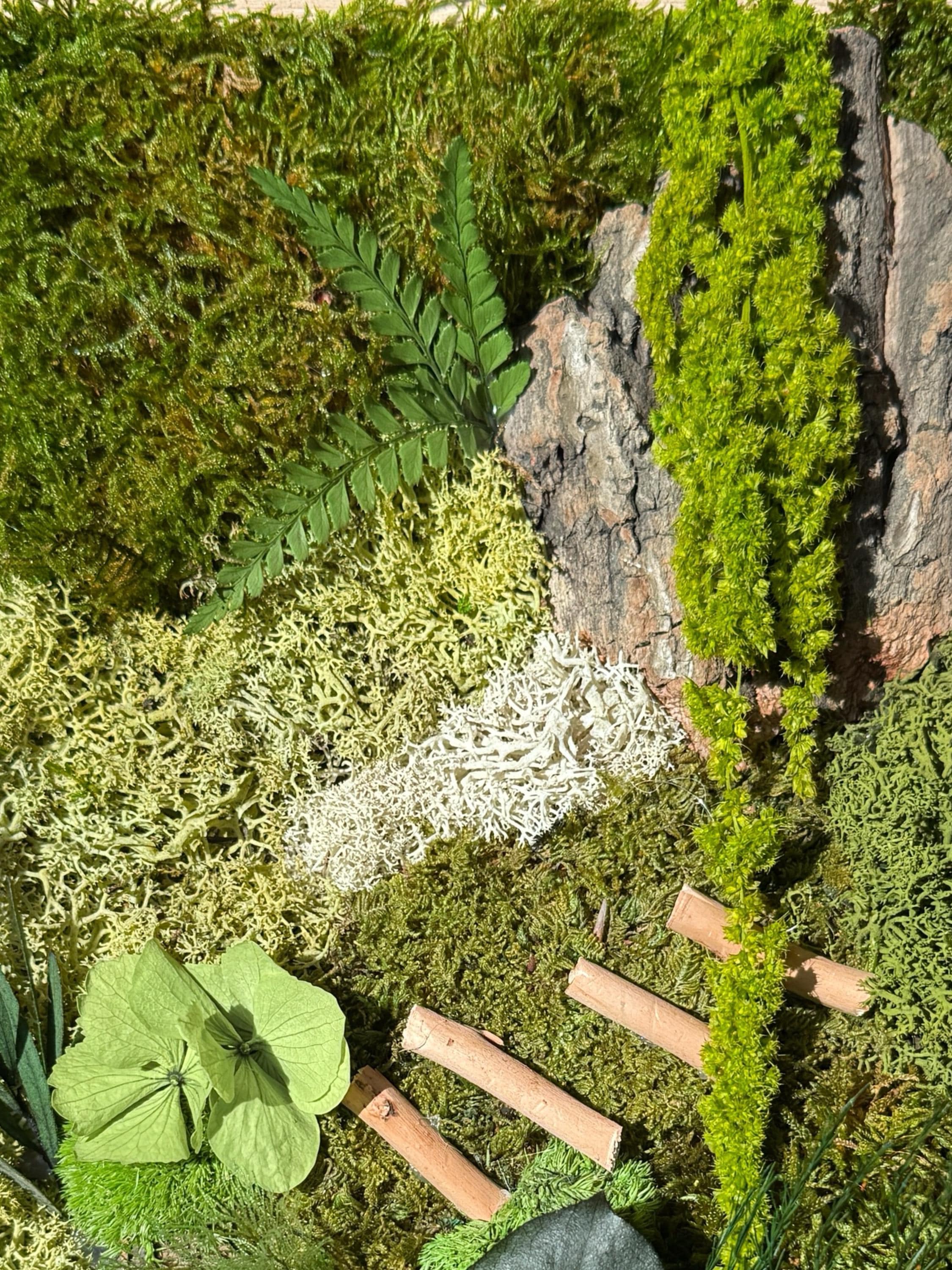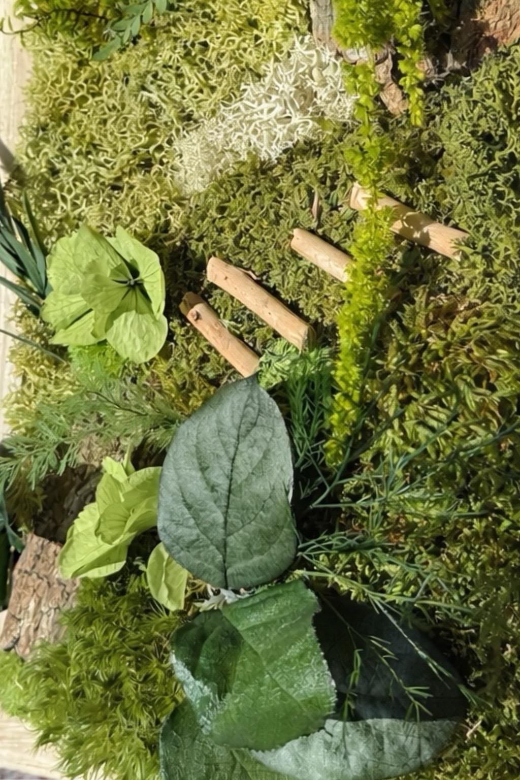 Chaque création est unique et s’inspire des paysages forestiers : reliefs naturels, mousses aux nuances de vert, écorces et feuillages délicats composent un véritable tableau végétal vivant… sans entretien.