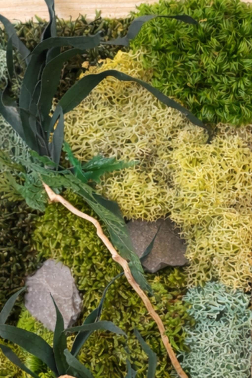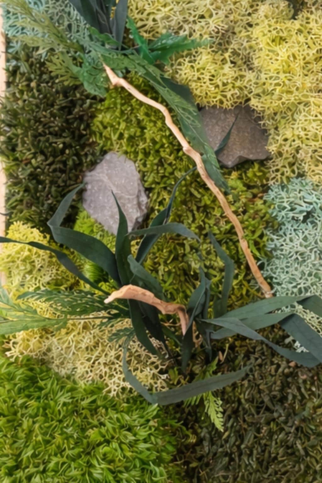 Ce tableau végétal associe différentes mousses stabilisées aux nuances de vert, des feuillages délicats et des éléments minéraux, pour créer une composition naturelle, texturée et harmonieuse.