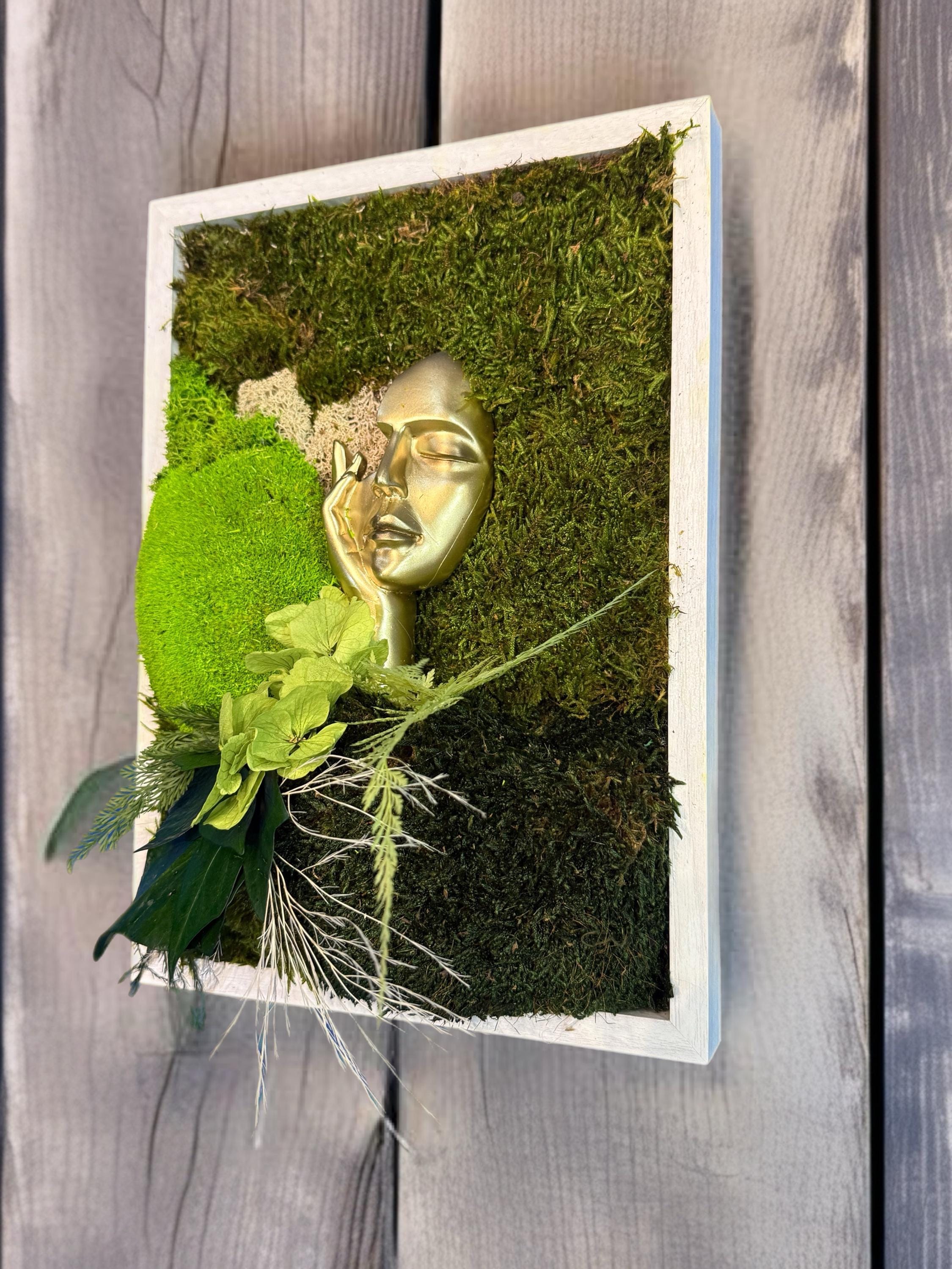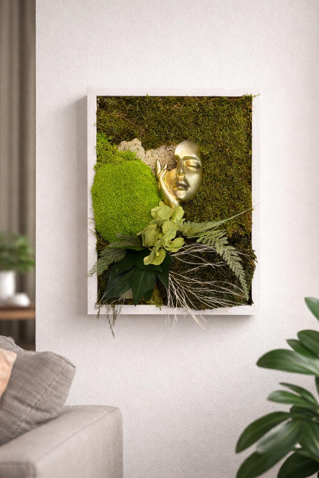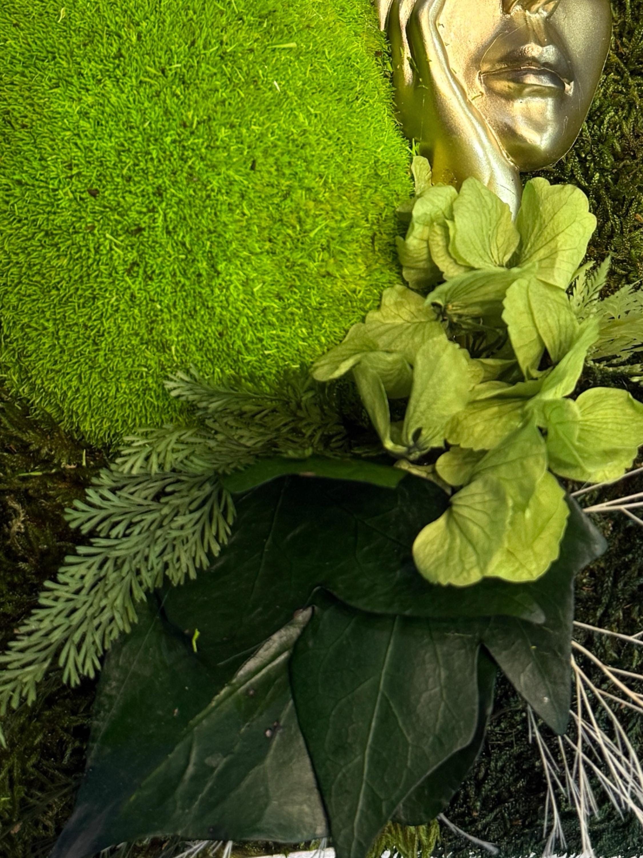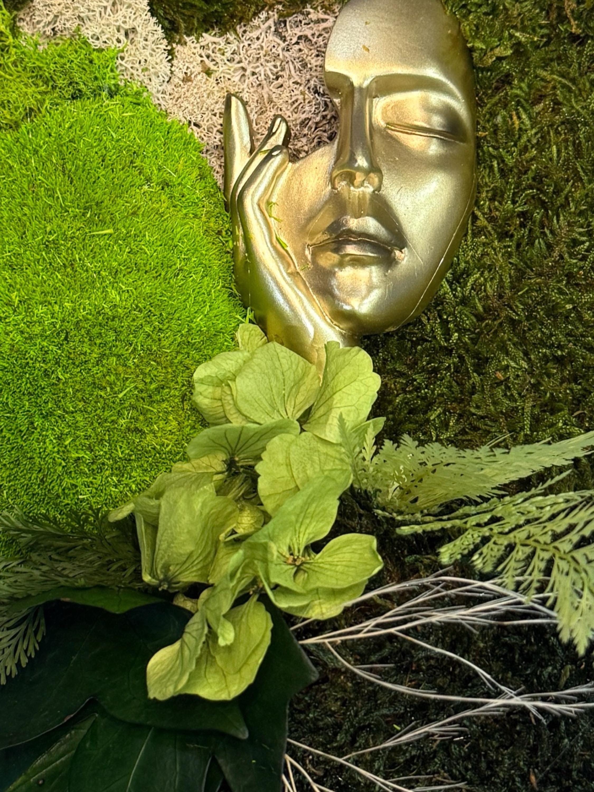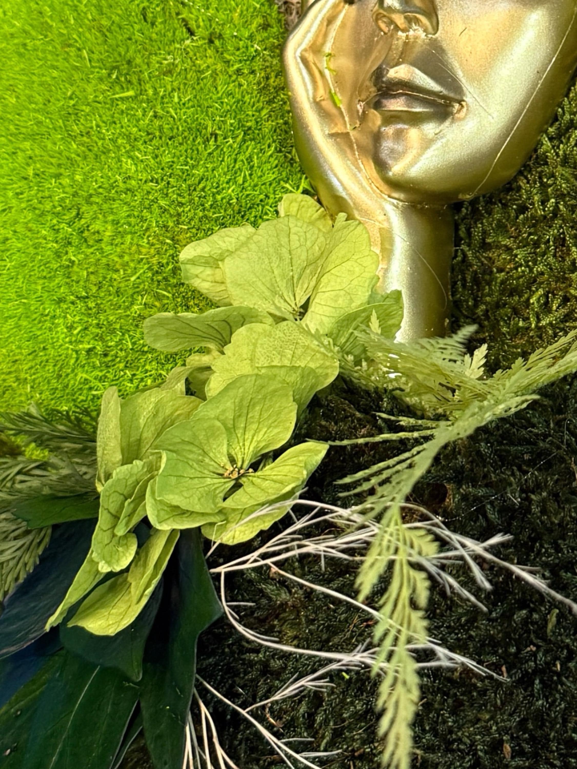 Au cœur de la composition, un visage doré aux traits délicats émerge d’un paysage végétal apaisant, composé de mousses naturelles stabilisées et de feuillages soigneusement sélectionnés.