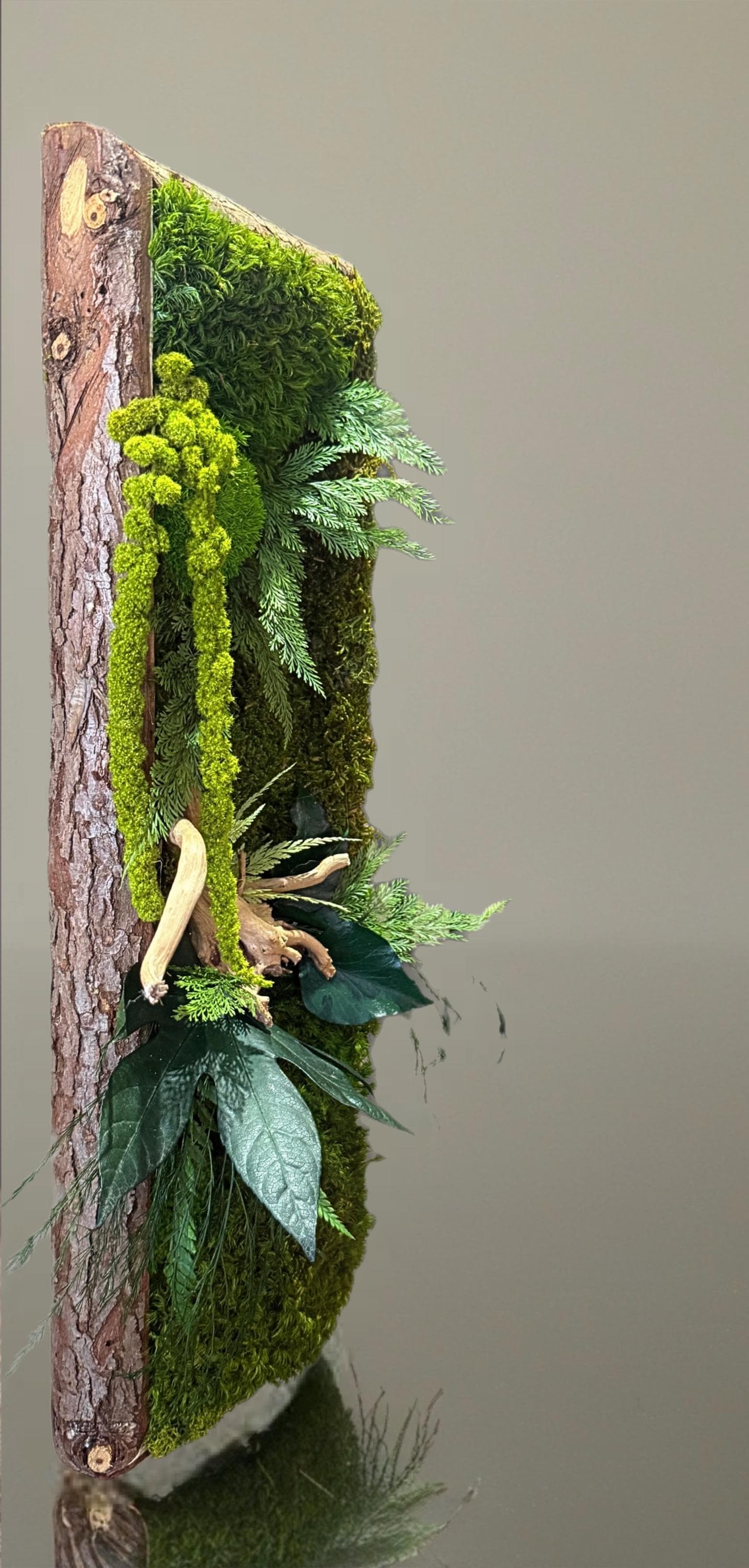 Ce modèle unique associe différentes mousses stabilisées, des feuillages naturels et un bois flotté, le tout sublimé par un cadre aux contours en écorce naturelle, pour un rendu authentique et organique.