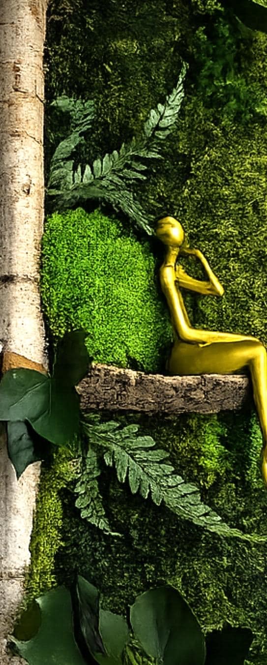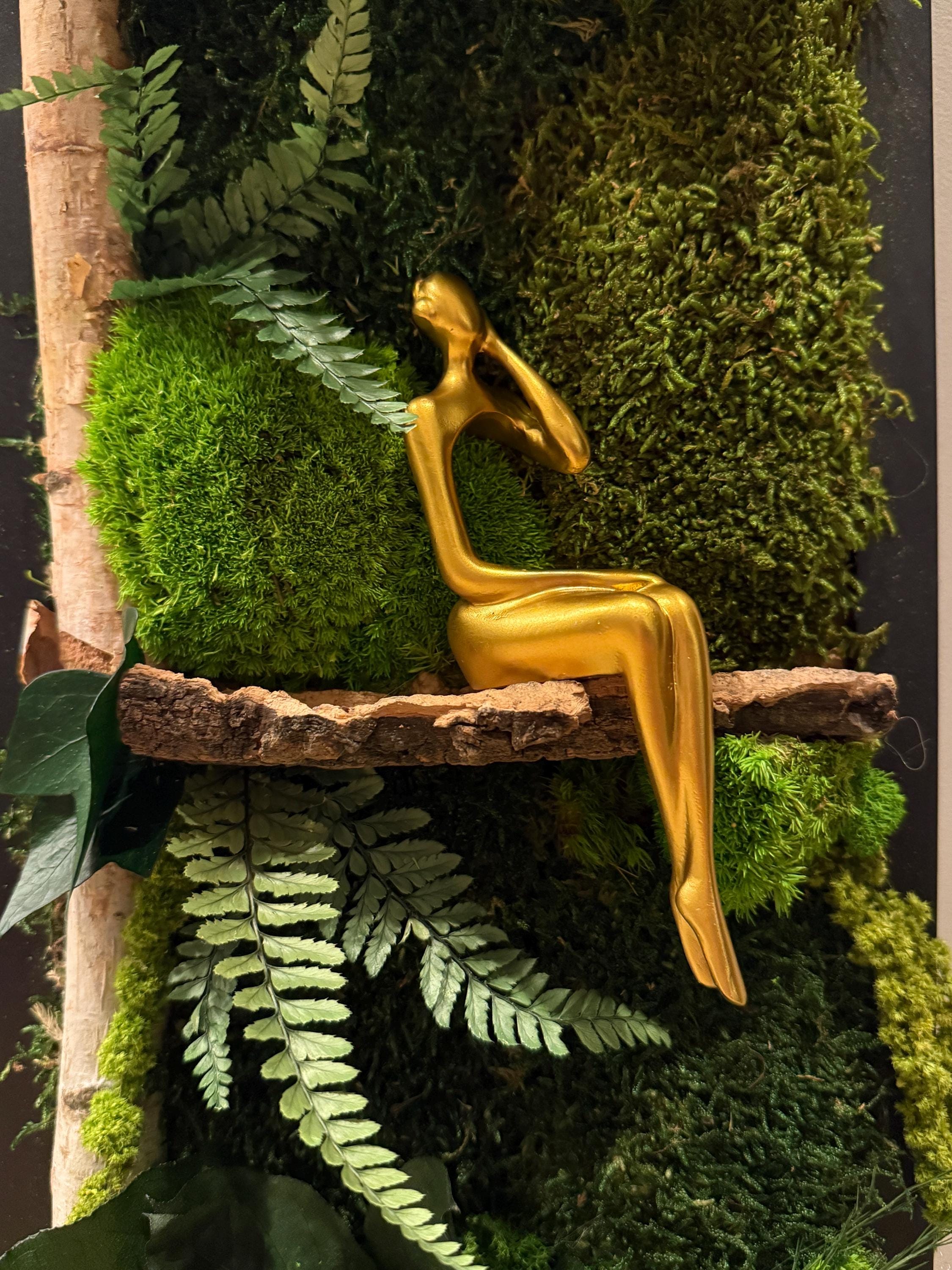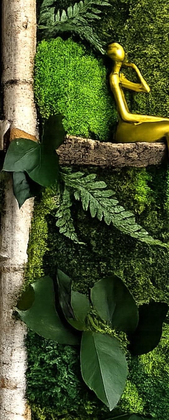 Cette création associe la richesse des mousses stabilisées, la chaleur du bois naturel de bouleau, et une sculpture dorée contemporaine, pour une décoration murale à la fois artistique, apaisante et intemporelle.