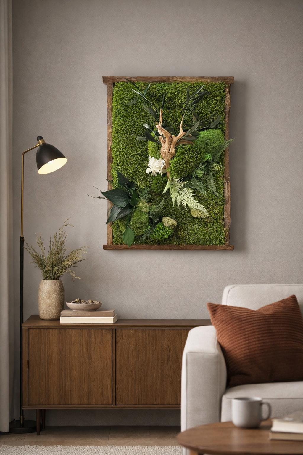 Ce cadre végétal stabilisé grand format (54 × 40 × 12 cm) est une pièce unique réalisée entièrement à la main.
