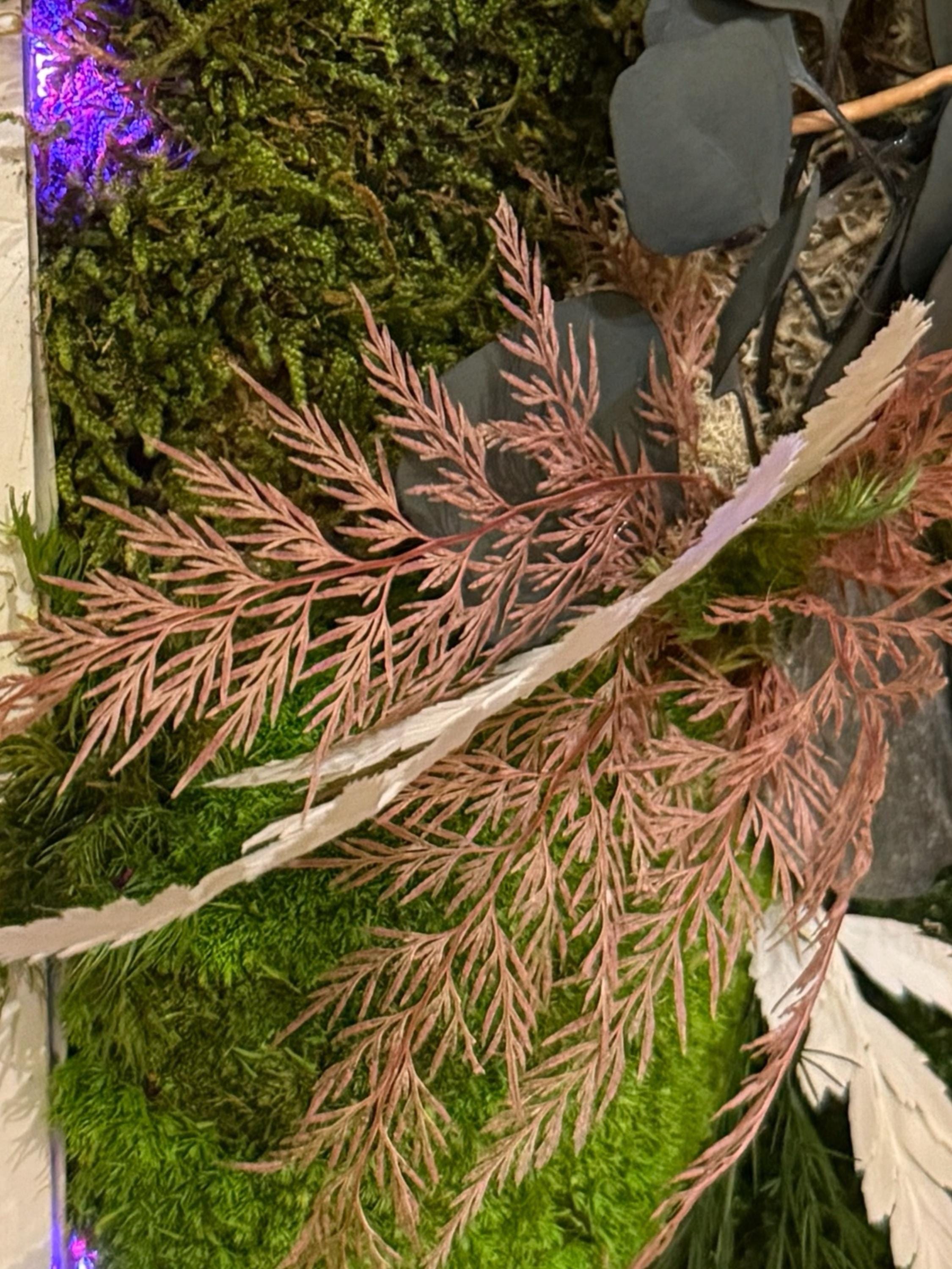 Cette création artisanale unique associe différentes mousses stabilisées, feuillages délicats et éléments végétaux texturés, subtilement mis en valeur par un éclairage LED discret qui crée une ambiance douce et contemporaine.