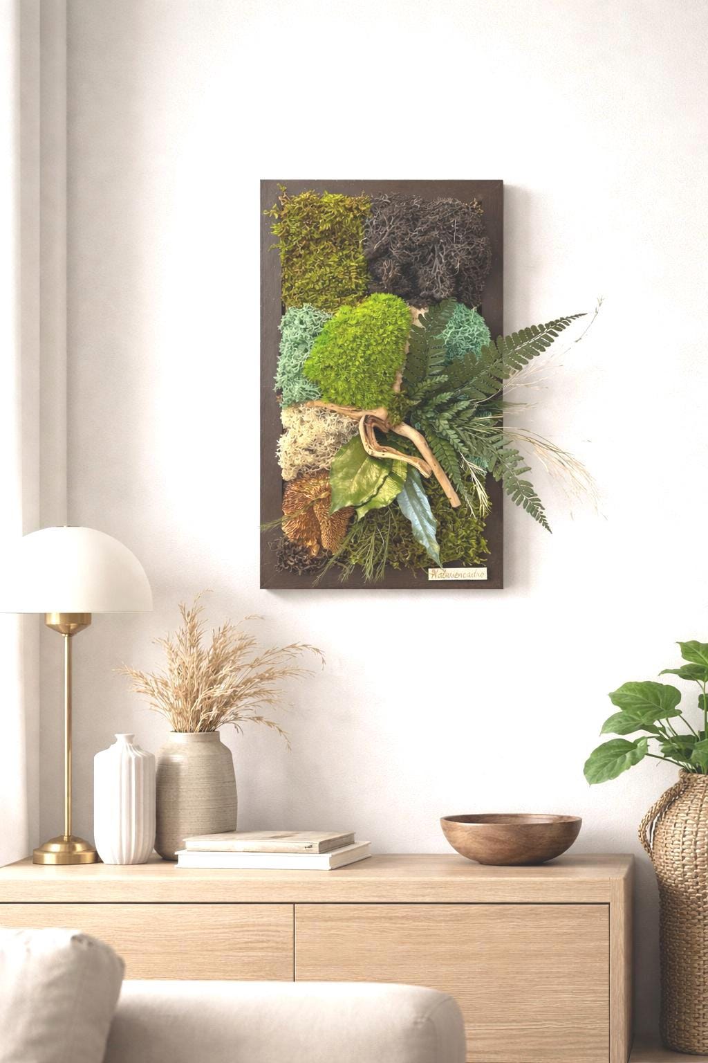 Composé de mousses naturelles, feuillages et bois, il apporte relief et apaisement à votre décoration, sans aucun entretien.