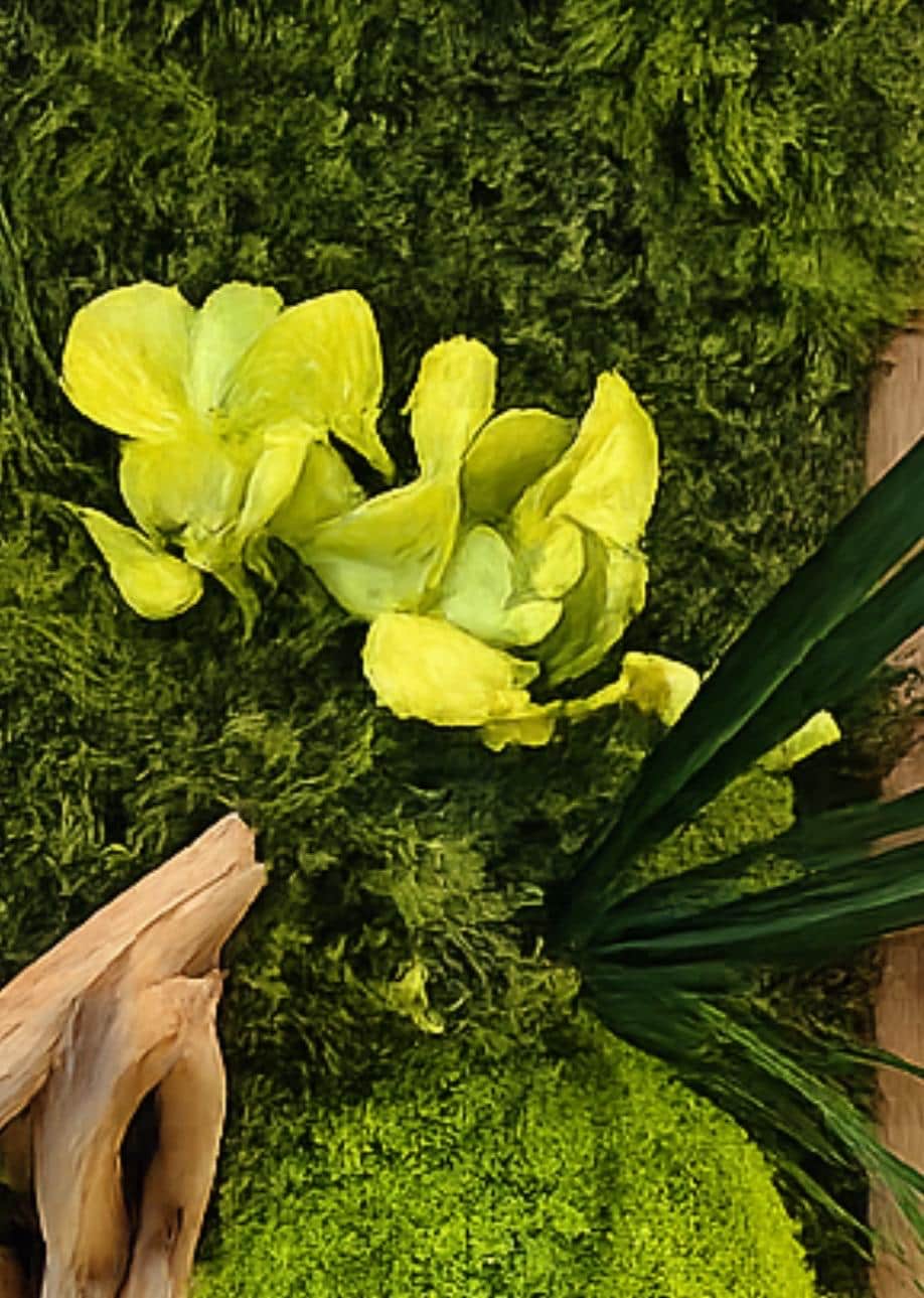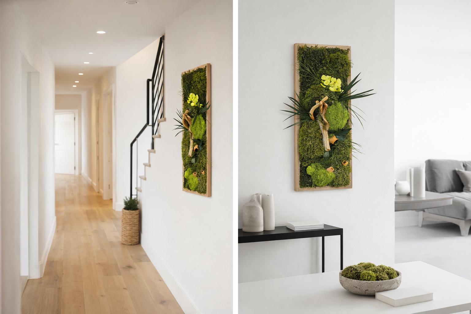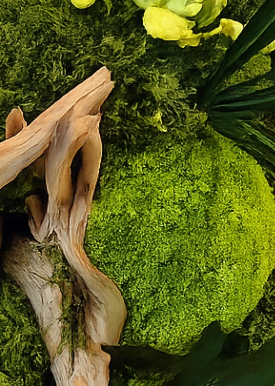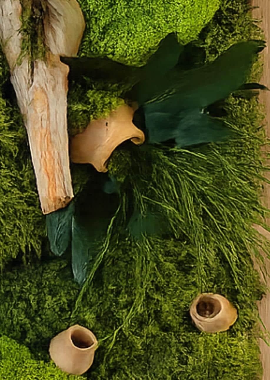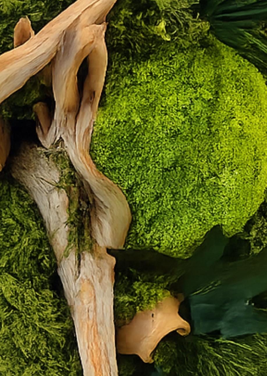 • Végétaux : mousses stabilisées, feuillages naturels, bois flotté