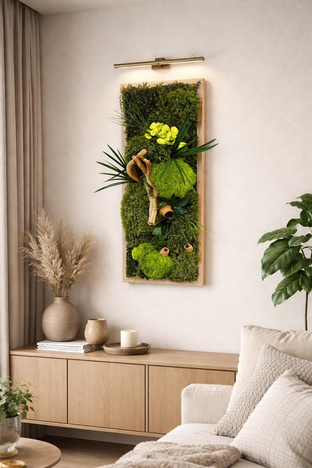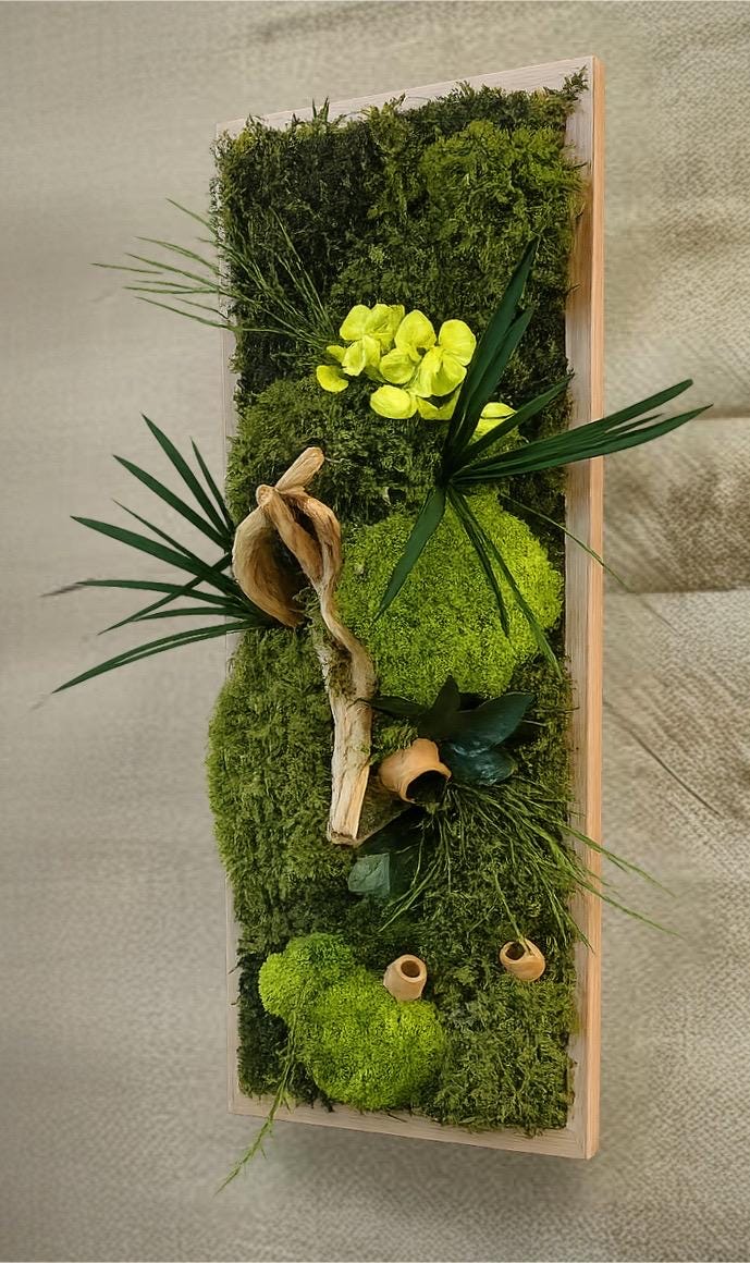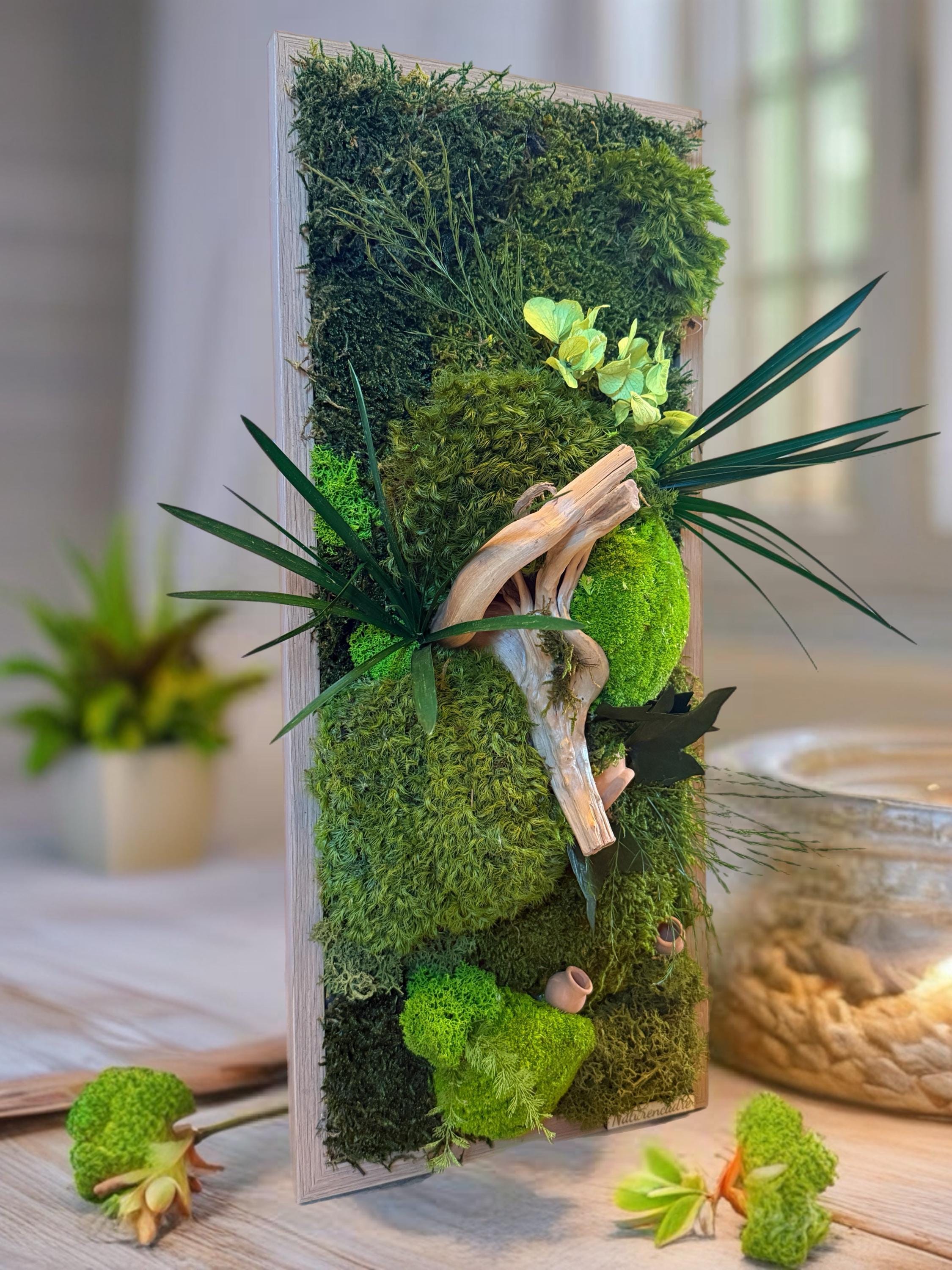 Ce cadre végétal stabilisé vertical de 52 cm est une création artisanale unique, pensée comme un fragment de nature suspendu dans le temps.