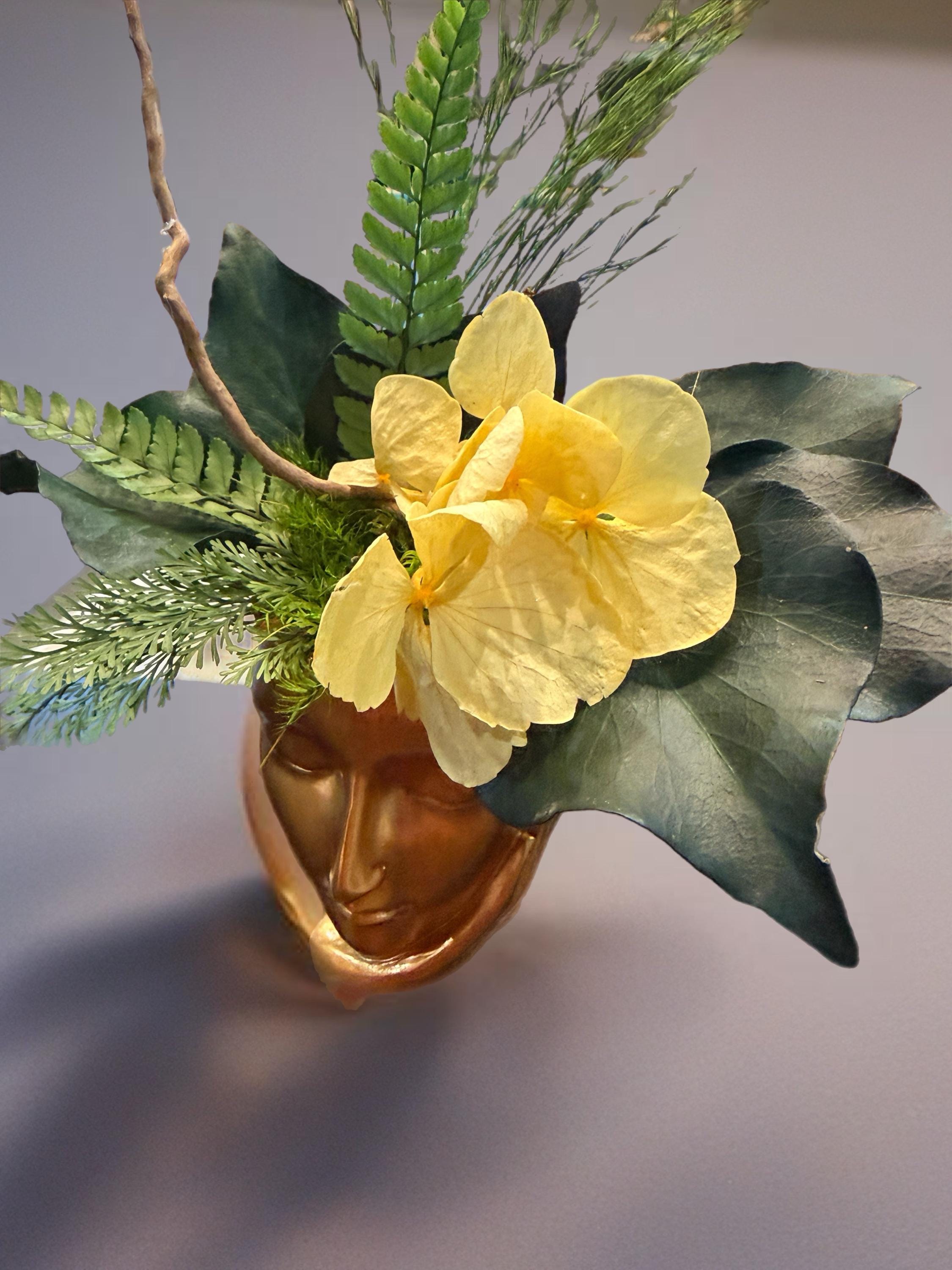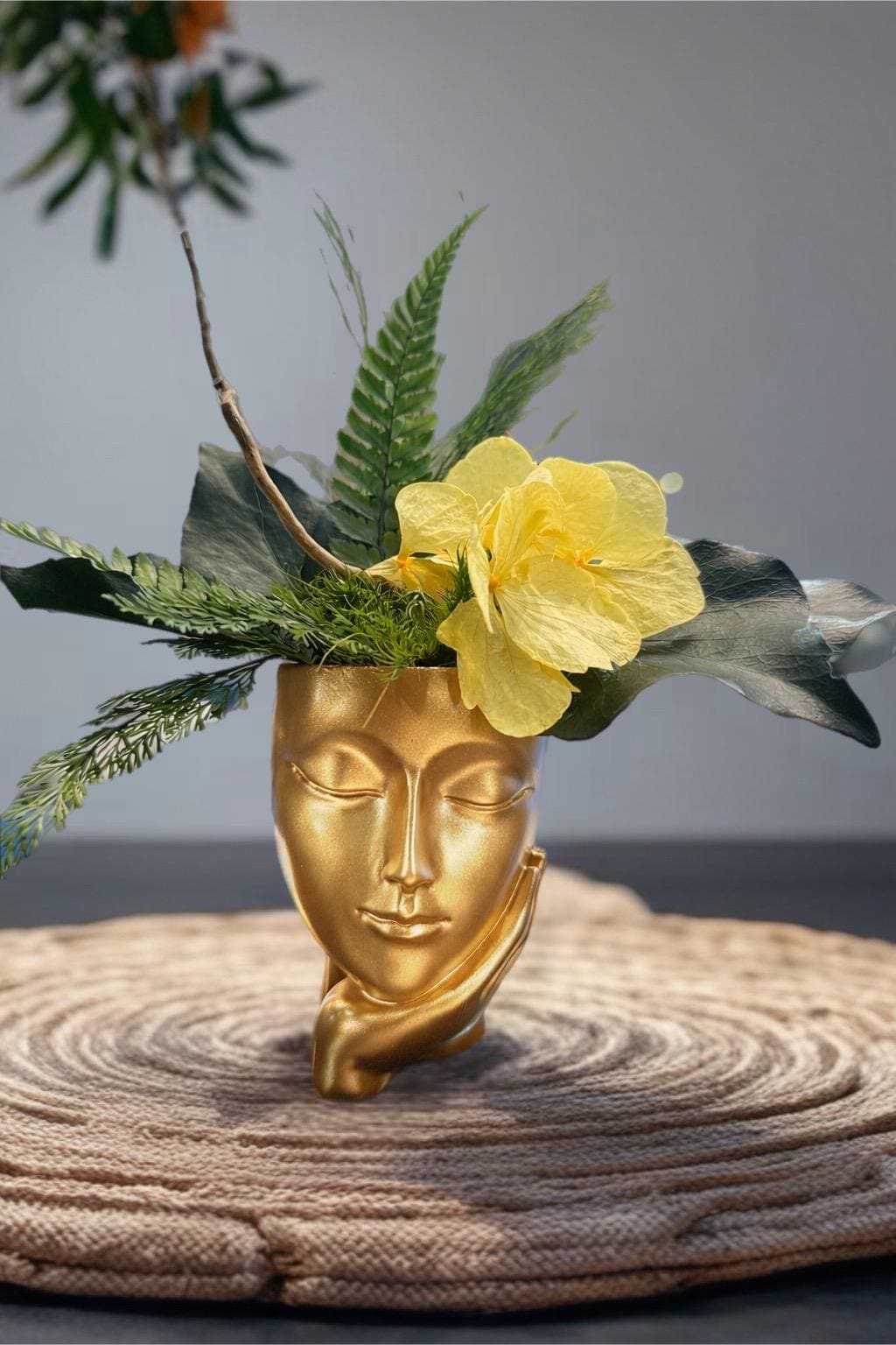Ce vase visage doré incarne l’alliance parfaite entre art décoratif et nature intemporelle.