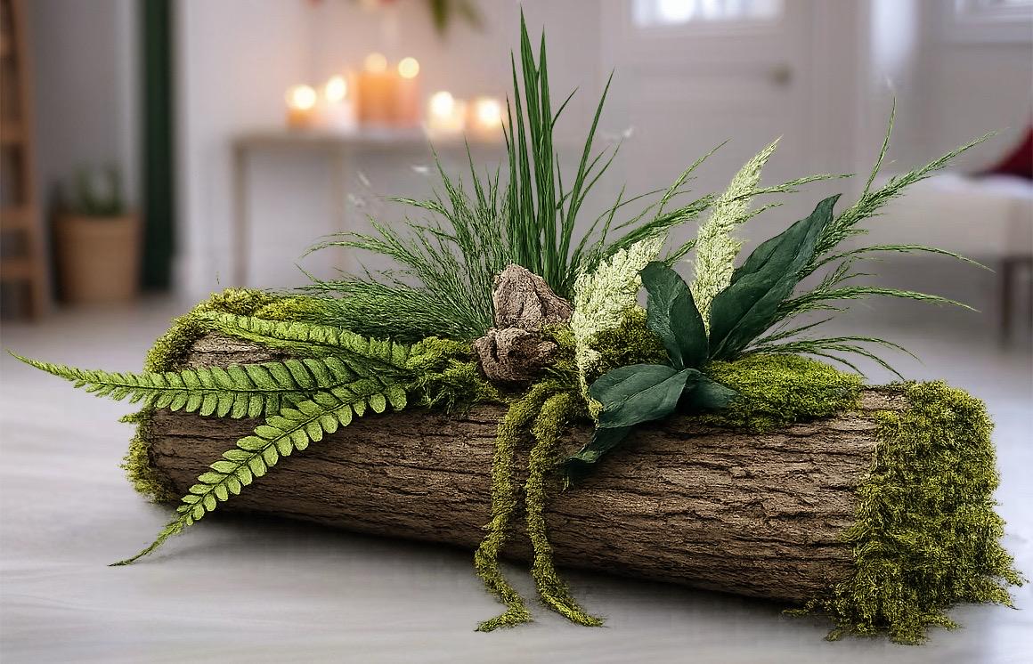 ✨ Jardinière stabilisée artisanale, réalisée à partir d’un tronc en écorce naturelle et de végétaux stabilisés.