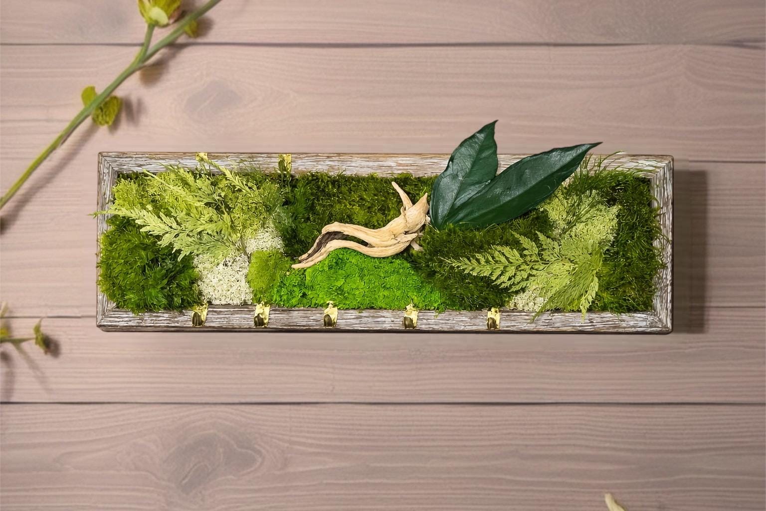 Ce porte-clés mural végétal stabilisé est une piÚce unique, réalisée à la main avec des végétaux naturels soigneusement sélectionnés.
