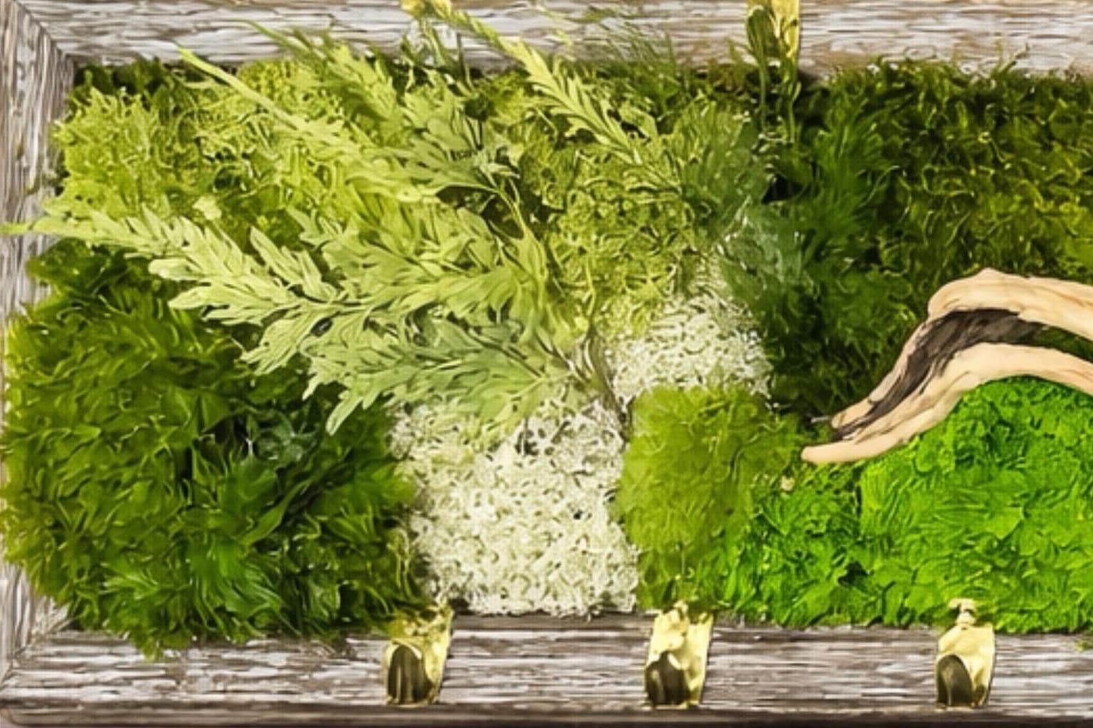 CrĂ©ation artisanale mĂȘlant mousses stabilisĂ©es, feuillages et bois flottĂ©, dans un cadre en bois.