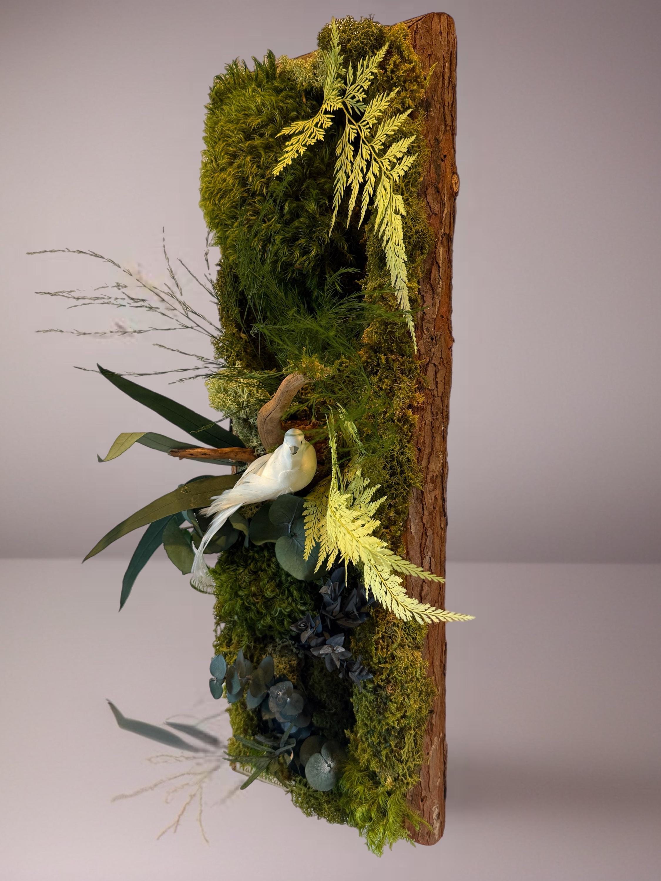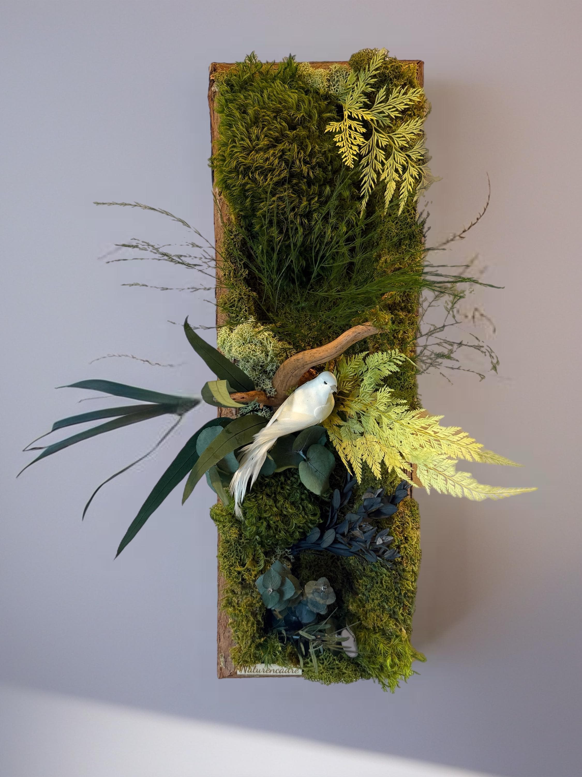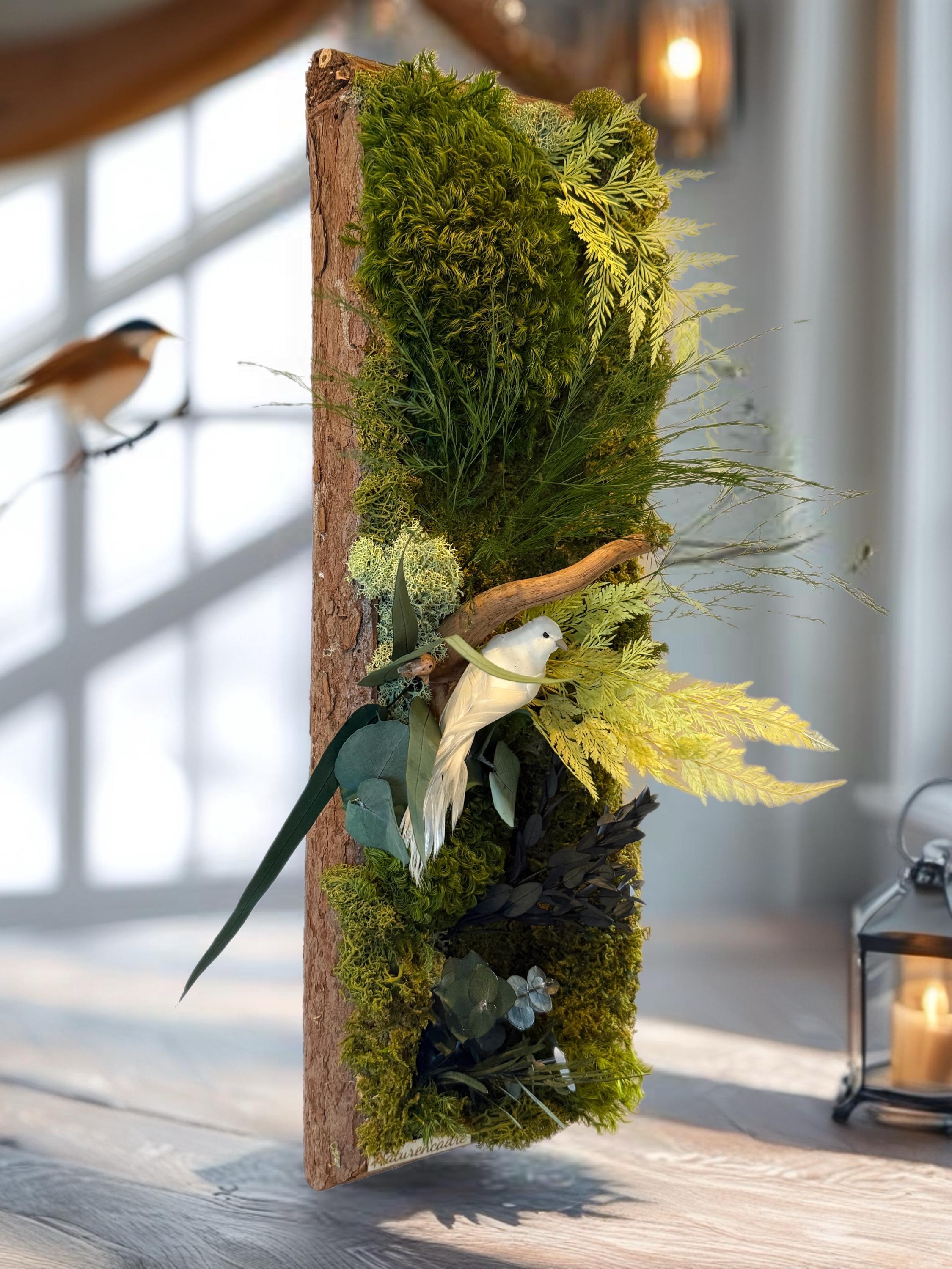 Les mousses et feuillages stabilisés sont travaillés en relief afin de créer une scène végétale vivante et apaisante, idéale pour habiller un mur clair, une entrée ou un espace de vie lumineux.