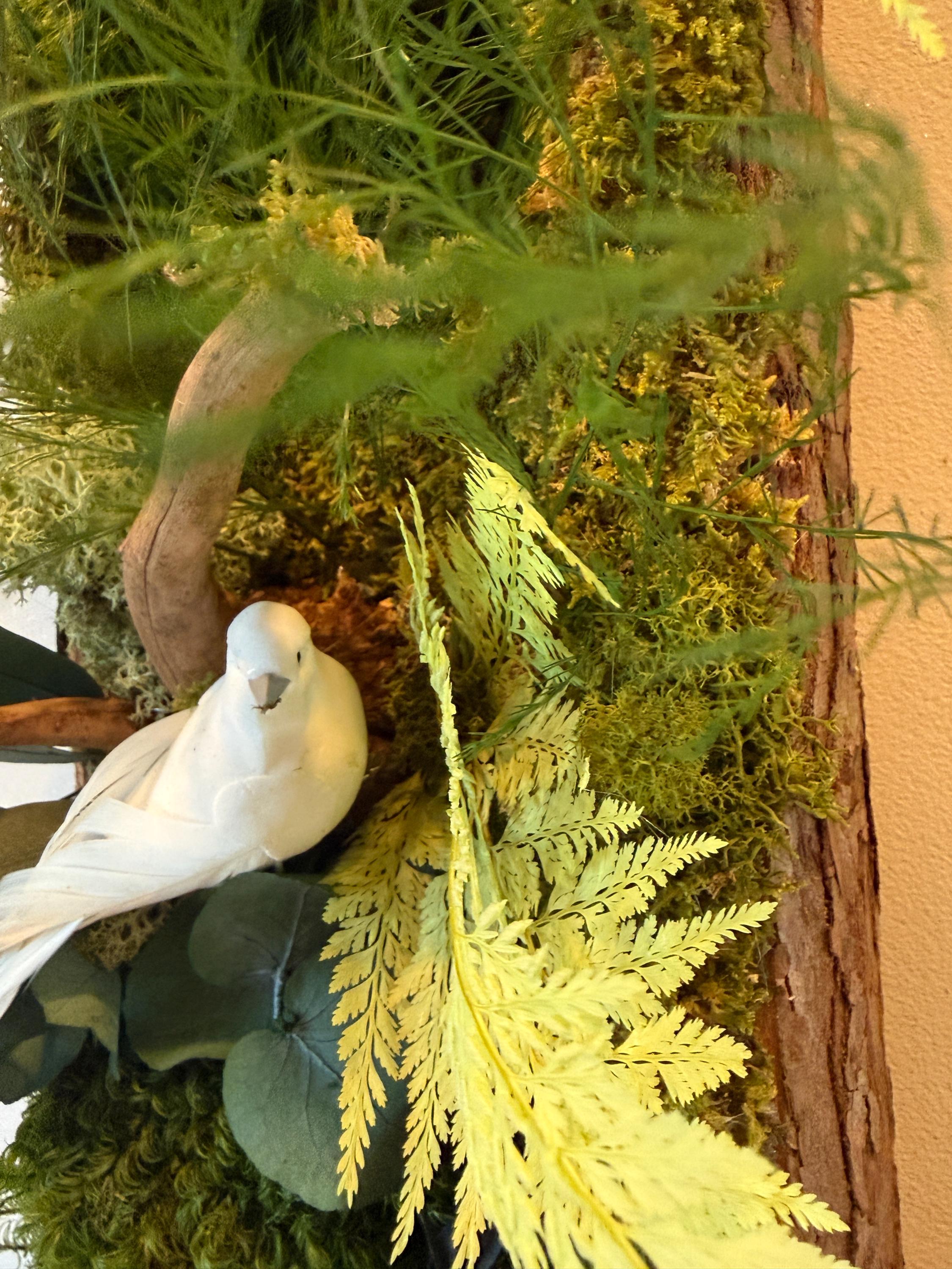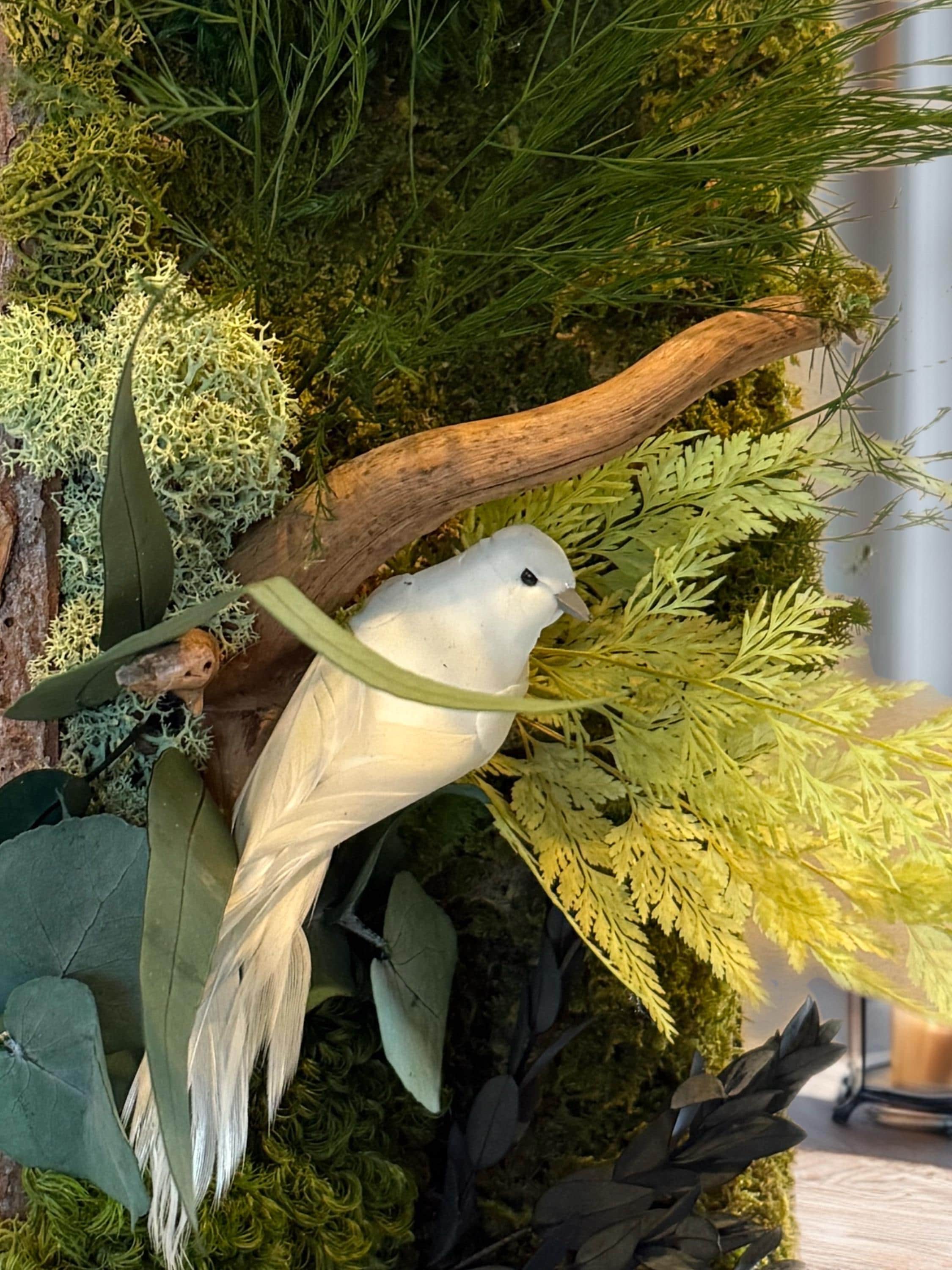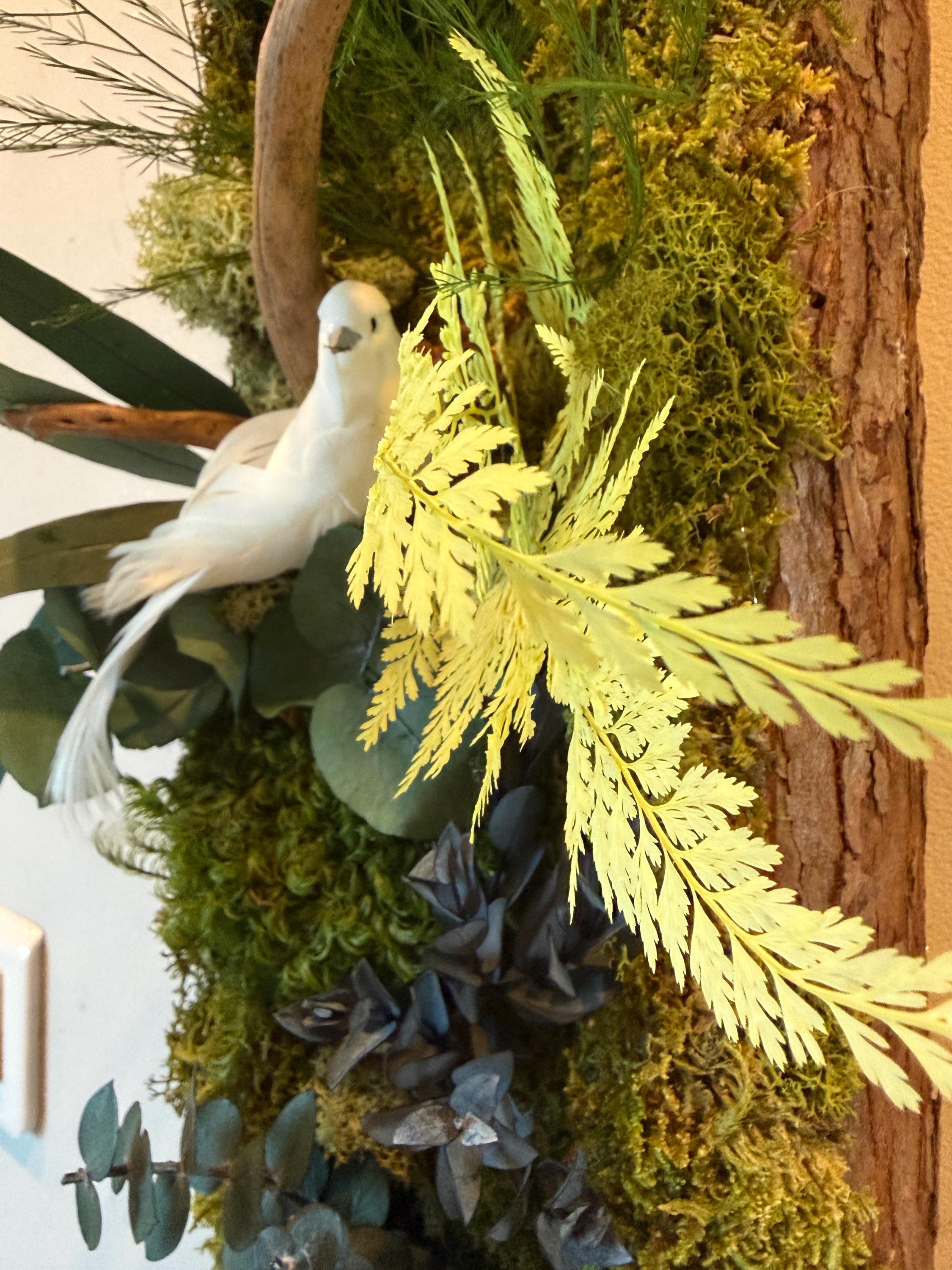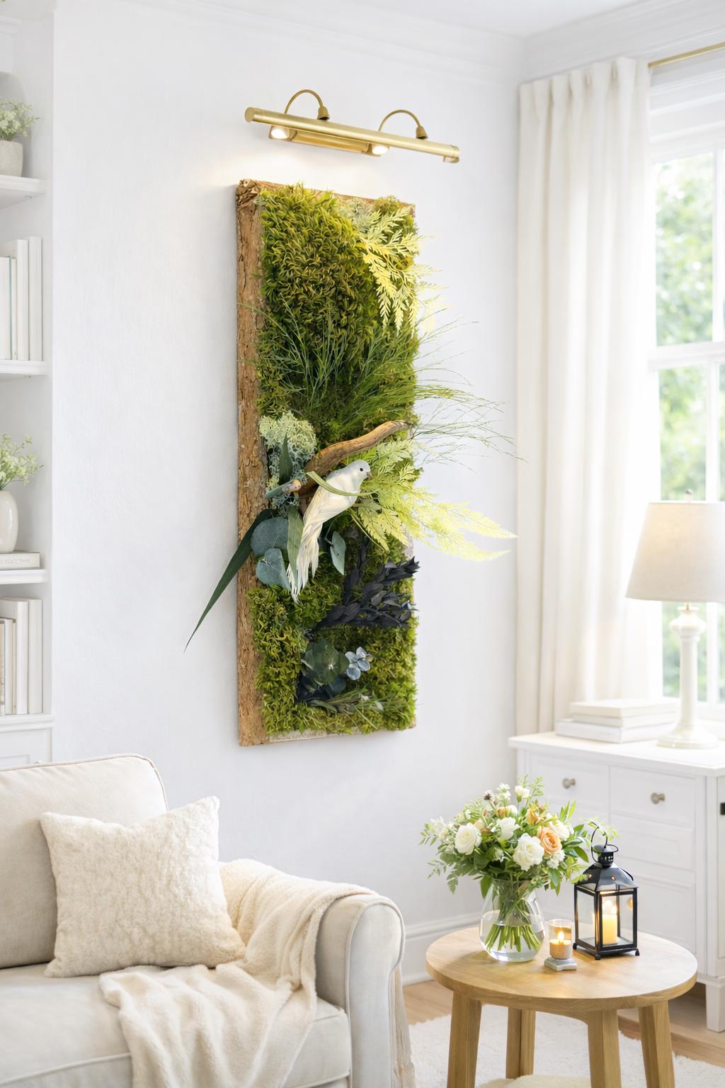 Les mousses et feuillages stabilisés sont travaillés en relief afin de créer une scène végétale vivante et apaisante, idéale pour habiller un mur clair, une entrée ou un espace de vie lumineux.