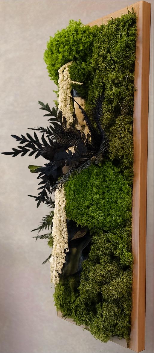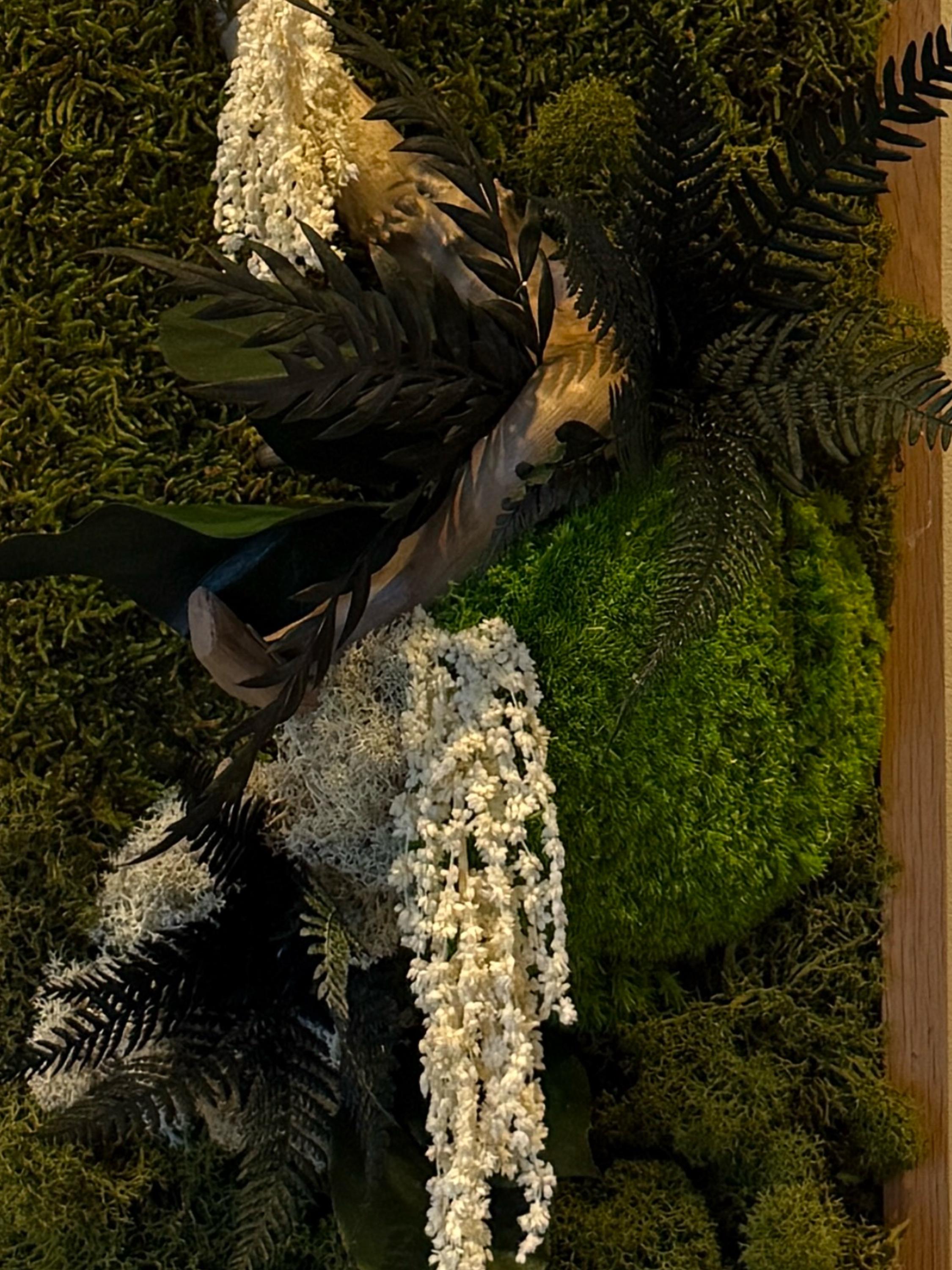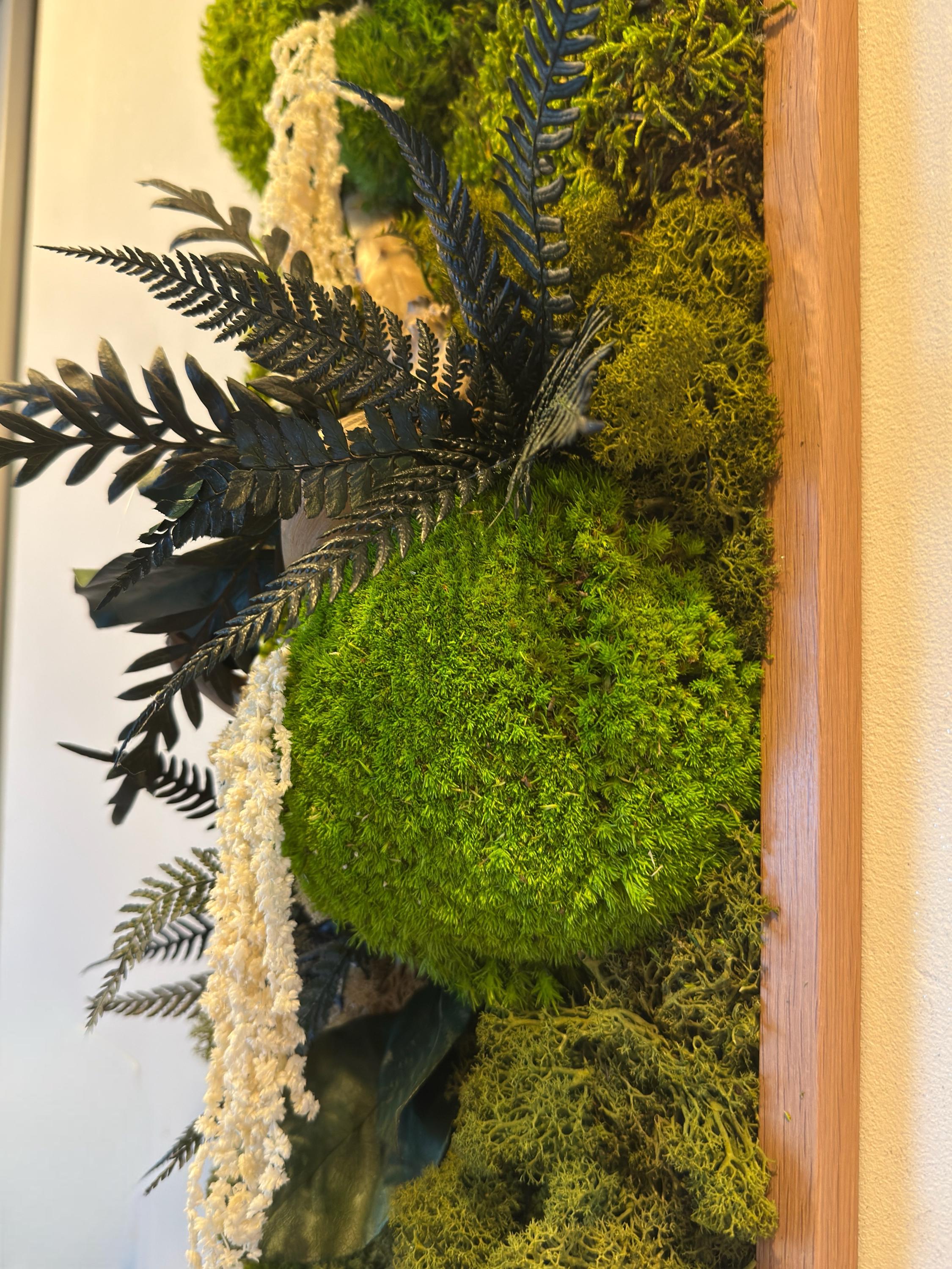 Apportez une touche de nature élégante à votre intérieur avec ce cadre végétal stabilisé mural de 50 cm de hauteur, réalisé à la main à partir de mousses et feuillages 100 % naturels.