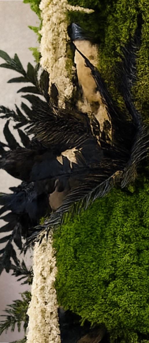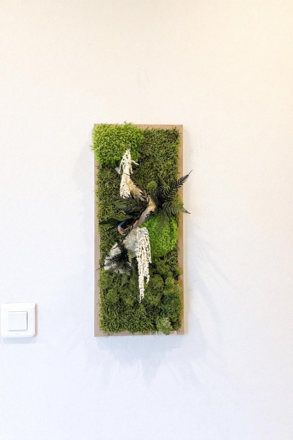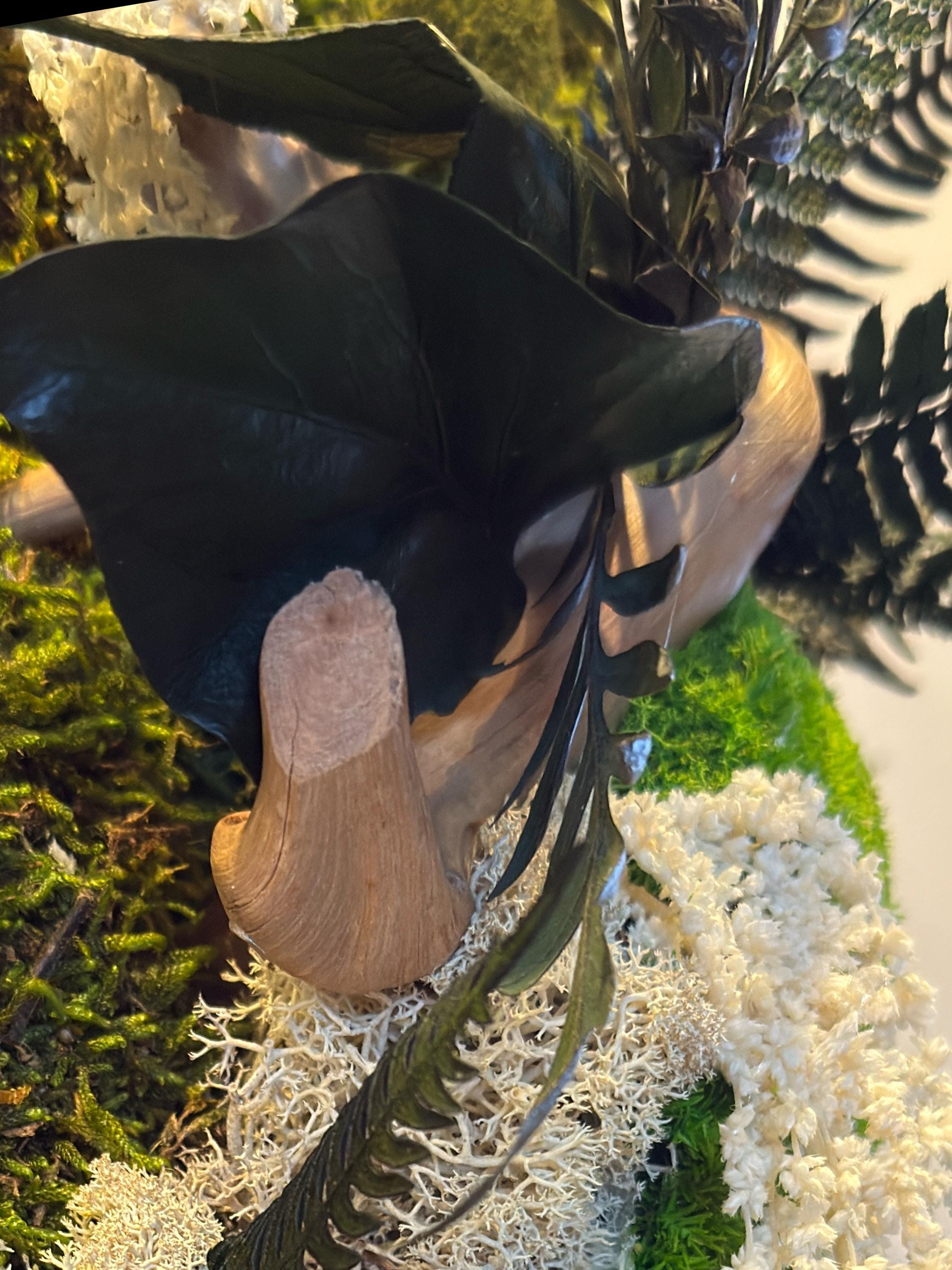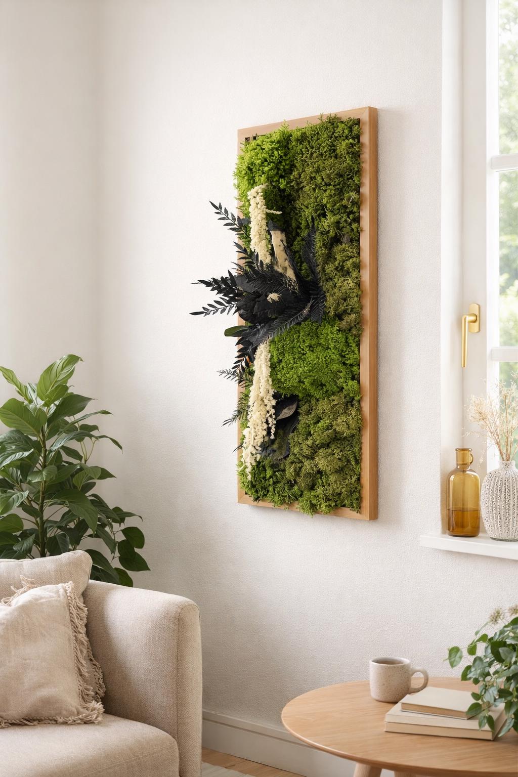 Apportez une touche de nature élégante à votre intérieur avec ce cadre végétal stabilisé mural de 50 cm de hauteur, réalisé à la main à partir de mousses et feuillages 100 % naturels.