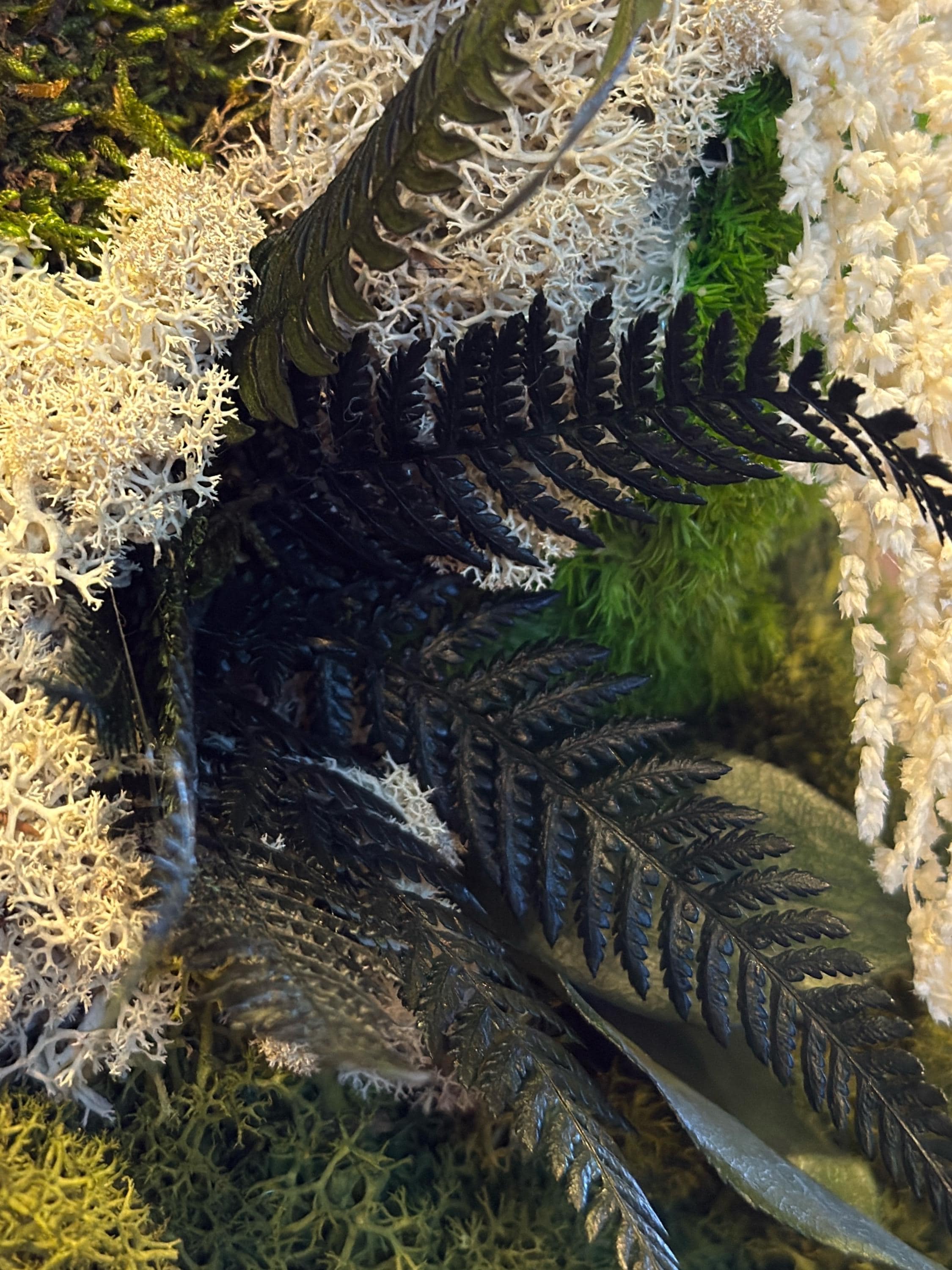 Les volumes de mousse stabilisée, associés à des feuillages graphiques et à des éléments clairs en contraste, créent un relief naturel et apaisant qui capte immédiatement le regard.