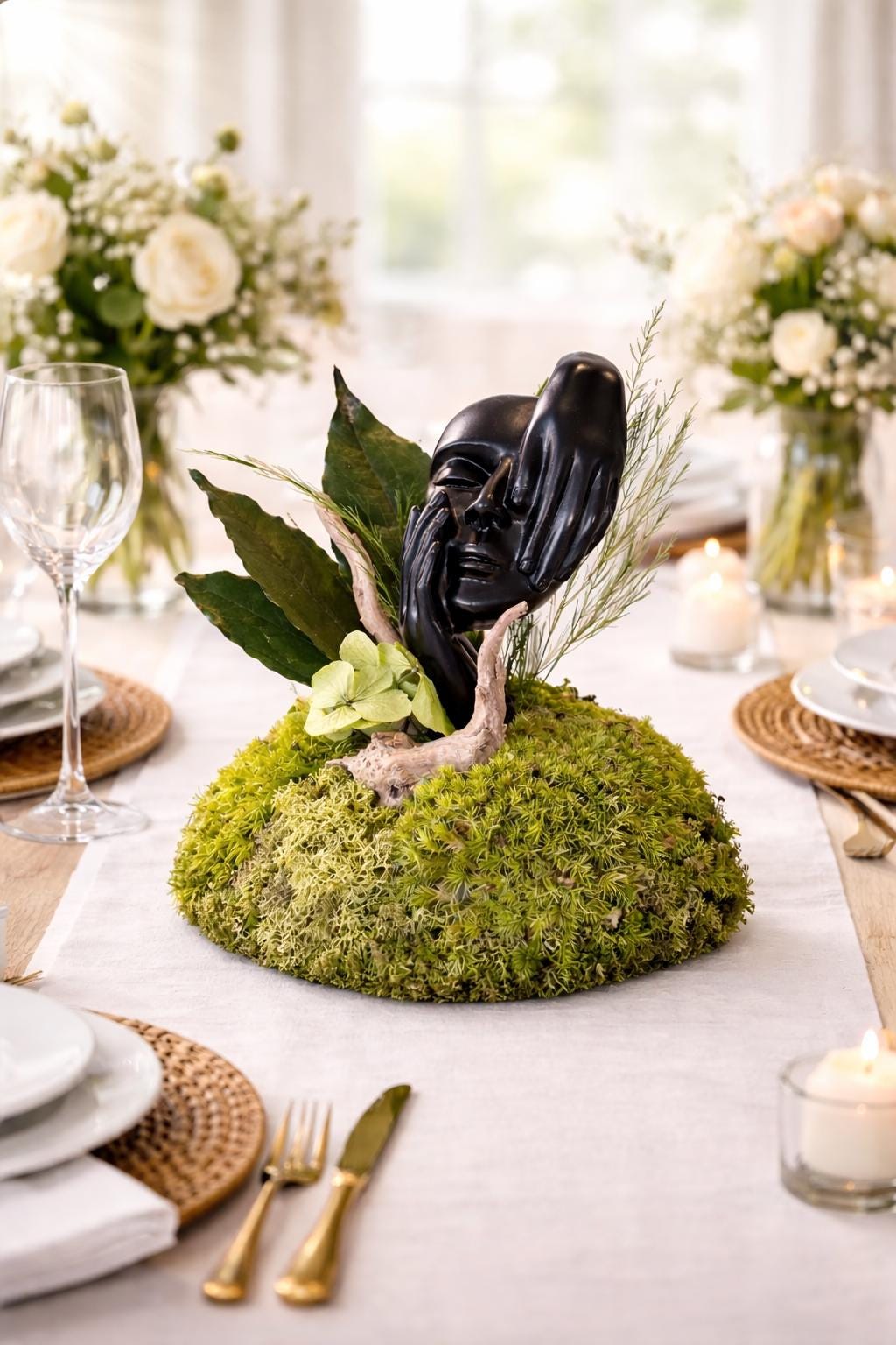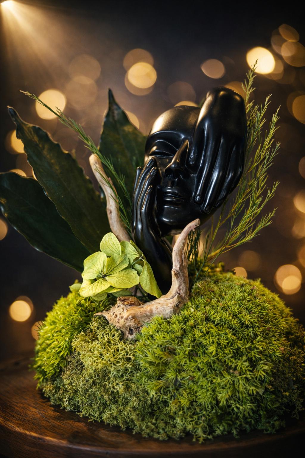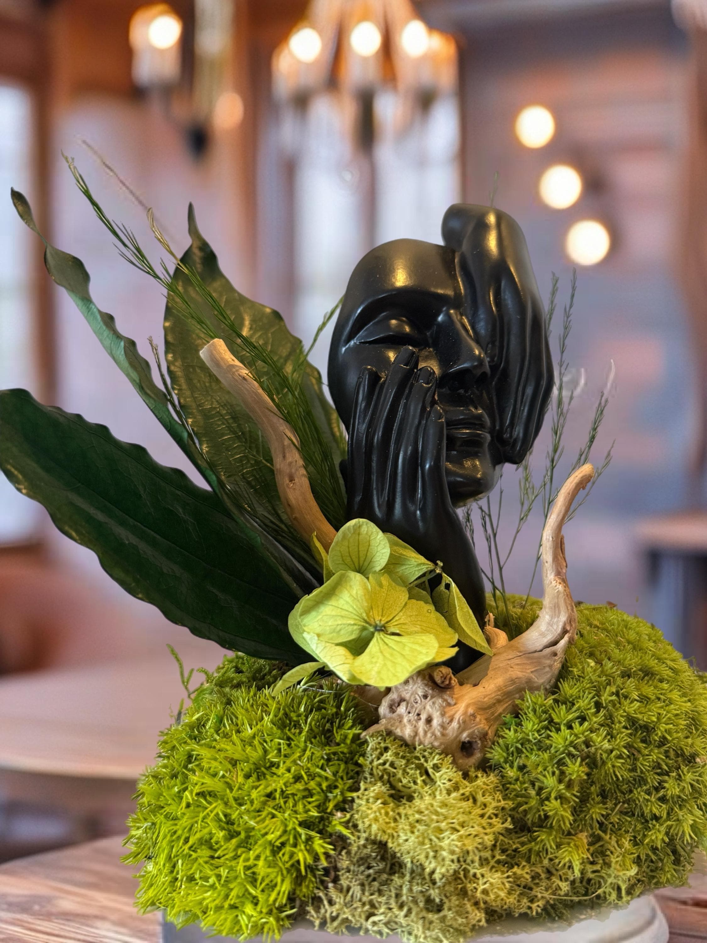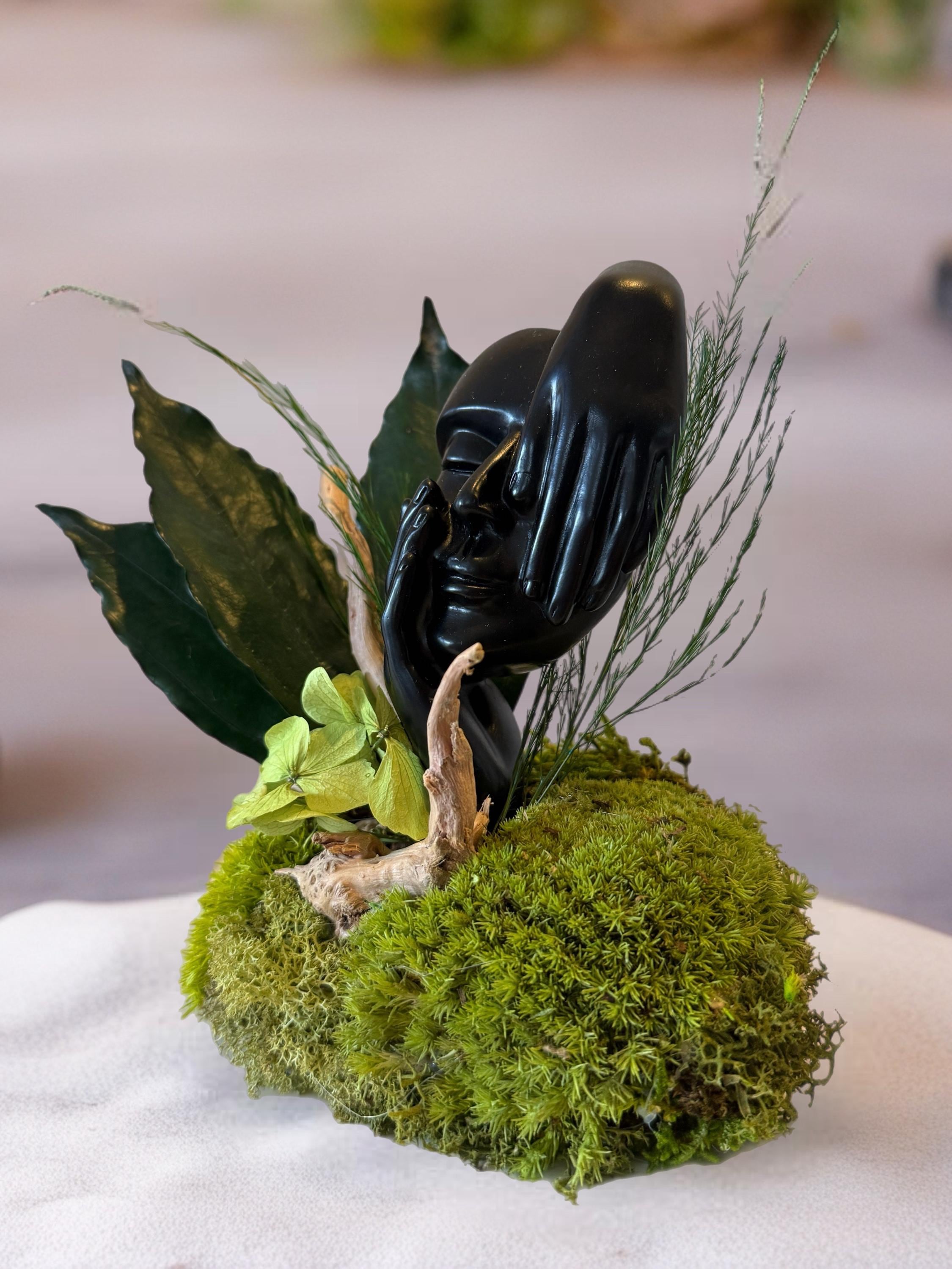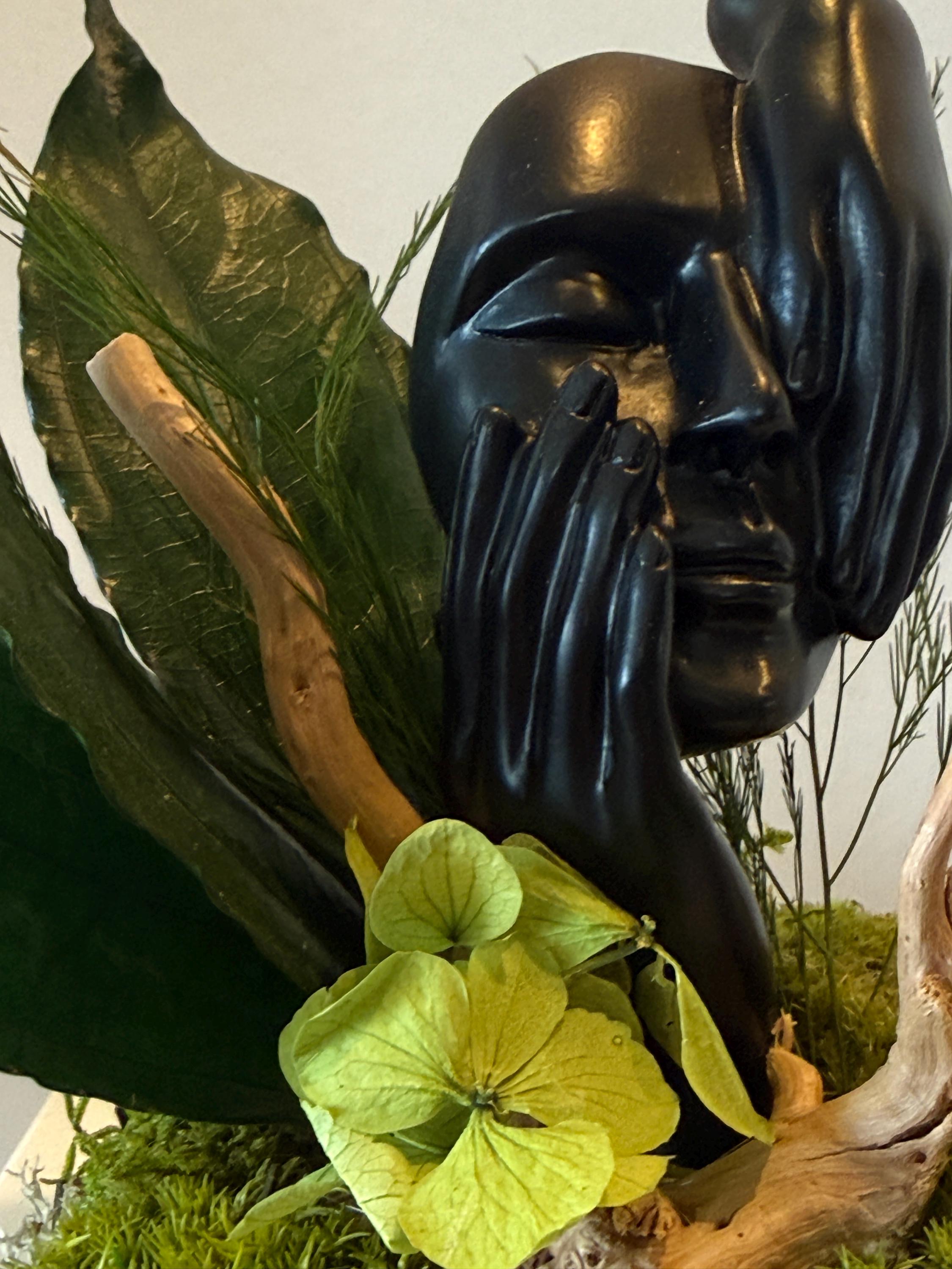 Elle associe une statue de visage contemporaine 🎭 à une composition de mousses et feuillages stabilisés 🌿, pour une décoration qui marie l’art et la nature.